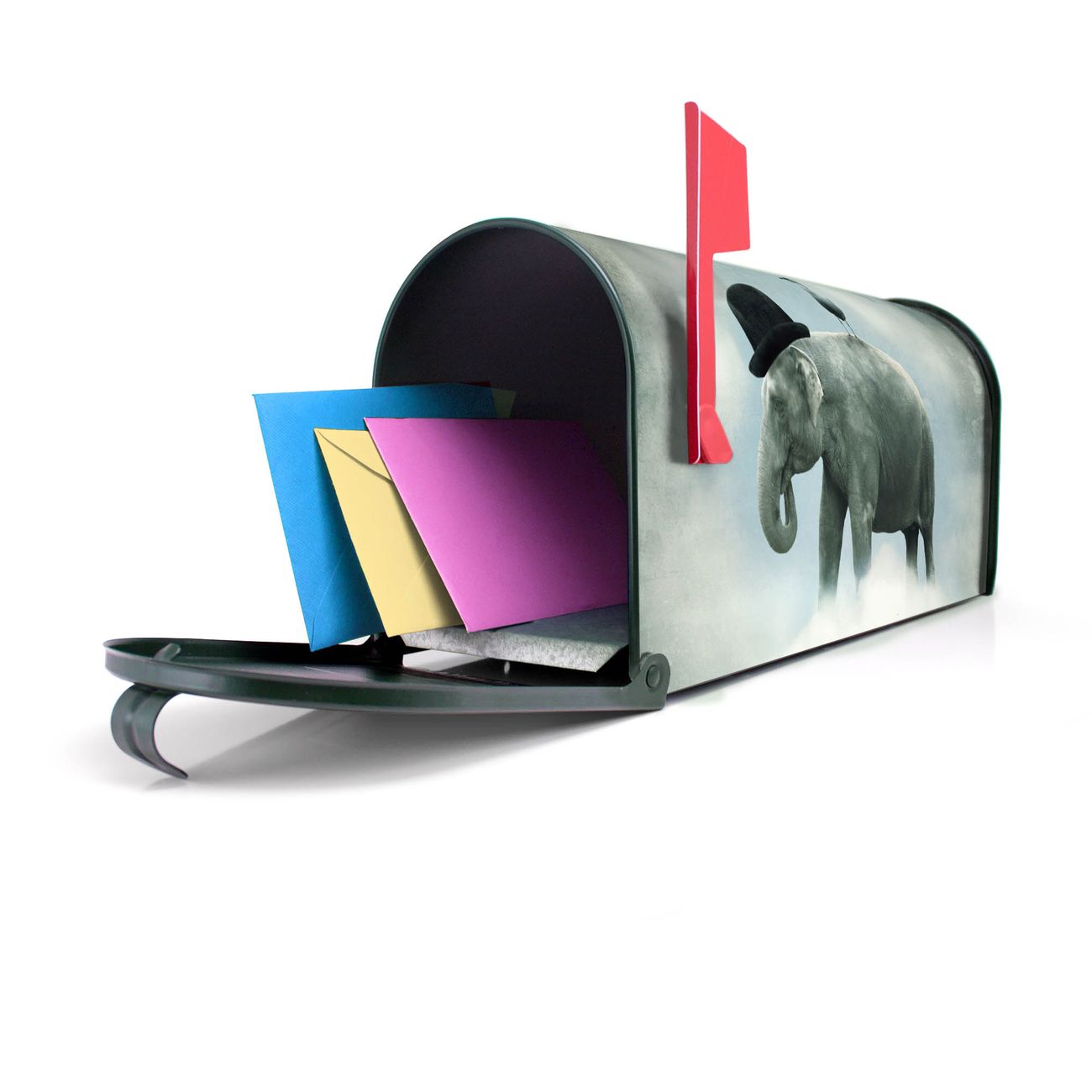 Unser amerikanischer Briefkasten mit dem Motiv Elefant und Möwe hat ein sehr ansprechendes und ausgefallenes Design, ist in der Grundfarbe weiß, grün oder schwarz erhältlich. Damit entlocken Sie Ihren Nachbarn und dem Postboten immer wieder ein Lächeln. Die Mailbox ist ein Original Import aus Mississippi USA und wird von unserer kleinen Manufaktur in Sachsen von Hand veredelt. Die US-Mailbox bietet ausreichend Platz auch für große Sendungen, eine Fahne die Ihnen Post anzeigt, wetterfestes und äußerst stabiles Material - so macht Post empfangen Freude.