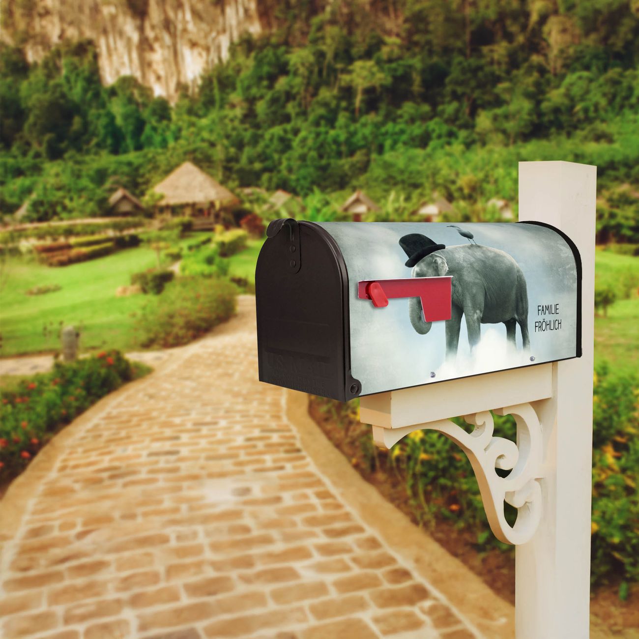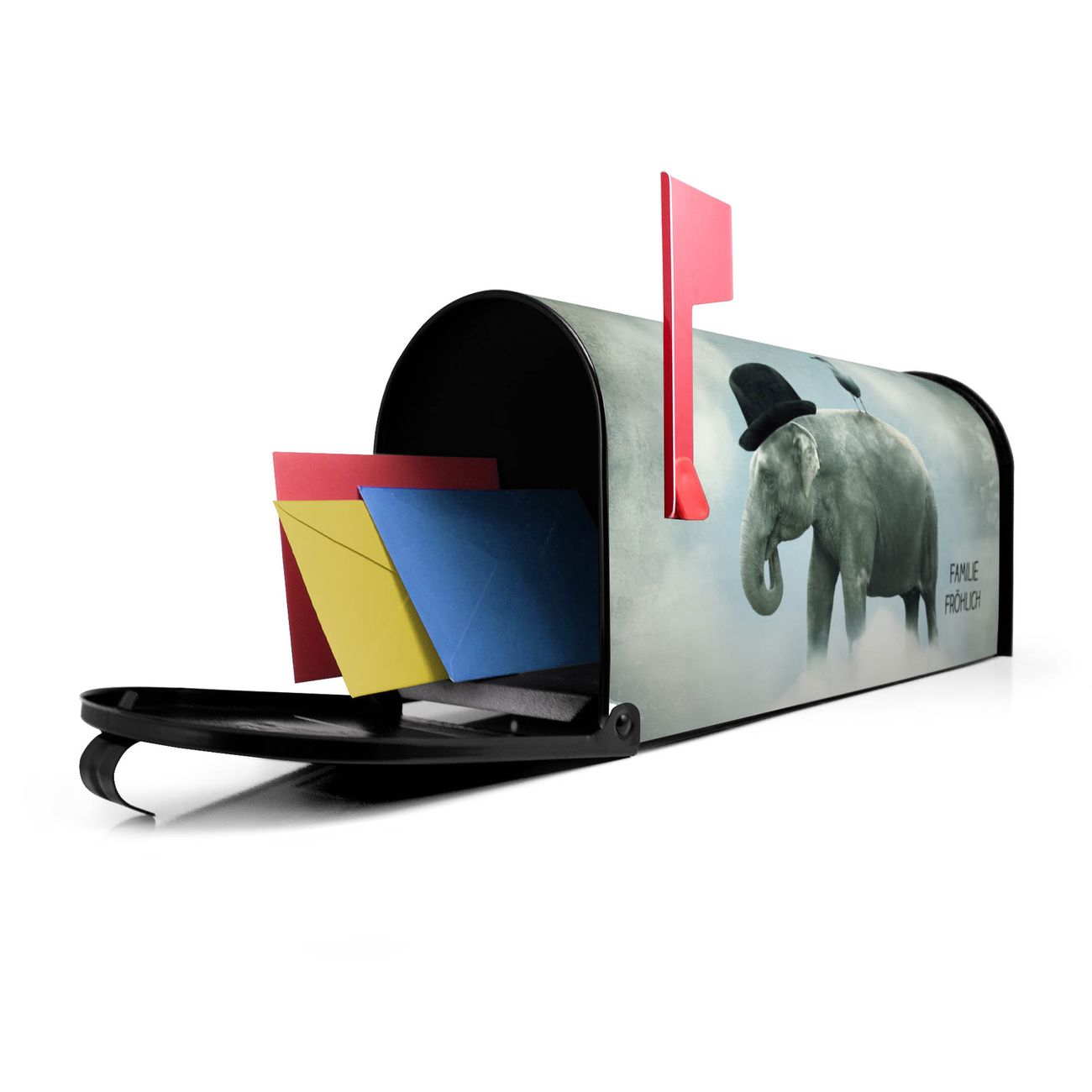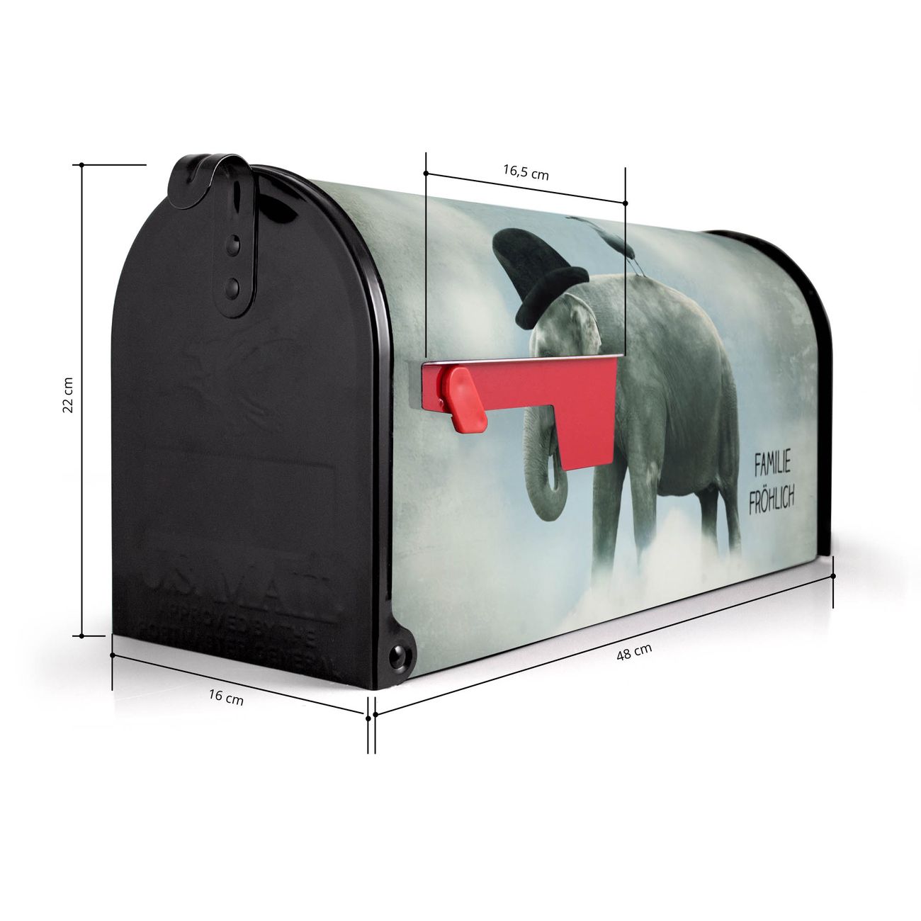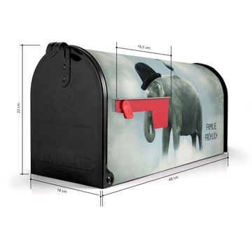 Der amerikanische Briefkasten von banjado mit Elefant und Möwe Motiv bietet Ihnen ausreichend Fassungsvermögen, um große A4 Sendungen und Zeitschriften zu empfangen. Die typisch amerikanische rote Fahne zeigt Ihnen an, wenn Sie Post erhalten haben. Die US-Mailbox besteht aus verzinktem Stahlblech welches lackiert wurde und ist 48 x 22 x 16 CM (BxHxT) groß. Die Folie mit Motiv Elefant und Möwe besteht aus einer wetter- und UV-resistenten Folie, die mit einem Schutzlaminat überzogen ist, sodass die US Mailbox zusätzlich vor Kratzern geschützt ist. An der Unterkante sind 4 Löcher je Seite um die Mailbox, typisch amerikanisch, an einem Holzpfahl oder einem Zaun zu befestigen. Auf Wunsch können Sie bei uns den passenden Standfuß oder die passende Wandhalterung kaufen um die US-Mailbox sicher zu befestigen. Wir bieten Ihnen ebenfalls Namensschilder, bereits beschriftet oder frei zu beschriften, und verschiedene selbst gestaltete Bitte-Keine-Werbung-Aufkleber.