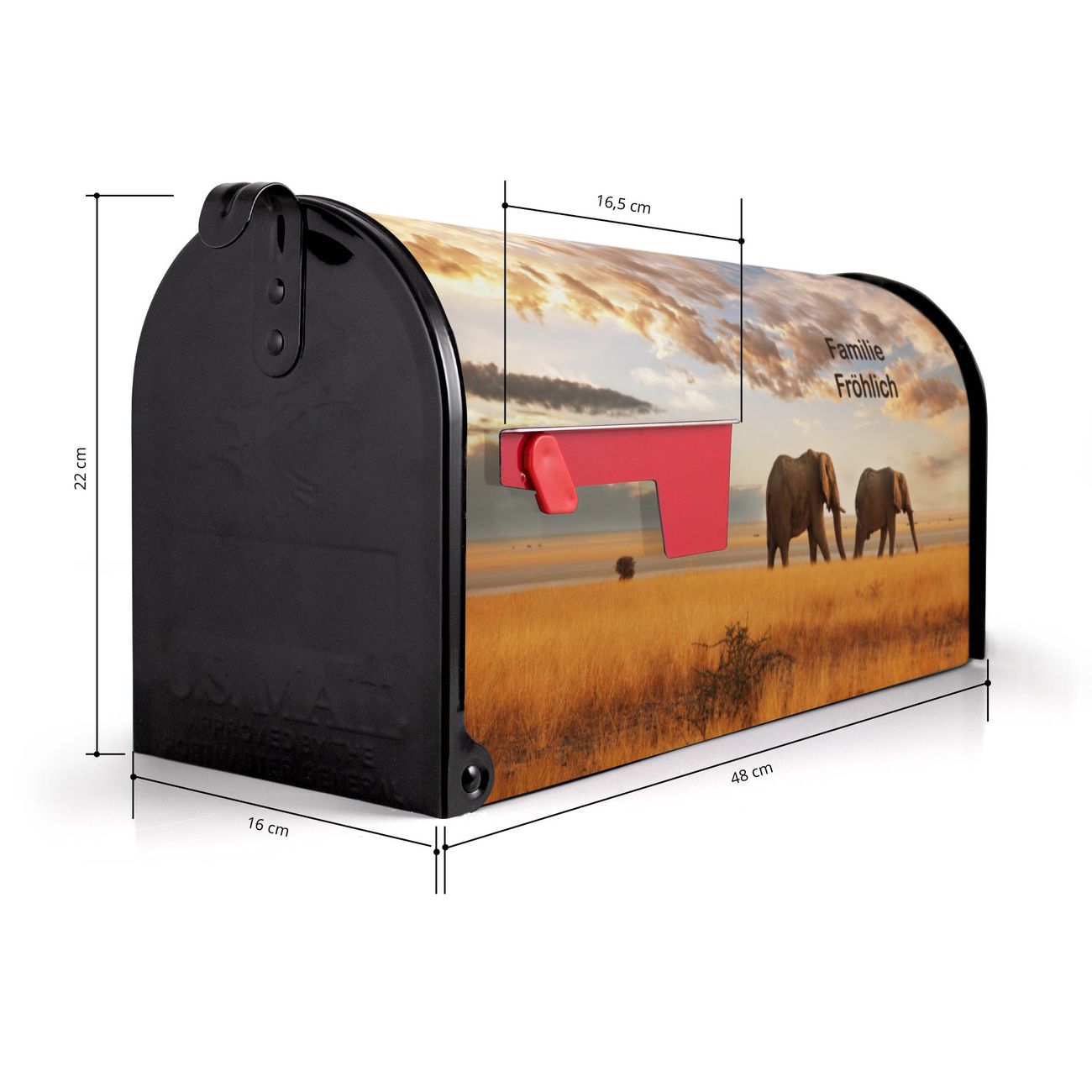 Der amerikanische Briefkasten von banjado mit Elefanten Motiv bietet Ihnen ausreichend Fassungsvermögen, um große A4 Sendungen und Zeitschriften zu empfangen. Die typisch amerikanische rote Fahne zeigt Ihnen an, wenn Sie Post erhalten haben. Die US-Mailbox besteht aus verzinktem Stahlblech welches lackiert wurde und ist 48 x 22 x 16 CM (BxHxT) groß. Die Folie mit Motiv Elefanten besteht aus einer wetter- und UV-resistenten Folie, die mit einem Schutzlaminat überzogen ist, sodass die US Mailbox zusätzlich vor Kratzern geschützt ist. An der Unterkante sind 4 Löcher je Seite um die Mailbox, typisch amerikanisch, an einem Holzpfahl oder einem Zaun zu befestigen. Auf Wunsch können Sie bei uns den passenden Standfuß oder die passende Wandhalterung kaufen um die US-Mailbox sicher zu befestigen. Wir bieten Ihnen ebenfalls Namensschilder, bereits beschriftet oder frei zu beschriften, und verschiedene selbst gestaltete Bitte-Keine-Werbung-Aufkleber.