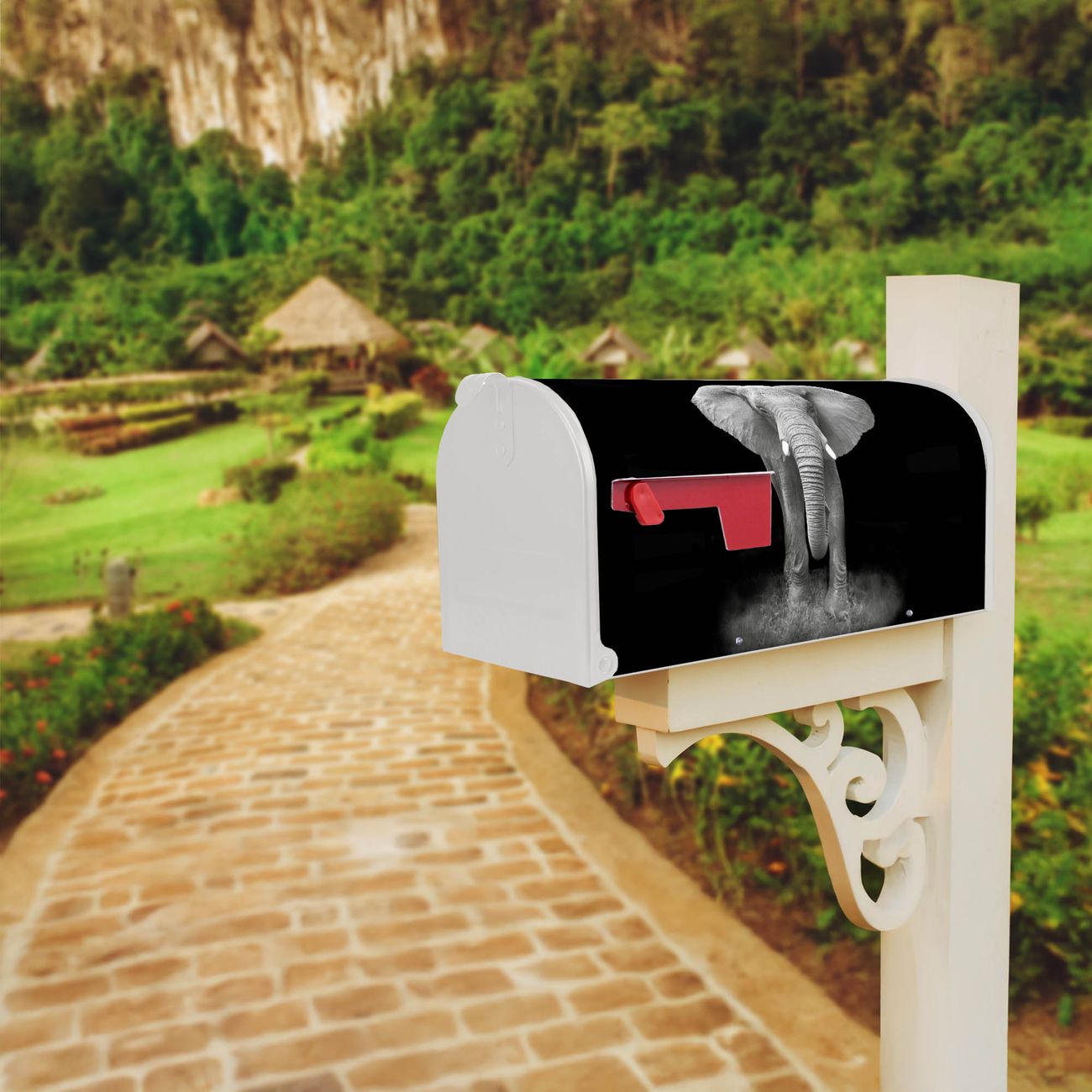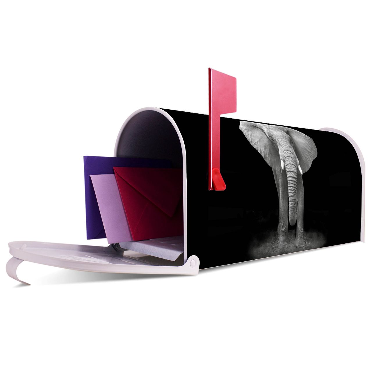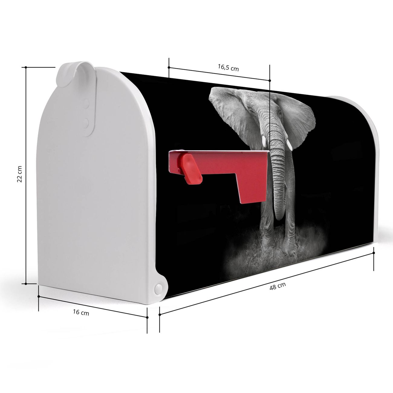 Der amerikanische Briefkasten von banjado mit Ella Motiv bietet Ihnen ausreichend Fassungsvermögen, um große A4 Sendungen und Zeitschriften zu empfangen. Die typisch amerikanische rote Fahne zeigt Ihnen an, wenn Sie Post erhalten haben. Die US-Mailbox besteht aus verzinktem Stahlblech welches lackiert wurde und ist 48 x 22 x 16 CM (BxHxT) groß. Die Folie mit Motiv Ella besteht aus einer wetter- und UV-resistenten Folie, die mit einem Schutzlaminat überzogen ist, sodass die US Mailbox zusätzlich vor Kratzern geschützt ist. An der Unterkante sind 4 Löcher je Seite um die Mailbox, typisch amerikanisch, an einem Holzpfahl oder einem Zaun zu befestigen. Auf Wunsch können Sie bei uns den passenden Standfuß oder die passende Wandhalterung kaufen um die US-Mailbox sicher zu befestigen. Wir bieten Ihnen ebenfalls Namensschilder, bereits beschriftet oder frei zu beschriften, und verschiedene selbst gestaltete Bitte-Keine-Werbung-Aufkleber.