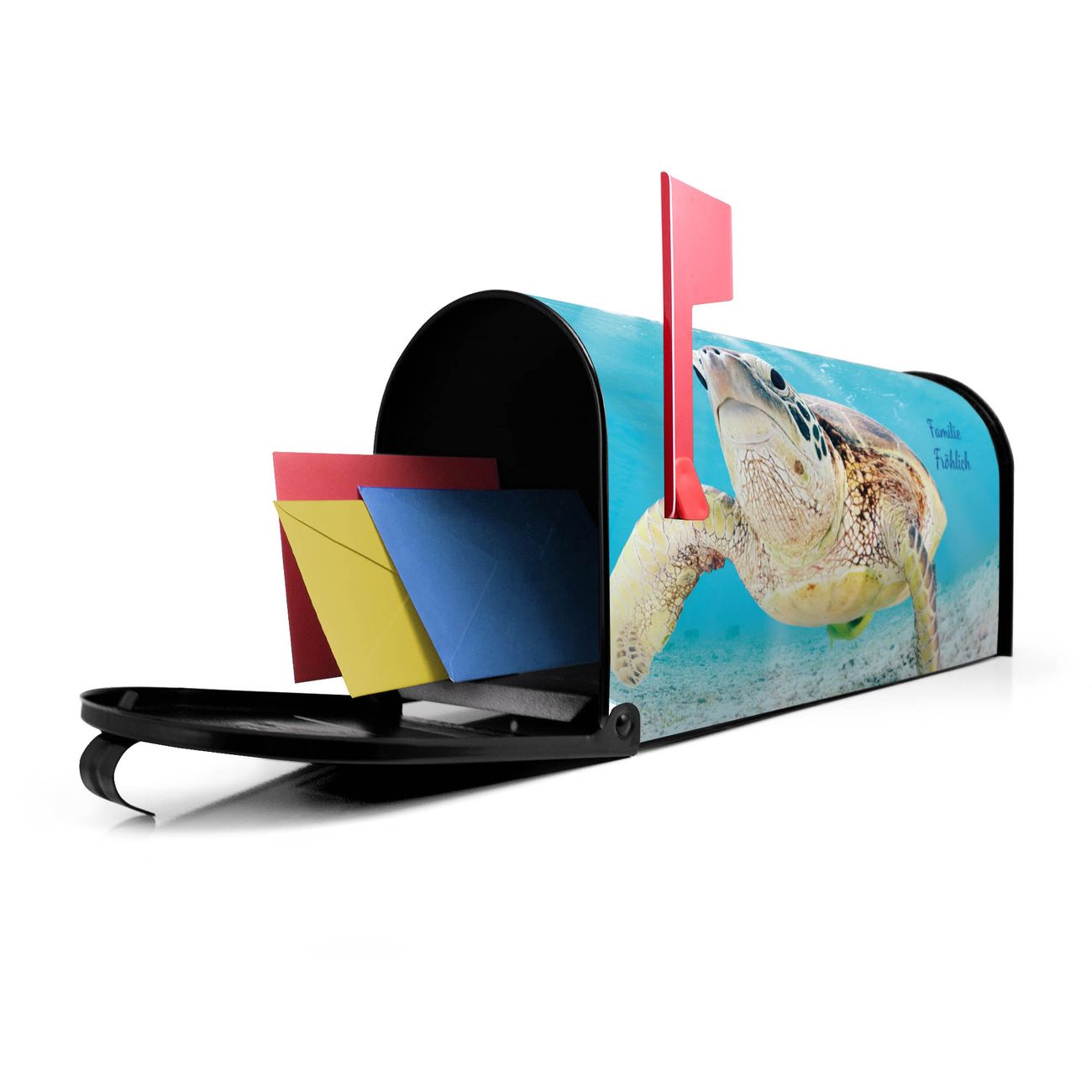 Der amerikanische Briefkasten von banjado mit Elvis Motiv bietet Ihnen ausreichend Fassungsvermögen, um große A4 Sendungen und Zeitschriften zu empfangen. Die typisch amerikanische rote Fahne zeigt Ihnen an, wenn Sie Post erhalten haben. Die US-Mailbox besteht aus verzinktem Stahlblech welches lackiert wurde und ist 48 x 22 x 16 CM (BxHxT) groß. Die Folie mit Motiv Elvis besteht aus einer wetter- und UV-resistenten Folie, die mit einem Schutzlaminat überzogen ist, sodass die US Mailbox zusätzlich vor Kratzern geschützt ist. An der Unterkante sind 4 Löcher je Seite um die Mailbox, typisch amerikanisch, an einem Holzpfahl oder einem Zaun zu befestigen. Auf Wunsch können Sie bei uns den passenden Standfuß oder die passende Wandhalterung kaufen um die US-Mailbox sicher zu befestigen. Wir bieten Ihnen ebenfalls Namensschilder, bereits beschriftet oder frei zu beschriften, und verschiedene selbst gestaltete Bitte-Keine-Werbung-Aufkleber.