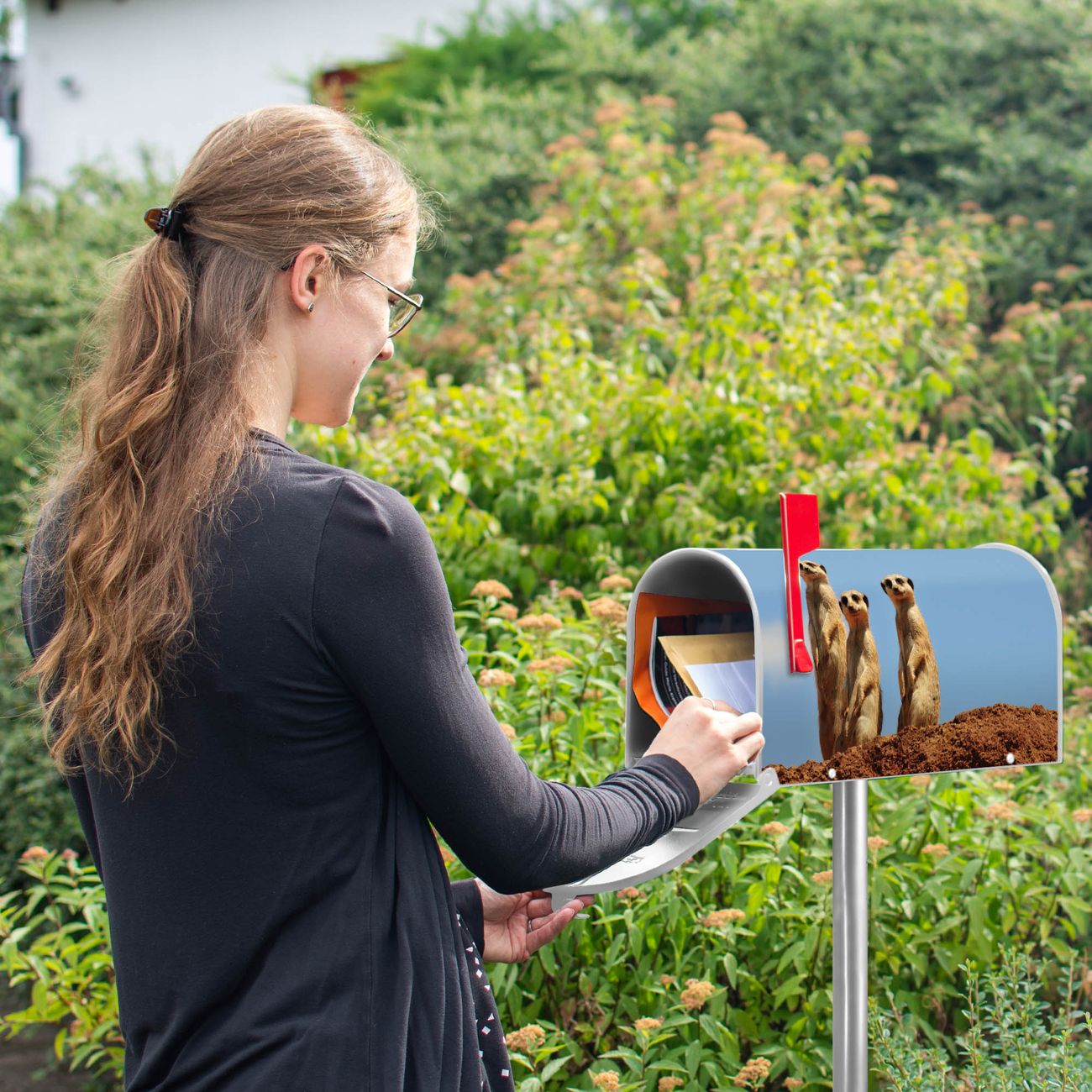 Unser amerikanischer Briefkasten mit dem Motiv Erdmännchenfamilie hat ein sehr ansprechendes und ausgefallenes Design, ist in der Grundfarbe weiß, grün oder schwarz erhältlich. Damit entlocken Sie Ihren Nachbarn und dem Postboten immer wieder ein Lächeln. Die Mailbox ist ein Original Import aus Mississippi USA und wird von unserer kleinen Manufaktur in Sachsen von Hand veredelt. Die US-Mailbox bietet ausreichend Platz auch für große Sendungen, eine Fahne die Ihnen Post anzeigt, wetterfestes und äußerst stabiles Material - so macht Post empfangen Freude.