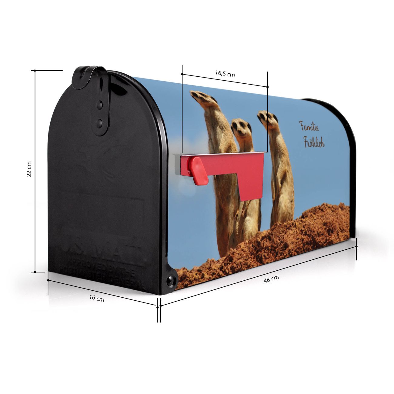 Der amerikanische Briefkasten von banjado mit Erdmännchenfamilie Motiv bietet Ihnen ausreichend Fassungsvermögen, um große A4 Sendungen und Zeitschriften zu empfangen. Die typisch amerikanische rote Fahne zeigt Ihnen an, wenn Sie Post erhalten haben. Die US-Mailbox besteht aus verzinktem Stahlblech welches lackiert wurde und ist 48 x 22 x 16 CM (BxHxT) groß. Die Folie mit Motiv Erdmännchenfamilie besteht aus einer wetter- und UV-resistenten Folie, die mit einem Schutzlaminat überzogen ist, sodass die US Mailbox zusätzlich vor Kratzern geschützt ist. An der Unterkante sind 4 Löcher je Seite um die Mailbox, typisch amerikanisch, an einem Holzpfahl oder einem Zaun zu befestigen. Auf Wunsch können Sie bei uns den passenden Standfuß oder die passende Wandhalterung kaufen um die US-Mailbox sicher zu befestigen. Wir bieten Ihnen ebenfalls Namensschilder, bereits beschriftet oder frei zu beschriften, und verschiedene selbst gestaltete Bitte-Keine-Werbung-Aufkleber.