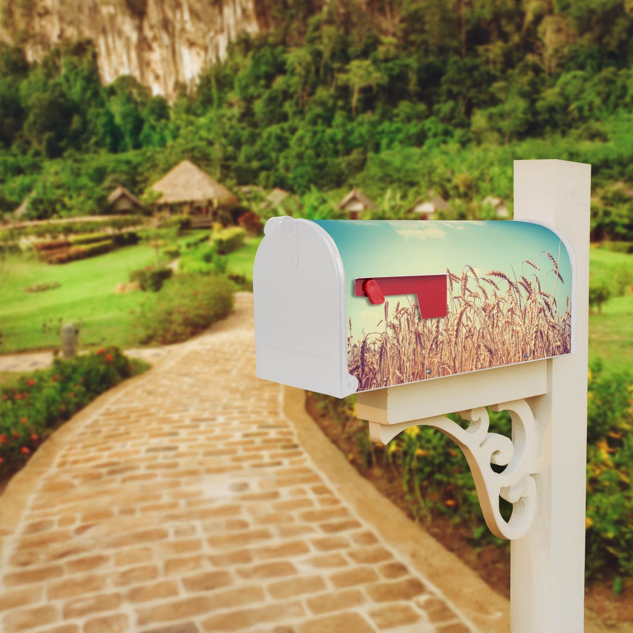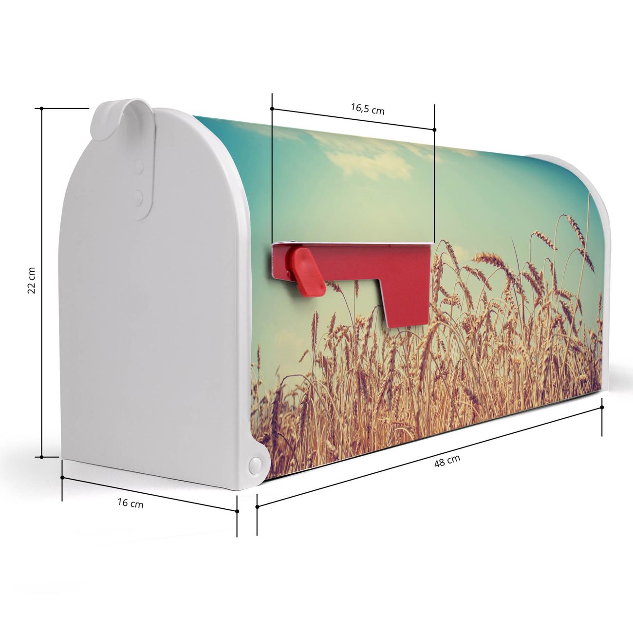 Der amerikanische Briefkasten von banjado mit Erntezeit Motiv bietet Ihnen ausreichend Fassungsvermögen, um große A4 Sendungen und Zeitschriften zu empfangen. Die typisch amerikanische rote Fahne zeigt Ihnen an, wenn Sie Post erhalten haben. Die US-Mailbox besteht aus verzinktem Stahlblech welches lackiert wurde und ist 48 x 22 x 16 CM (BxHxT) groß. Die Folie mit Motiv Erntezeit besteht aus einer wetter- und UV-resistenten Folie, die mit einem Schutzlaminat überzogen ist, sodass die US Mailbox zusätzlich vor Kratzern geschützt ist. An der Unterkante sind 4 Löcher je Seite um die Mailbox, typisch amerikanisch, an einem Holzpfahl oder einem Zaun zu befestigen. Auf Wunsch können Sie bei uns den passenden Standfuß oder die passende Wandhalterung kaufen um die US-Mailbox sicher zu befestigen. Wir bieten Ihnen ebenfalls Namensschilder, bereits beschriftet oder frei zu beschriften, und verschiedene selbst gestaltete Bitte-Keine-Werbung-Aufkleber.