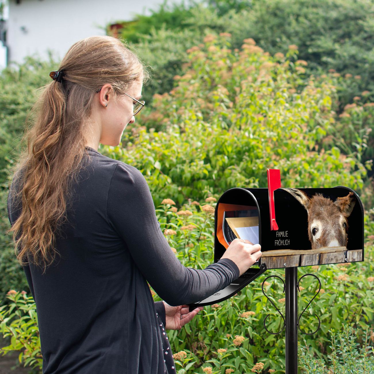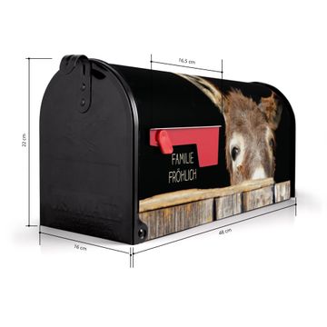 Der amerikanische Briefkasten von banjado mit Esel Motiv bietet Ihnen ausreichend Fassungsvermögen, um große A4 Sendungen und Zeitschriften zu empfangen. Die typisch amerikanische rote Fahne zeigt Ihnen an, wenn Sie Post erhalten haben. Die US-Mailbox besteht aus verzinktem Stahlblech welches lackiert wurde und ist 48 x 22 x 16 CM (BxHxT) groß. Die Folie mit Motiv Esel besteht aus einer wetter- und UV-resistenten Folie, die mit einem Schutzlaminat überzogen ist, sodass die US Mailbox zusätzlich vor Kratzern geschützt ist. An der Unterkante sind 4 Löcher je Seite um die Mailbox, typisch amerikanisch, an einem Holzpfahl oder einem Zaun zu befestigen. Auf Wunsch können Sie bei uns den passenden Standfuß oder die passende Wandhalterung kaufen um die US-Mailbox sicher zu befestigen. Wir bieten Ihnen ebenfalls Namensschilder, bereits beschriftet oder frei zu beschriften, und verschiedene selbst gestaltete Bitte-Keine-Werbung-Aufkleber.
