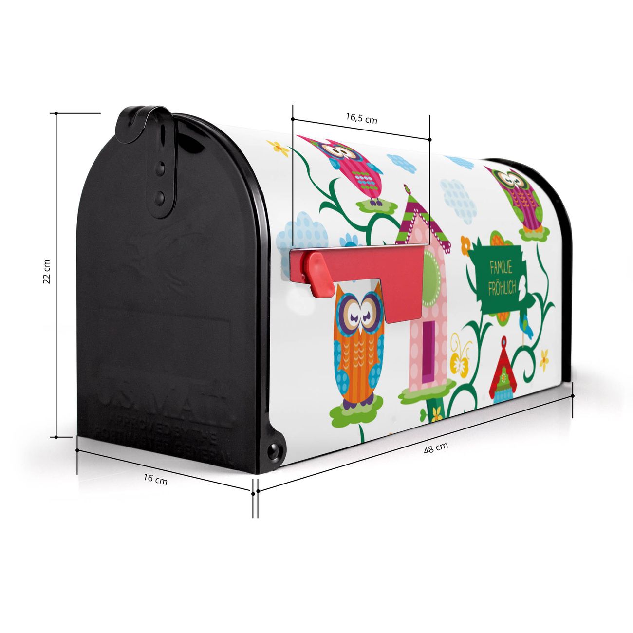 Der amerikanische Briefkasten von banjado mit Eulenfamilie Motiv bietet Ihnen ausreichend Fassungsvermögen, um große A4 Sendungen und Zeitschriften zu empfangen. Die typisch amerikanische rote Fahne zeigt Ihnen an, wenn Sie Post erhalten haben. Die US-Mailbox besteht aus verzinktem Stahlblech welches lackiert wurde und ist 48 x 22 x 16 CM (BxHxT) groß. Die Folie mit Motiv Eulenfamilie besteht aus einer wetter- und UV-resistenten Folie, die mit einem Schutzlaminat überzogen ist, sodass die US Mailbox zusätzlich vor Kratzern geschützt ist. An der Unterkante sind 4 Löcher je Seite um die Mailbox, typisch amerikanisch, an einem Holzpfahl oder einem Zaun zu befestigen. Auf Wunsch können Sie bei uns den passenden Standfuß oder die passende Wandhalterung kaufen um die US-Mailbox sicher zu befestigen. Wir bieten Ihnen ebenfalls Namensschilder, bereits beschriftet oder frei zu beschriften, und verschiedene selbst gestaltete Bitte-Keine-Werbung-Aufkleber.