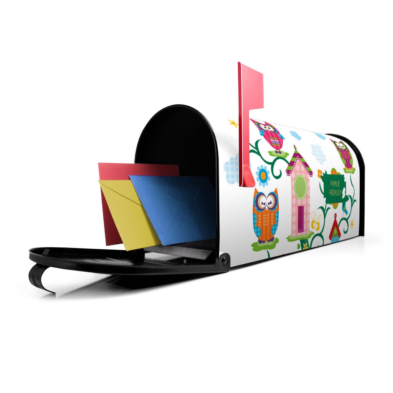 Unser amerikanischer Briefkasten mit dem Motiv Eulenfamilie hat ein sehr ansprechendes und ausgefallenes Design, ist in der Grundfarbe weiß, grün oder schwarz erhältlich. Damit entlocken Sie Ihren Nachbarn und dem Postboten immer wieder ein Lächeln. Die Mailbox ist ein Original Import aus Mississippi USA und wird von unserer kleinen Manufaktur in Sachsen von Hand veredelt. Die US-Mailbox bietet ausreichend Platz auch für große Sendungen, eine Fahne die Ihnen Post anzeigt, wetterfestes und äußerst stabiles Material - so macht Post empfangen Freude.
