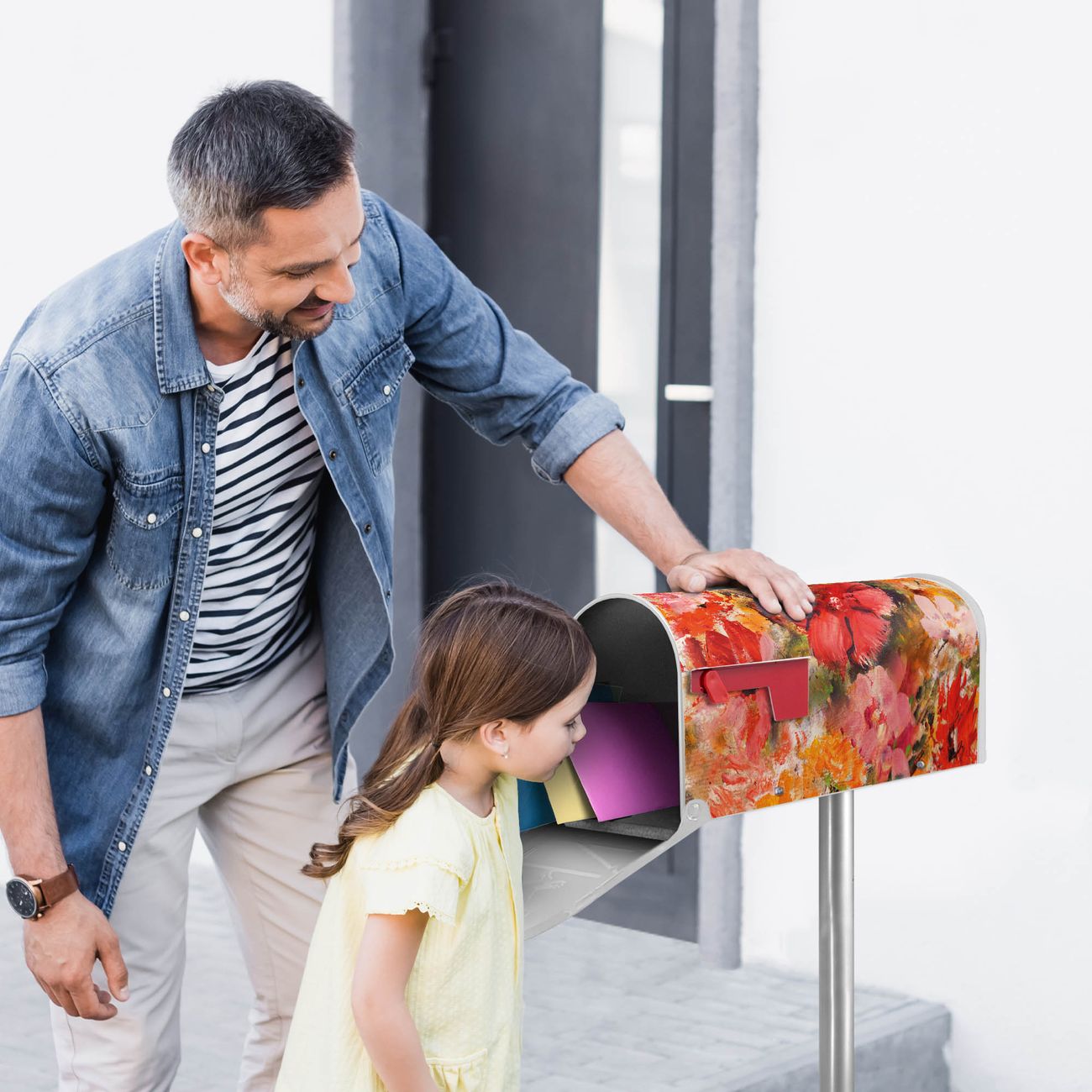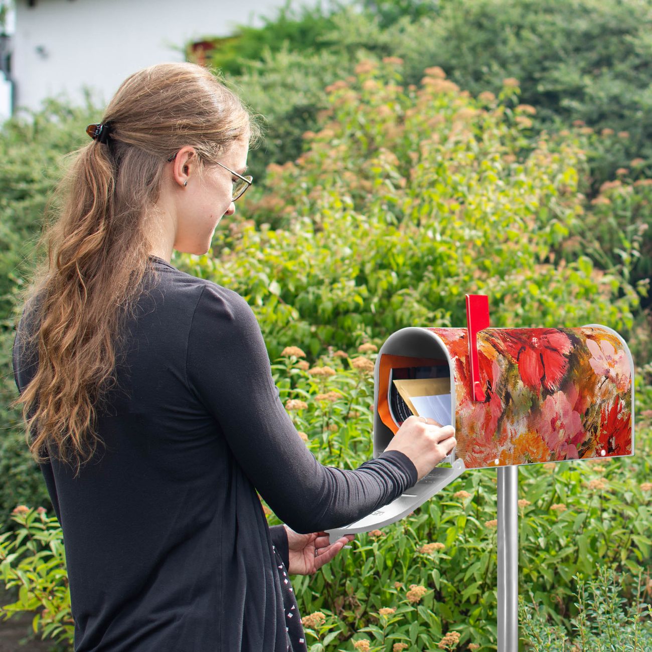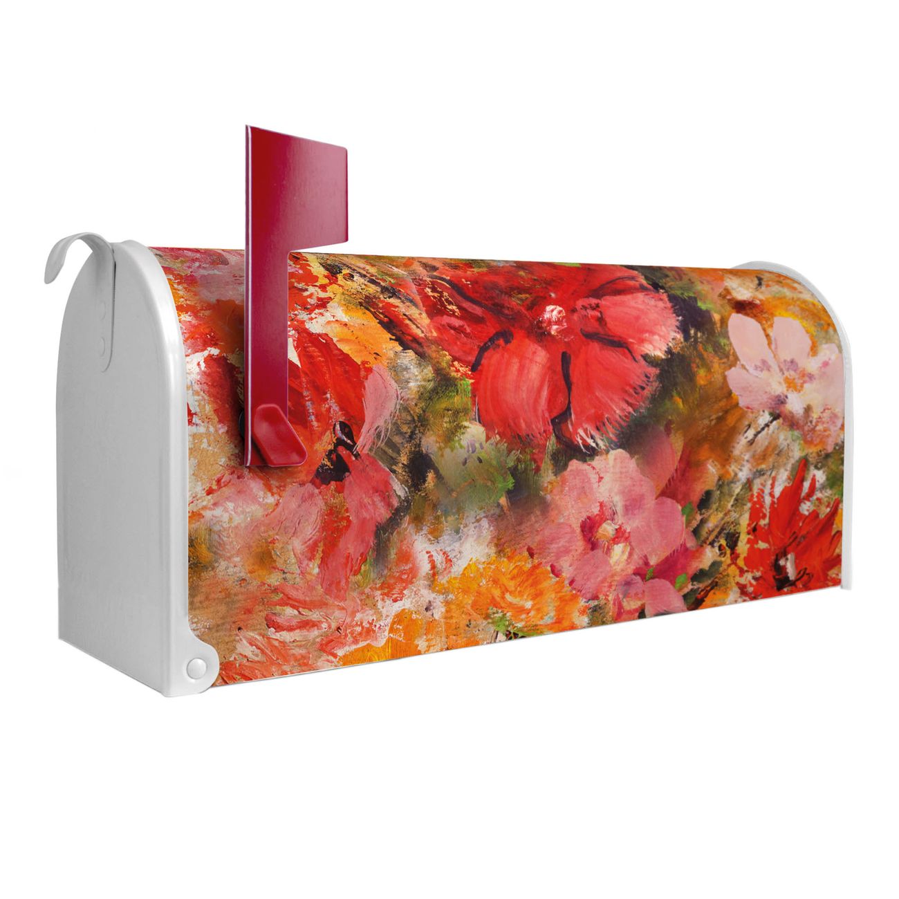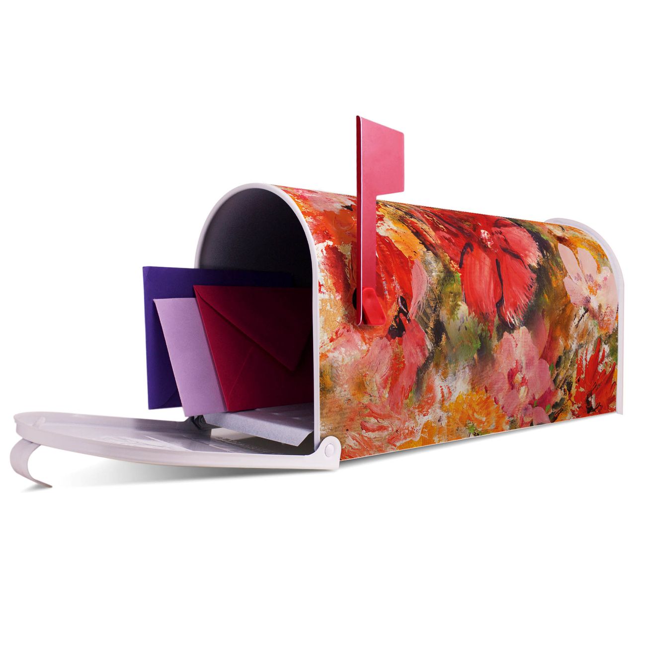Der amerikanische Briefkasten von banjado mit Fallende Blumen Motiv bietet Ihnen ausreichend Fassungsvermögen, um große A4 Sendungen und Zeitschriften zu empfangen. Die typisch amerikanische rote Fahne zeigt Ihnen an, wenn Sie Post erhalten haben. Die US-Mailbox besteht aus verzinktem Stahlblech welches lackiert wurde und ist 48 x 22 x 16 CM (BxHxT) groß. Die Folie mit Motiv Fallende Blumen besteht aus einer wetter- und UV-resistenten Folie, die mit einem Schutzlaminat überzogen ist, sodass die US Mailbox zusätzlich vor Kratzern geschützt ist. An der Unterkante sind 4 Löcher je Seite um die Mailbox, typisch amerikanisch, an einem Holzpfahl oder einem Zaun zu befestigen. Auf Wunsch können Sie bei uns den passenden Standfuß oder die passende Wandhalterung kaufen um die US-Mailbox sicher zu befestigen. Wir bieten Ihnen ebenfalls Namensschilder, bereits beschriftet oder frei zu beschriften, und verschiedene selbst gestaltete Bitte-Keine-Werbung-Aufkleber.