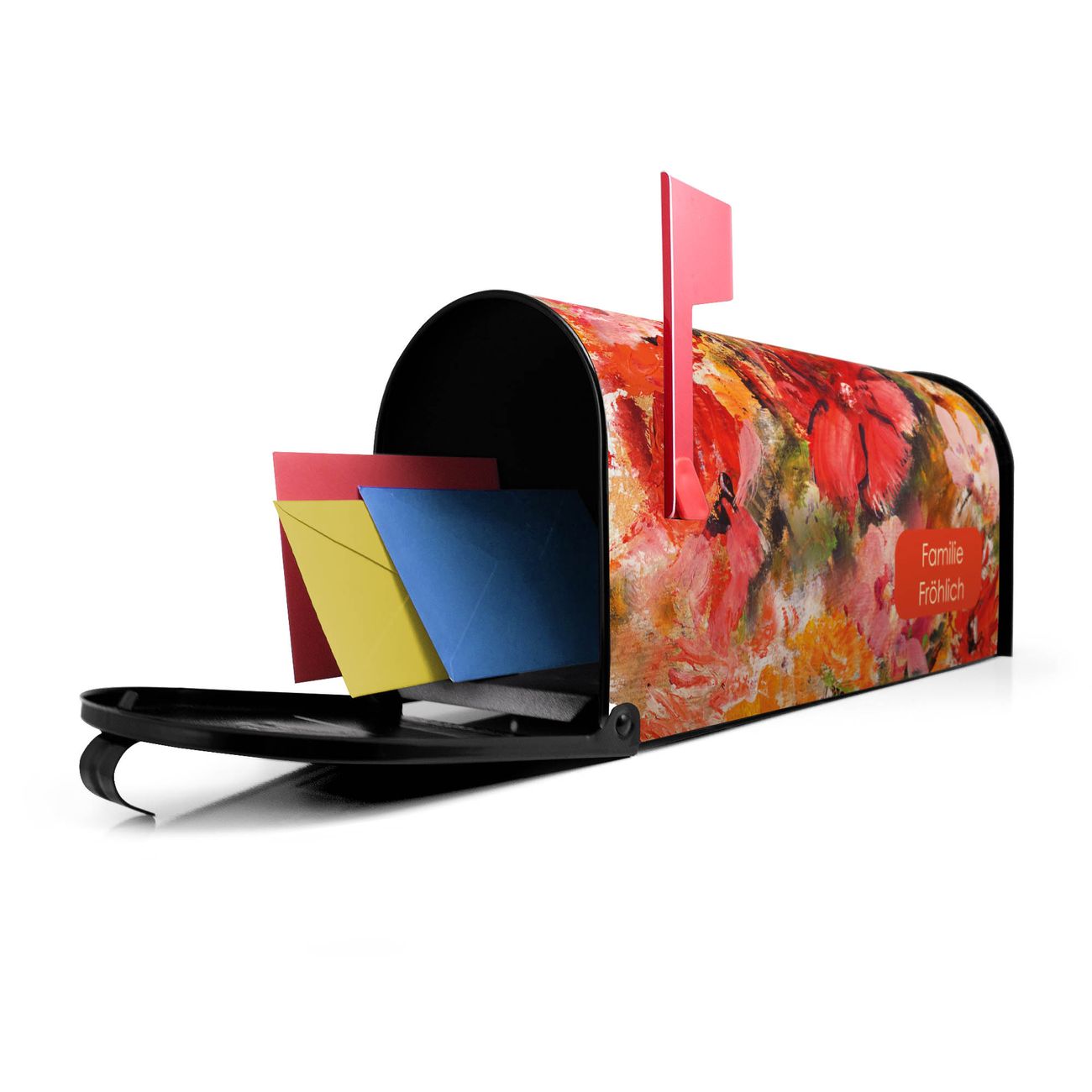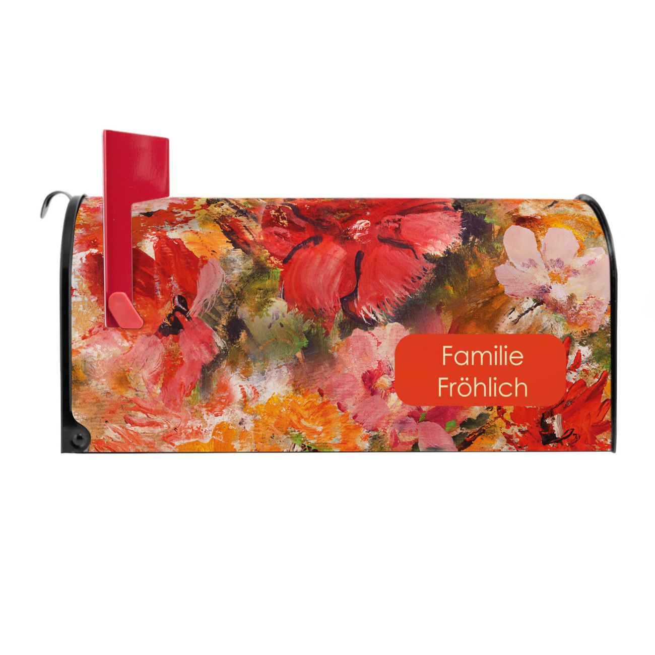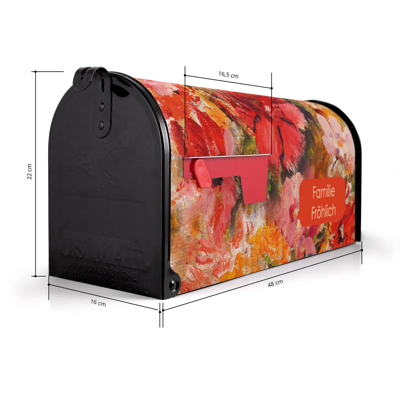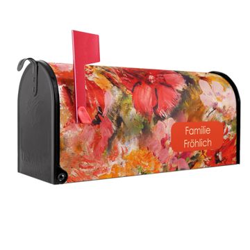 Der amerikanische Briefkasten von banjado mit Fallende Blumen Motiv bietet Ihnen ausreichend Fassungsvermögen, um große A4 Sendungen und Zeitschriften zu empfangen. Die typisch amerikanische rote Fahne zeigt Ihnen an, wenn Sie Post erhalten haben. Die US-Mailbox besteht aus verzinktem Stahlblech welches lackiert wurde und ist 48 x 22 x 16 CM (BxHxT) groß. Die Folie mit Motiv Fallende Blumen besteht aus einer wetter- und UV-resistenten Folie, die mit einem Schutzlaminat überzogen ist, sodass die US Mailbox zusätzlich vor Kratzern geschützt ist. An der Unterkante sind 4 Löcher je Seite um die Mailbox, typisch amerikanisch, an einem Holzpfahl oder einem Zaun zu befestigen. Auf Wunsch können Sie bei uns den passenden Standfuß oder die passende Wandhalterung kaufen um die US-Mailbox sicher zu befestigen. Wir bieten Ihnen ebenfalls Namensschilder, bereits beschriftet oder frei zu beschriften, und verschiedene selbst gestaltete Bitte-Keine-Werbung-Aufkleber.