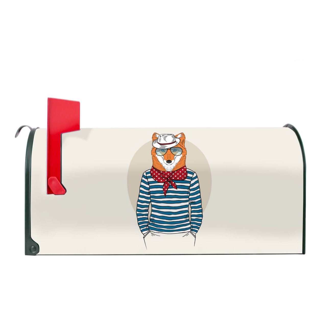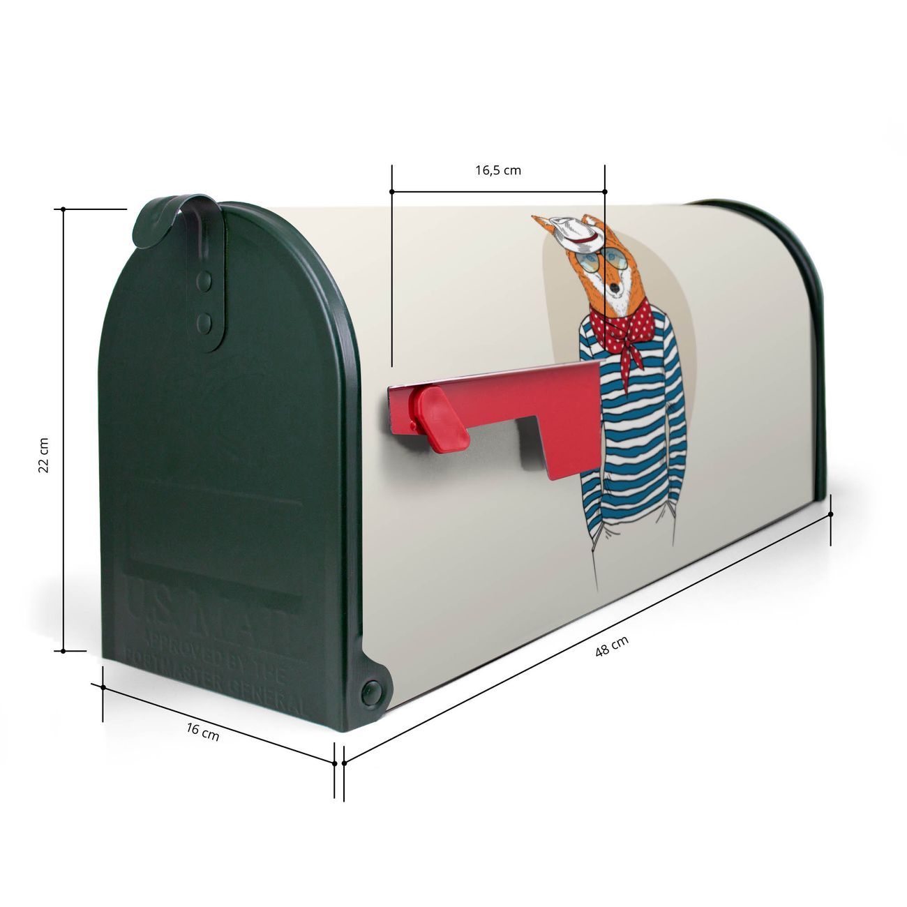 Der amerikanische Briefkasten von banjado mit Fancy Fox Motiv bietet Ihnen ausreichend Fassungsvermögen, um große A4 Sendungen und Zeitschriften zu empfangen. Die typisch amerikanische rote Fahne zeigt Ihnen an, wenn Sie Post erhalten haben. Die US-Mailbox besteht aus verzinktem Stahlblech welches lackiert wurde und ist 48 x 22 x 16 CM (BxHxT) groß. Die Folie mit Motiv Fancy Fox besteht aus einer wetter- und UV-resistenten Folie, die mit einem Schutzlaminat überzogen ist, sodass die US Mailbox zusätzlich vor Kratzern geschützt ist. An der Unterkante sind 4 Löcher je Seite um die Mailbox, typisch amerikanisch, an einem Holzpfahl oder einem Zaun zu befestigen. Auf Wunsch können Sie bei uns den passenden Standfuß oder die passende Wandhalterung kaufen um die US-Mailbox sicher zu befestigen. Wir bieten Ihnen ebenfalls Namensschilder, bereits beschriftet oder frei zu beschriften, und verschiedene selbst gestaltete Bitte-Keine-Werbung-Aufkleber.