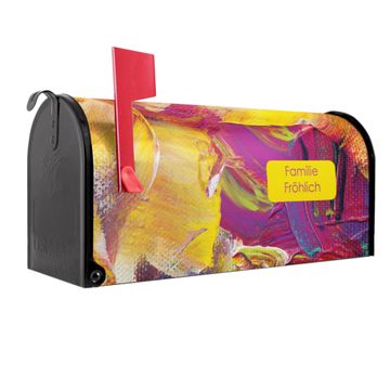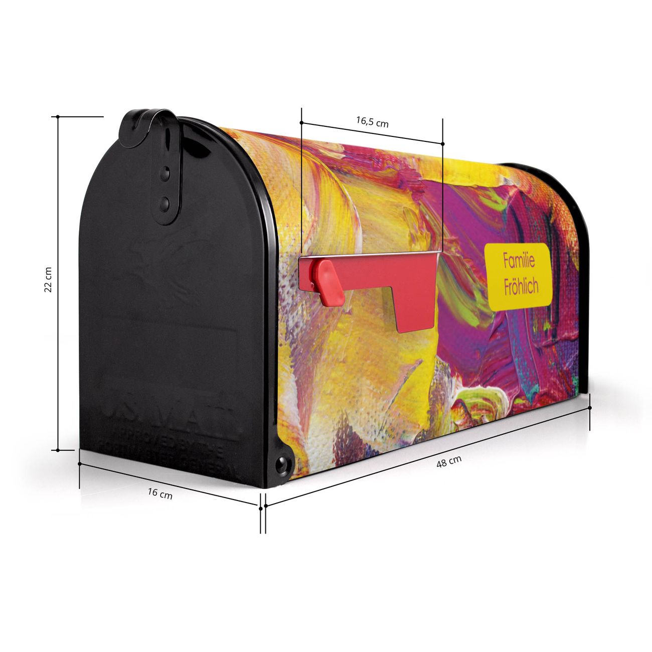 Der amerikanische Briefkasten von banjado mit Farbe auf Leinwand Motiv bietet Ihnen ausreichend Fassungsvermögen, um große A4 Sendungen und Zeitschriften zu empfangen. Die typisch amerikanische rote Fahne zeigt Ihnen an, wenn Sie Post erhalten haben. Die US-Mailbox besteht aus verzinktem Stahlblech welches lackiert wurde und ist 48 x 22 x 16 CM (BxHxT) groß. Die Folie mit Motiv Farbe auf Leinwand besteht aus einer wetter- und UV-resistenten Folie, die mit einem Schutzlaminat überzogen ist, sodass die US Mailbox zusätzlich vor Kratzern geschützt ist. An der Unterkante sind 4 Löcher je Seite um die Mailbox, typisch amerikanisch, an einem Holzpfahl oder einem Zaun zu befestigen. Auf Wunsch können Sie bei uns den passenden Standfuß oder die passende Wandhalterung kaufen um die US-Mailbox sicher zu befestigen. Wir bieten Ihnen ebenfalls Namensschilder, bereits beschriftet oder frei zu beschriften, und verschiedene selbst gestaltete Bitte-Keine-Werbung-Aufkleber.