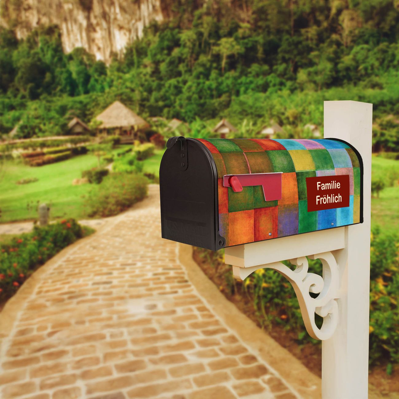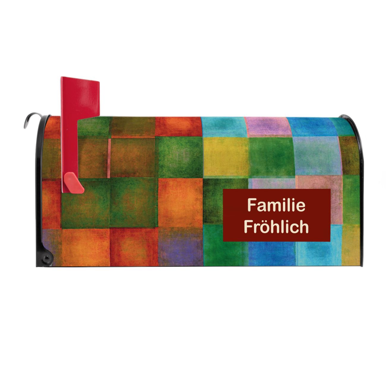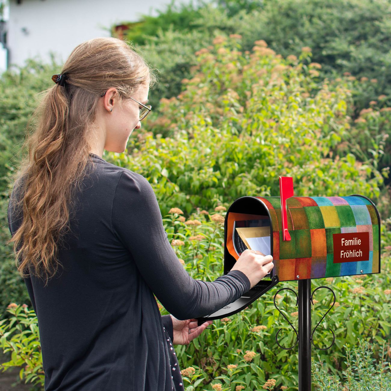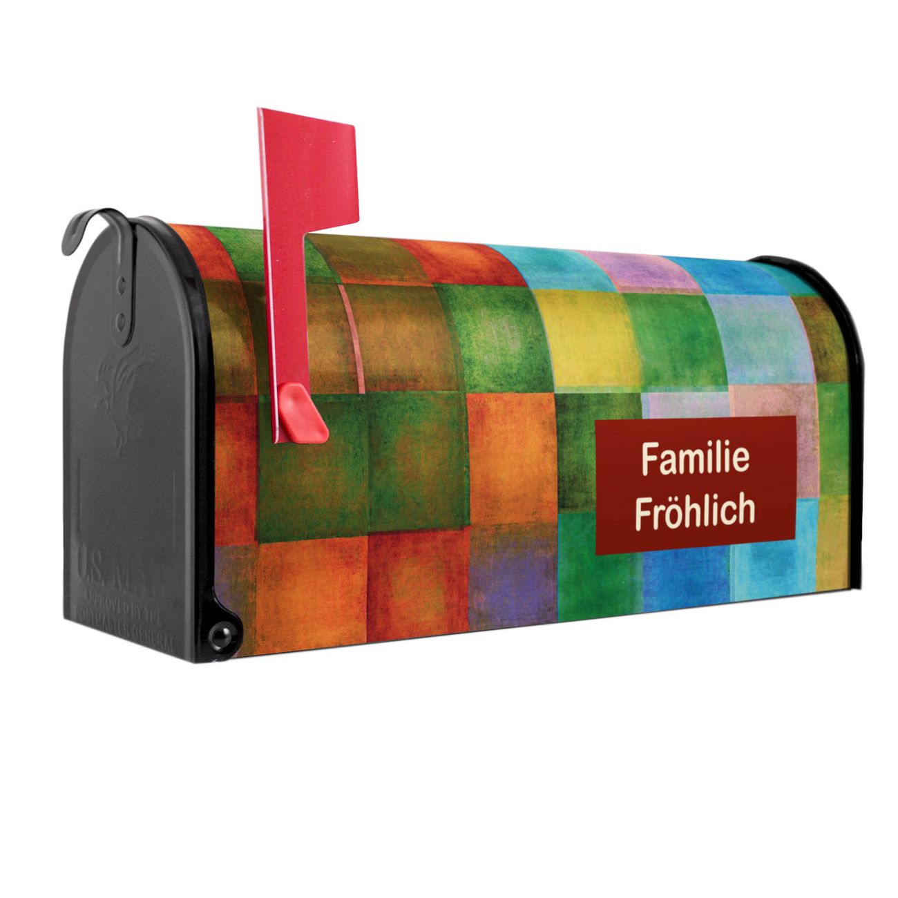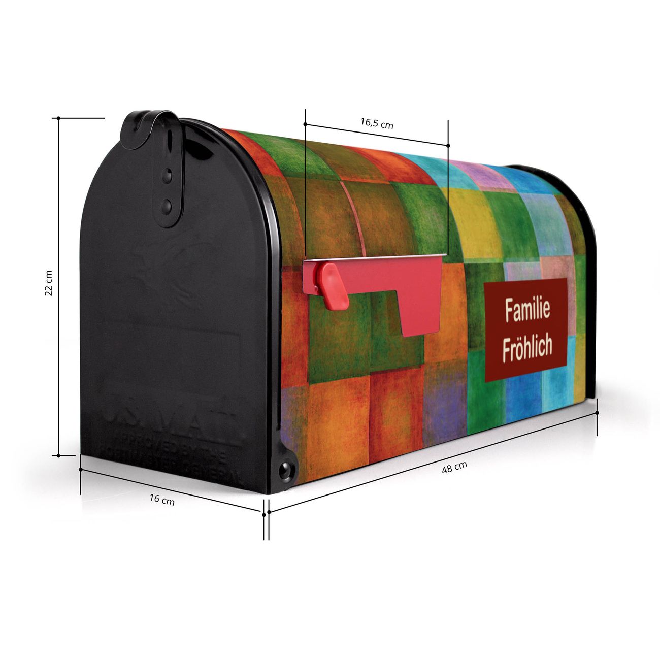 Der amerikanische Briefkasten von banjado mit Farbkasten 2 Motiv bietet Ihnen ausreichend Fassungsvermögen, um große A4 Sendungen und Zeitschriften zu empfangen. Die typisch amerikanische rote Fahne zeigt Ihnen an, wenn Sie Post erhalten haben. Die US-Mailbox besteht aus verzinktem Stahlblech welches lackiert wurde und ist 48 x 22 x 16 CM (BxHxT) groß. Die Folie mit Motiv Farbkasten 2 besteht aus einer wetter- und UV-resistenten Folie, die mit einem Schutzlaminat überzogen ist, sodass die US Mailbox zusätzlich vor Kratzern geschützt ist. An der Unterkante sind 4 Löcher je Seite um die Mailbox, typisch amerikanisch, an einem Holzpfahl oder einem Zaun zu befestigen. Auf Wunsch können Sie bei uns den passenden Standfuß oder die passende Wandhalterung kaufen um die US-Mailbox sicher zu befestigen. Wir bieten Ihnen ebenfalls Namensschilder, bereits beschriftet oder frei zu beschriften, und verschiedene selbst gestaltete Bitte-Keine-Werbung-Aufkleber.