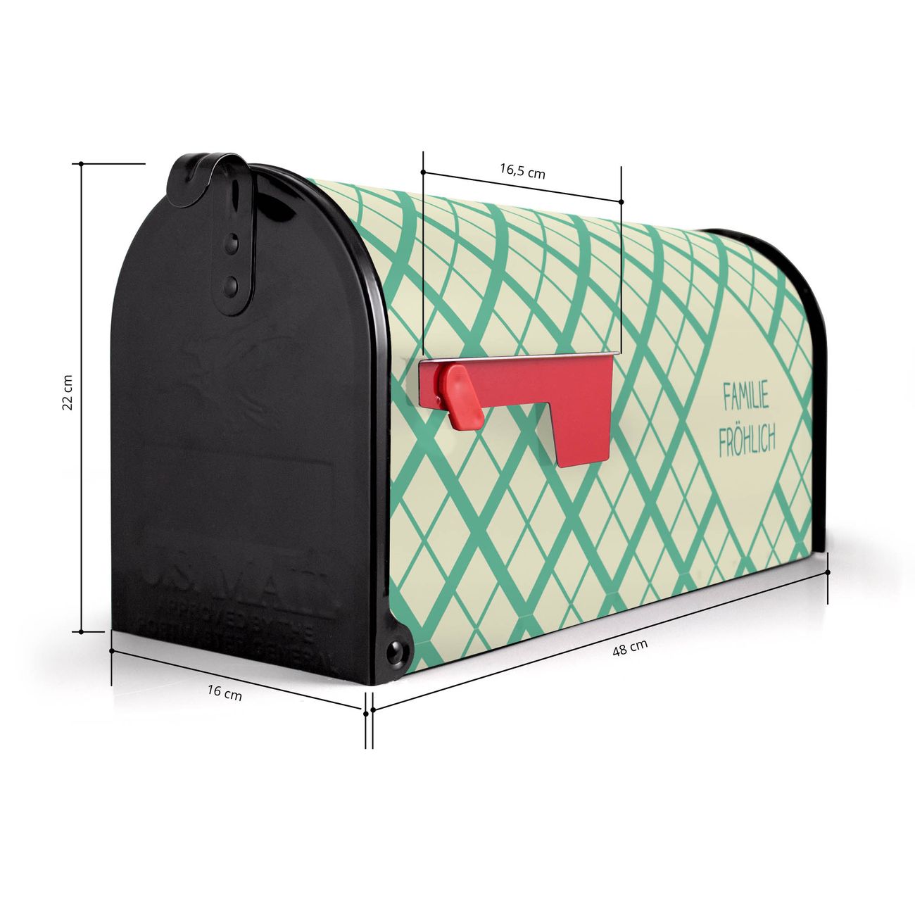 Der amerikanische Briefkasten von banjado mit Feines Rautenmuster Motiv bietet Ihnen ausreichend Fassungsvermögen, um große A4 Sendungen und Zeitschriften zu empfangen. Die typisch amerikanische rote Fahne zeigt Ihnen an, wenn Sie Post erhalten haben. Die US-Mailbox besteht aus verzinktem Stahlblech welches lackiert wurde und ist 48 x 22 x 16 CM (BxHxT) groß. Die Folie mit Motiv Feines Rautenmuster besteht aus einer wetter- und UV-resistenten Folie, die mit einem Schutzlaminat überzogen ist, sodass die US Mailbox zusätzlich vor Kratzern geschützt ist. An der Unterkante sind 4 Löcher je Seite um die Mailbox, typisch amerikanisch, an einem Holzpfahl oder einem Zaun zu befestigen. Auf Wunsch können Sie bei uns den passenden Standfuß oder die passende Wandhalterung kaufen um die US-Mailbox sicher zu befestigen. Wir bieten Ihnen ebenfalls Namensschilder, bereits beschriftet oder frei zu beschriften, und verschiedene selbst gestaltete Bitte-Keine-Werbung-Aufkleber.