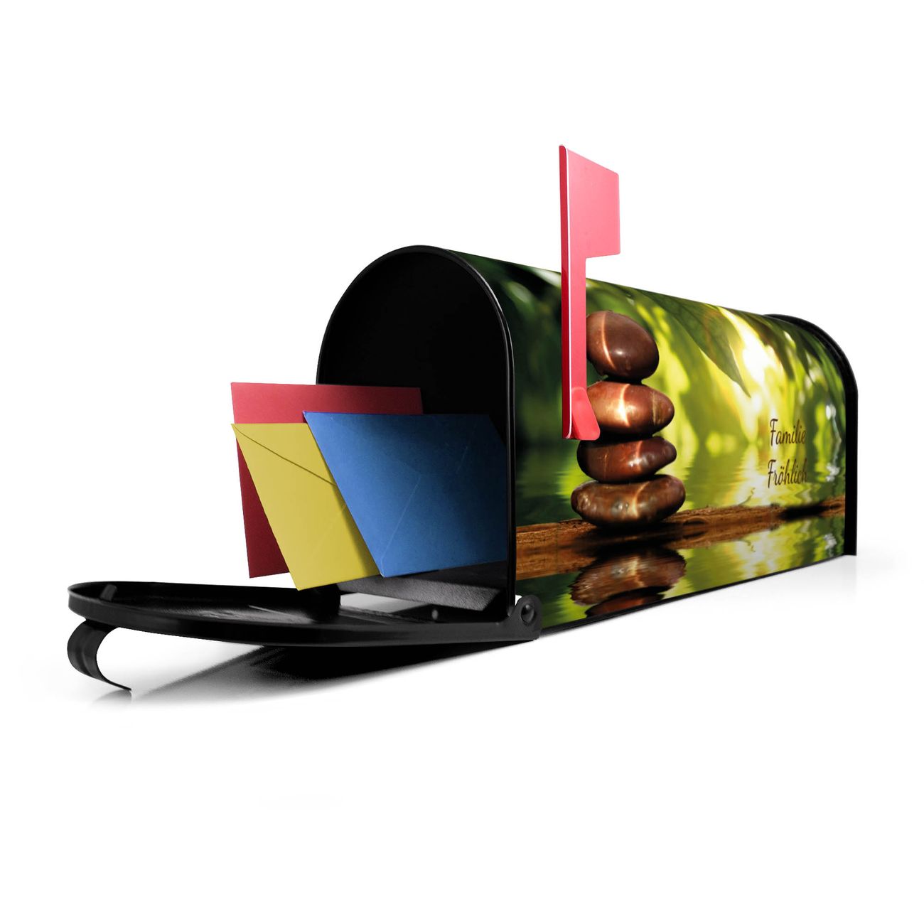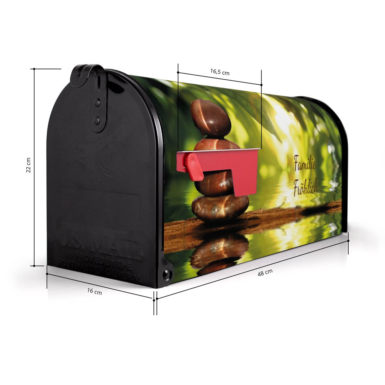 Der amerikanische Briefkasten von banjado mit Feng Shui Motiv bietet Ihnen ausreichend Fassungsvermögen, um große A4 Sendungen und Zeitschriften zu empfangen. Die typisch amerikanische rote Fahne zeigt Ihnen an, wenn Sie Post erhalten haben. Die US-Mailbox besteht aus verzinktem Stahlblech welches lackiert wurde und ist 48 x 22 x 16 CM (BxHxT) groß. Die Folie mit Motiv Feng Shui besteht aus einer wetter- und UV-resistenten Folie, die mit einem Schutzlaminat überzogen ist, sodass die US Mailbox zusätzlich vor Kratzern geschützt ist. An der Unterkante sind 4 Löcher je Seite um die Mailbox, typisch amerikanisch, an einem Holzpfahl oder einem Zaun zu befestigen. Auf Wunsch können Sie bei uns den passenden Standfuß oder die passende Wandhalterung kaufen um die US-Mailbox sicher zu befestigen. Wir bieten Ihnen ebenfalls Namensschilder, bereits beschriftet oder frei zu beschriften, und verschiedene selbst gestaltete Bitte-Keine-Werbung-Aufkleber.