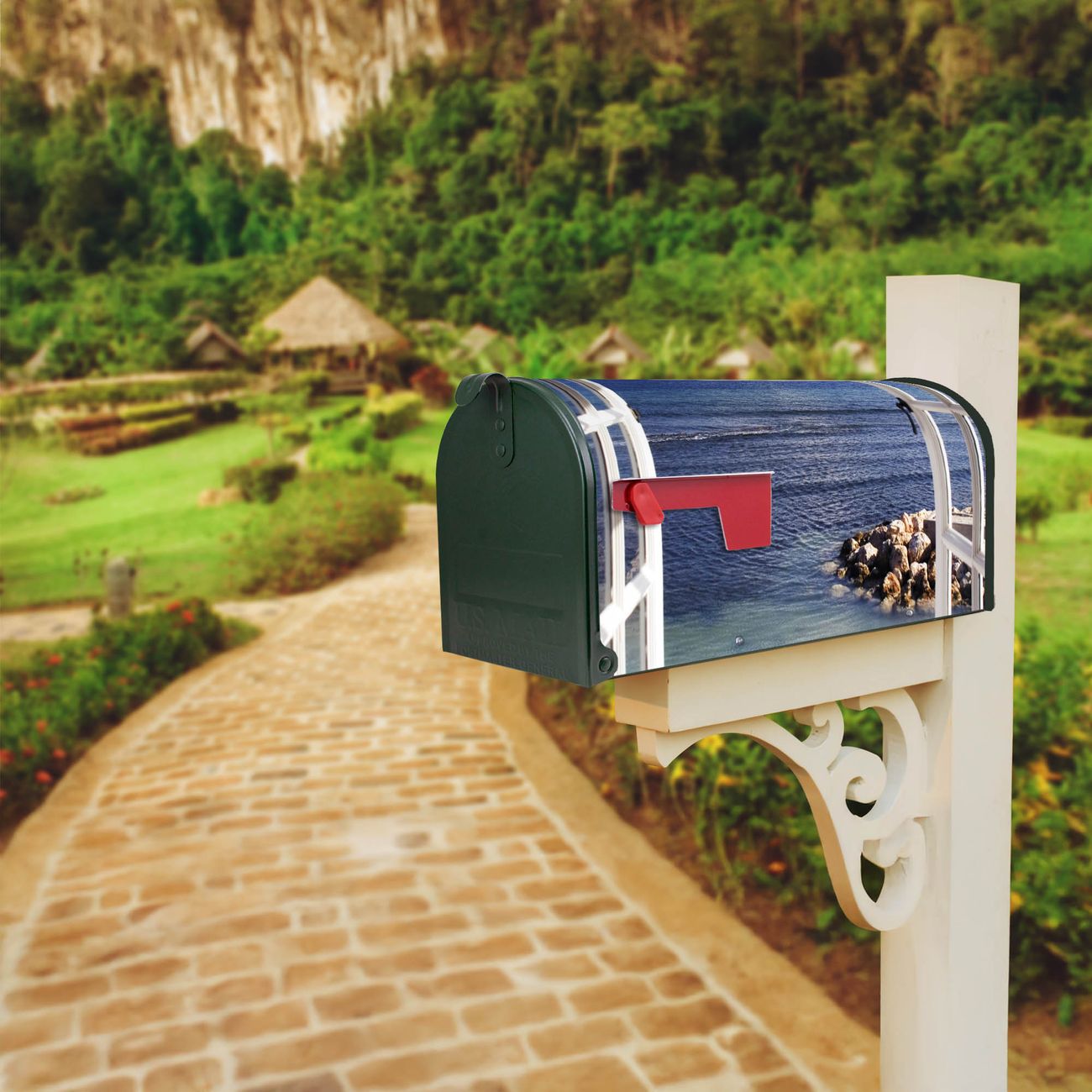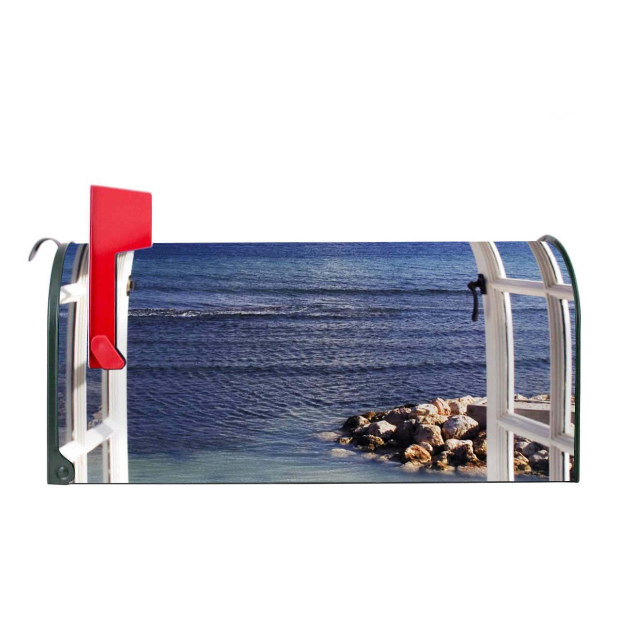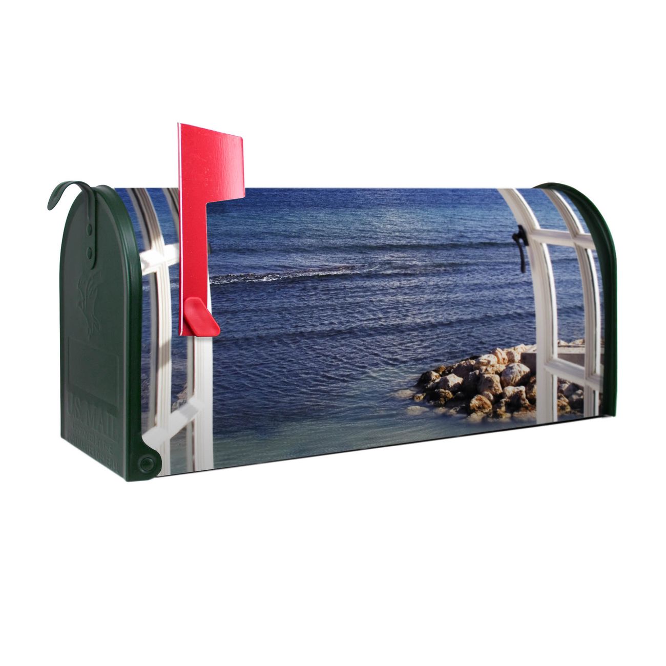 Der amerikanische Briefkasten von banjado mit Fensterpanorama Motiv bietet Ihnen ausreichend Fassungsvermögen, um große A4 Sendungen und Zeitschriften zu empfangen. Die typisch amerikanische rote Fahne zeigt Ihnen an, wenn Sie Post erhalten haben. Die US-Mailbox besteht aus verzinktem Stahlblech welches lackiert wurde und ist 48 x 22 x 16 CM (BxHxT) groß. Die Folie mit Motiv Fensterpanorama besteht aus einer wetter- und UV-resistenten Folie, die mit einem Schutzlaminat überzogen ist, sodass die US Mailbox zusätzlich vor Kratzern geschützt ist. An der Unterkante sind 4 Löcher je Seite um die Mailbox, typisch amerikanisch, an einem Holzpfahl oder einem Zaun zu befestigen. Auf Wunsch können Sie bei uns den passenden Standfuß oder die passende Wandhalterung kaufen um die US-Mailbox sicher zu befestigen. Wir bieten Ihnen ebenfalls Namensschilder, bereits beschriftet oder frei zu beschriften, und verschiedene selbst gestaltete Bitte-Keine-Werbung-Aufkleber.
