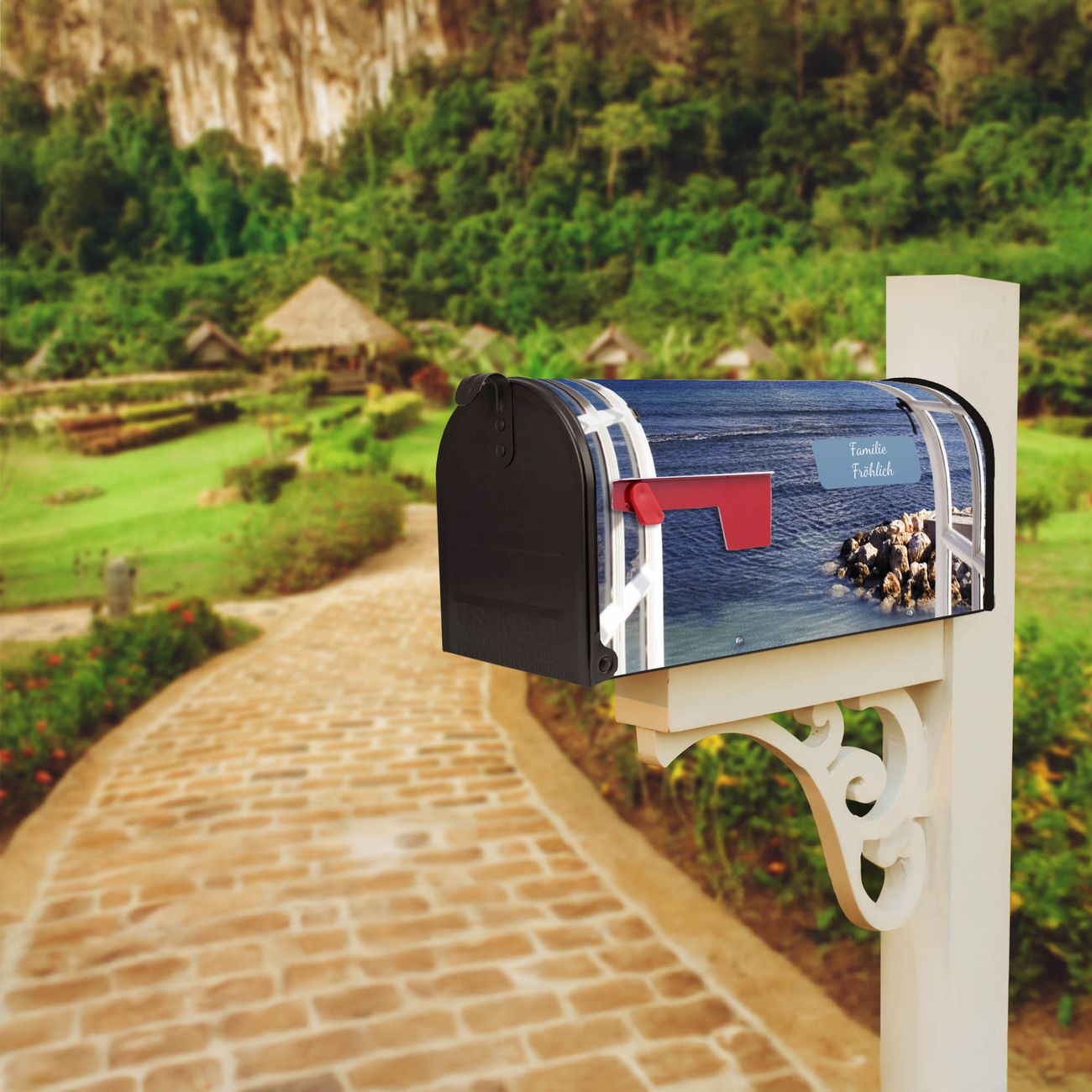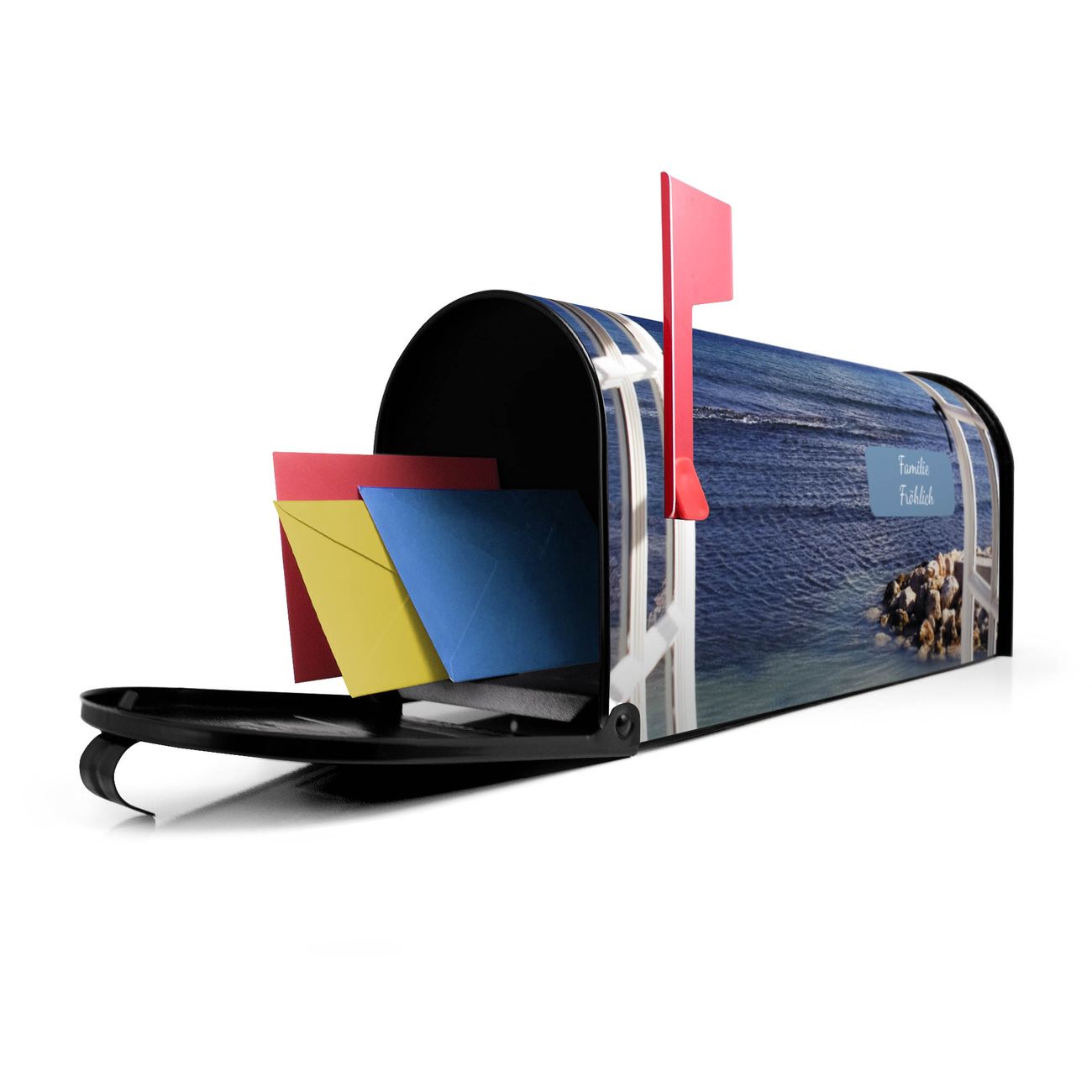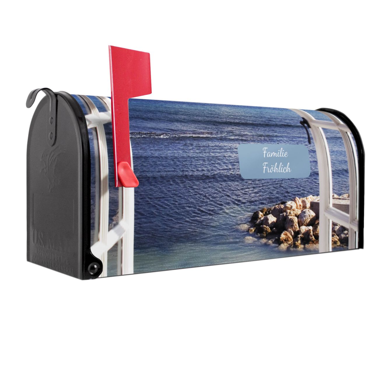 Der amerikanische Briefkasten von banjado mit Fensterpanorama Motiv bietet Ihnen ausreichend Fassungsvermögen, um große A4 Sendungen und Zeitschriften zu empfangen. Die typisch amerikanische rote Fahne zeigt Ihnen an, wenn Sie Post erhalten haben. Die US-Mailbox besteht aus verzinktem Stahlblech welches lackiert wurde und ist 48 x 22 x 16 CM (BxHxT) groß. Die Folie mit Motiv Fensterpanorama besteht aus einer wetter- und UV-resistenten Folie, die mit einem Schutzlaminat überzogen ist, sodass die US Mailbox zusätzlich vor Kratzern geschützt ist. An der Unterkante sind 4 Löcher je Seite um die Mailbox, typisch amerikanisch, an einem Holzpfahl oder einem Zaun zu befestigen. Auf Wunsch können Sie bei uns den passenden Standfuß oder die passende Wandhalterung kaufen um die US-Mailbox sicher zu befestigen. Wir bieten Ihnen ebenfalls Namensschilder, bereits beschriftet oder frei zu beschriften, und verschiedene selbst gestaltete Bitte-Keine-Werbung-Aufkleber.