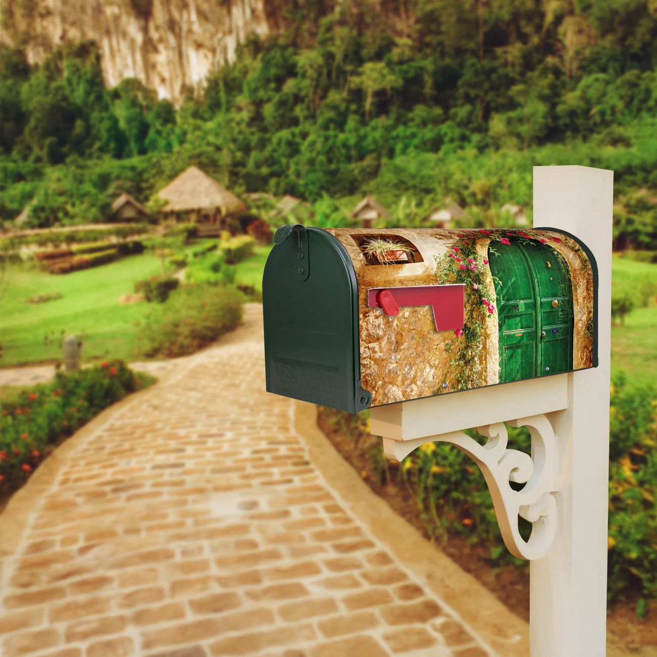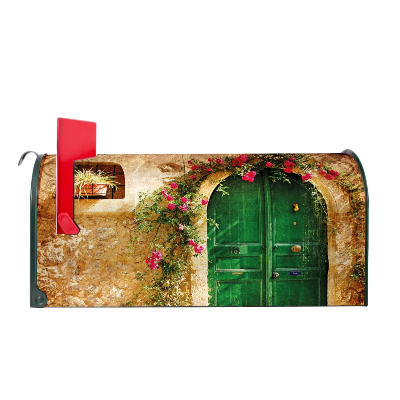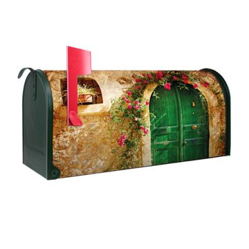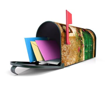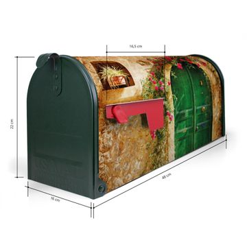 Der amerikanische Briefkasten von banjado mit Ferienhaus Motiv bietet Ihnen ausreichend Fassungsvermögen, um große A4 Sendungen und Zeitschriften zu empfangen. Die typisch amerikanische rote Fahne zeigt Ihnen an, wenn Sie Post erhalten haben. Die US-Mailbox besteht aus verzinktem Stahlblech welches lackiert wurde und ist 48 x 22 x 16 CM (BxHxT) groß. Die Folie mit Motiv Ferienhaus besteht aus einer wetter- und UV-resistenten Folie, die mit einem Schutzlaminat überzogen ist, sodass die US Mailbox zusätzlich vor Kratzern geschützt ist. An der Unterkante sind 4 Löcher je Seite um die Mailbox, typisch amerikanisch, an einem Holzpfahl oder einem Zaun zu befestigen. Auf Wunsch können Sie bei uns den passenden Standfuß oder die passende Wandhalterung kaufen um die US-Mailbox sicher zu befestigen. Wir bieten Ihnen ebenfalls Namensschilder, bereits beschriftet oder frei zu beschriften, und verschiedene selbst gestaltete Bitte-Keine-Werbung-Aufkleber.