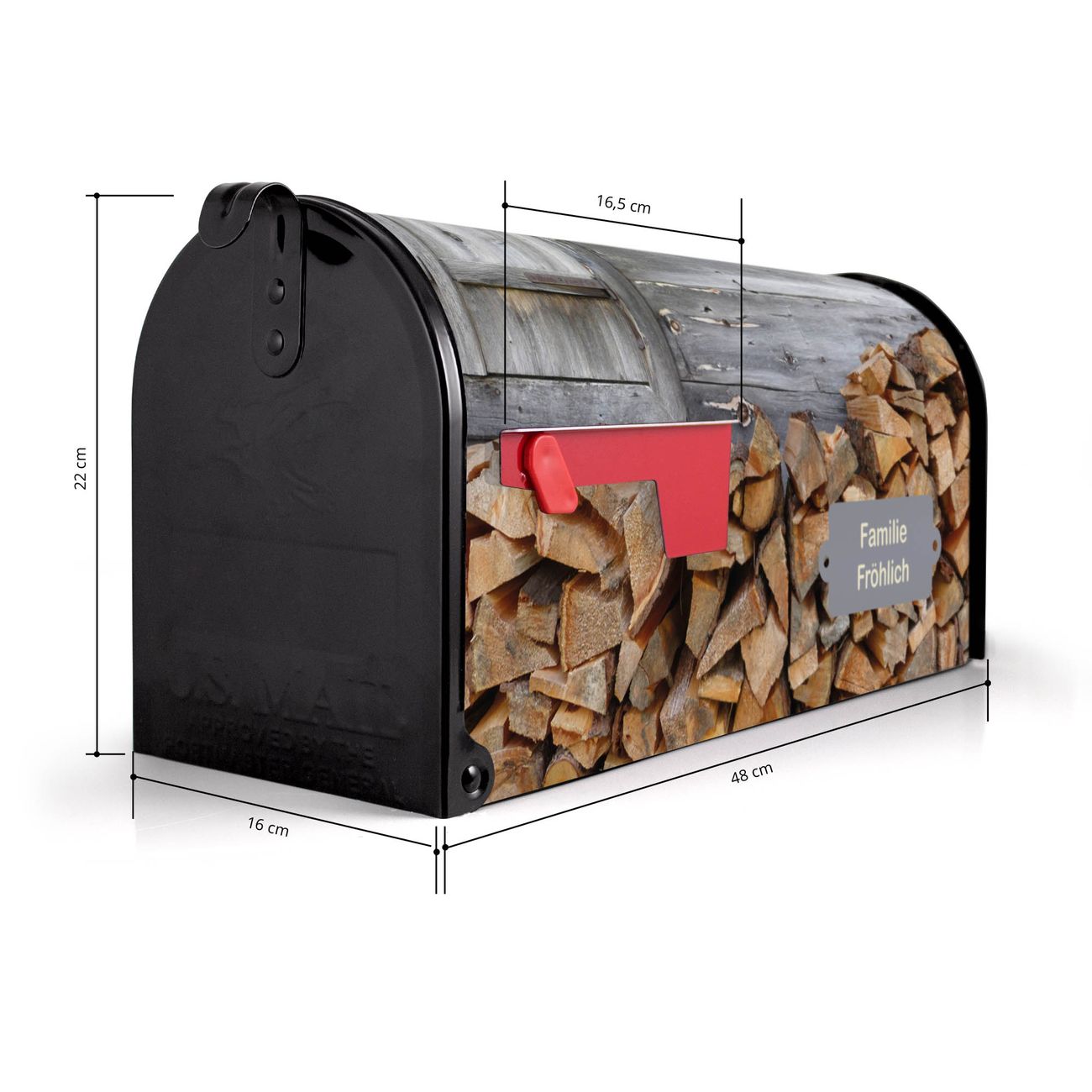 Der amerikanische Briefkasten von banjado mit Feuerholz Motiv bietet Ihnen ausreichend Fassungsvermögen, um große A4 Sendungen und Zeitschriften zu empfangen. Die typisch amerikanische rote Fahne zeigt Ihnen an, wenn Sie Post erhalten haben. Die US-Mailbox besteht aus verzinktem Stahlblech welches lackiert wurde und ist 48 x 22 x 16 CM (BxHxT) groß. Die Folie mit Motiv Feuerholz besteht aus einer wetter- und UV-resistenten Folie, die mit einem Schutzlaminat überzogen ist, sodass die US Mailbox zusätzlich vor Kratzern geschützt ist. An der Unterkante sind 4 Löcher je Seite um die Mailbox, typisch amerikanisch, an einem Holzpfahl oder einem Zaun zu befestigen. Auf Wunsch können Sie bei uns den passenden Standfuß oder die passende Wandhalterung kaufen um die US-Mailbox sicher zu befestigen. Wir bieten Ihnen ebenfalls Namensschilder, bereits beschriftet oder frei zu beschriften, und verschiedene selbst gestaltete Bitte-Keine-Werbung-Aufkleber.
