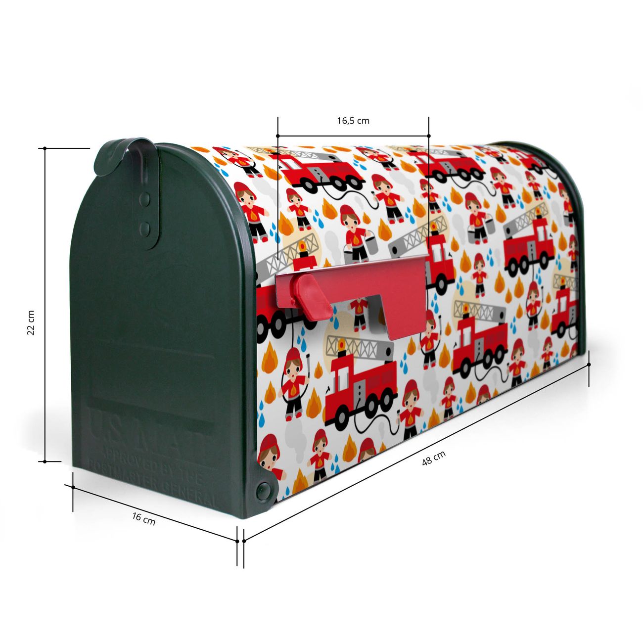 Der amerikanische Briefkasten von banjado mit Feuerwehr Motiv bietet Ihnen ausreichend Fassungsvermögen, um große A4 Sendungen und Zeitschriften zu empfangen. Die typisch amerikanische rote Fahne zeigt Ihnen an, wenn Sie Post erhalten haben. Die US-Mailbox besteht aus verzinktem Stahlblech welches lackiert wurde und ist 48 x 22 x 16 CM (BxHxT) groß. Die Folie mit Motiv Feuerwehr besteht aus einer wetter- und UV-resistenten Folie, die mit einem Schutzlaminat überzogen ist, sodass die US Mailbox zusätzlich vor Kratzern geschützt ist. An der Unterkante sind 4 Löcher je Seite um die Mailbox, typisch amerikanisch, an einem Holzpfahl oder einem Zaun zu befestigen. Auf Wunsch können Sie bei uns den passenden Standfuß oder die passende Wandhalterung kaufen um die US-Mailbox sicher zu befestigen. Wir bieten Ihnen ebenfalls Namensschilder, bereits beschriftet oder frei zu beschriften, und verschiedene selbst gestaltete Bitte-Keine-Werbung-Aufkleber.