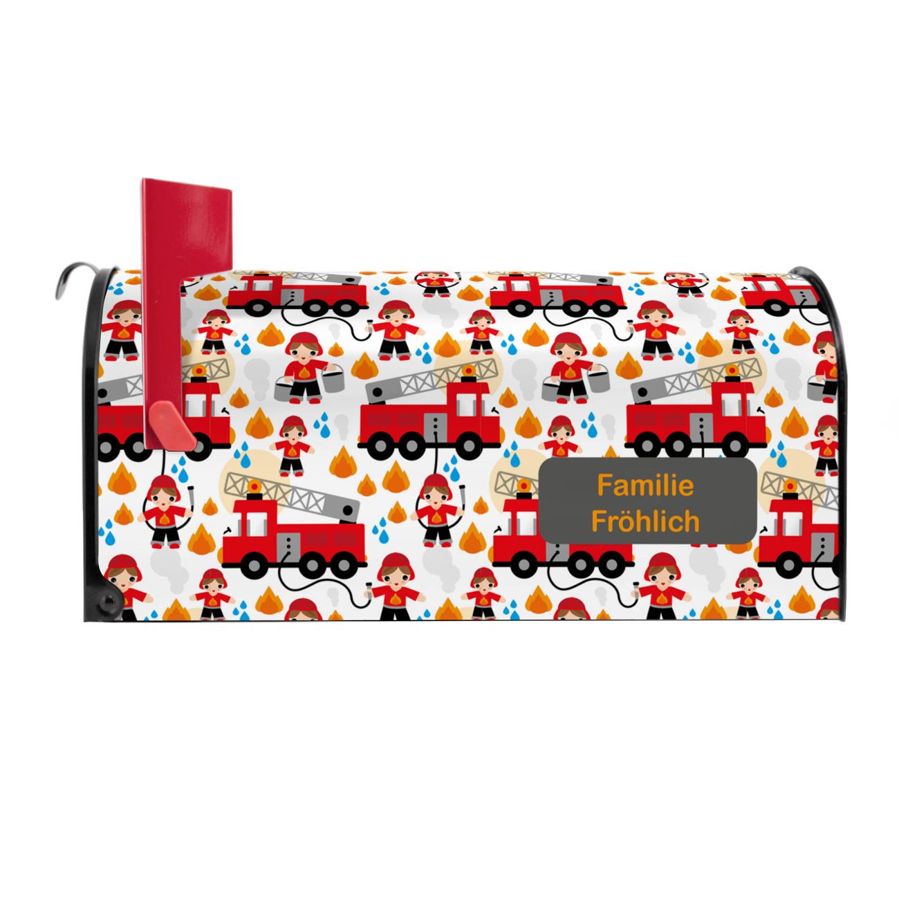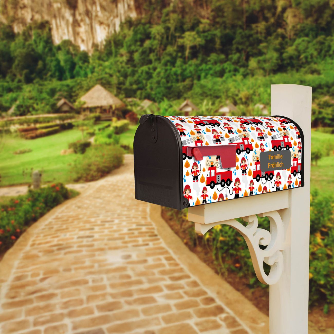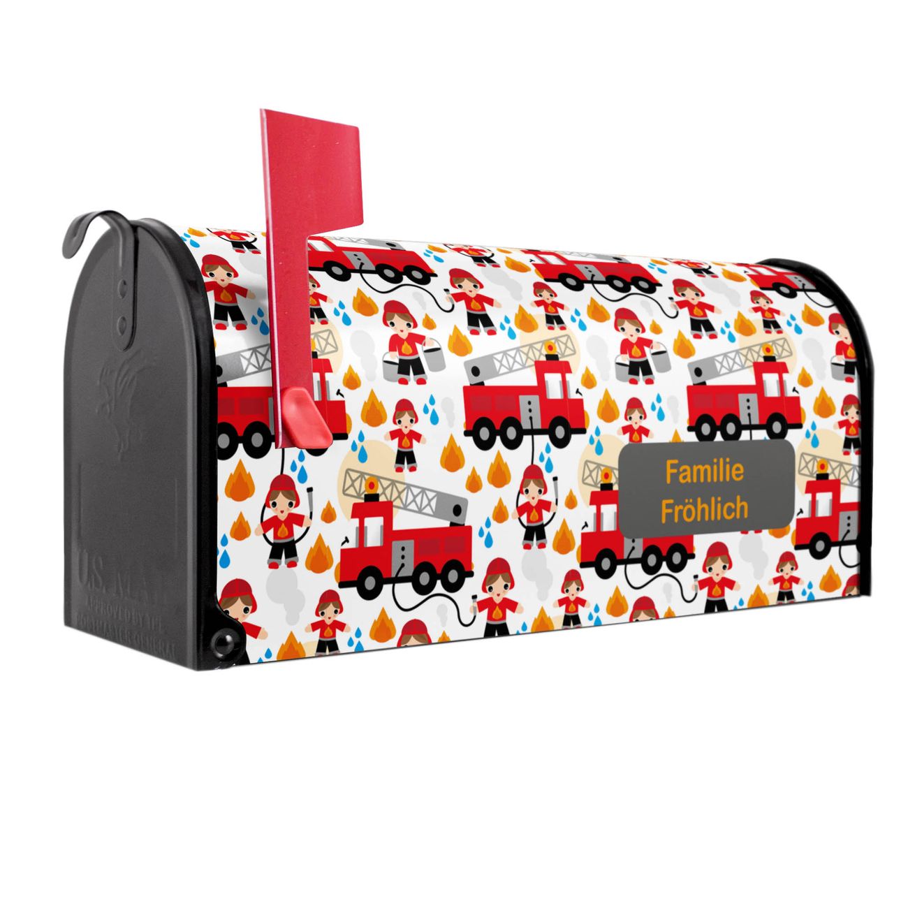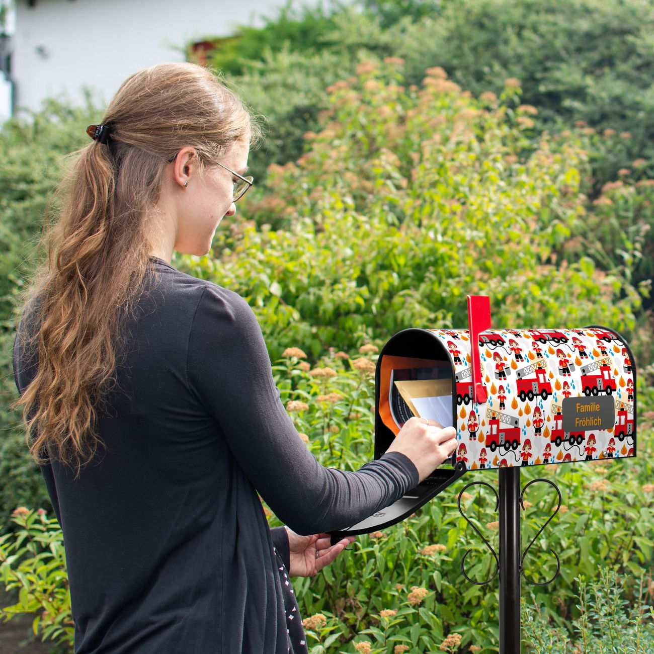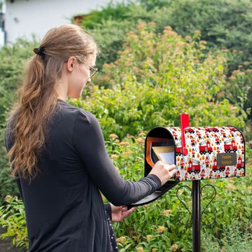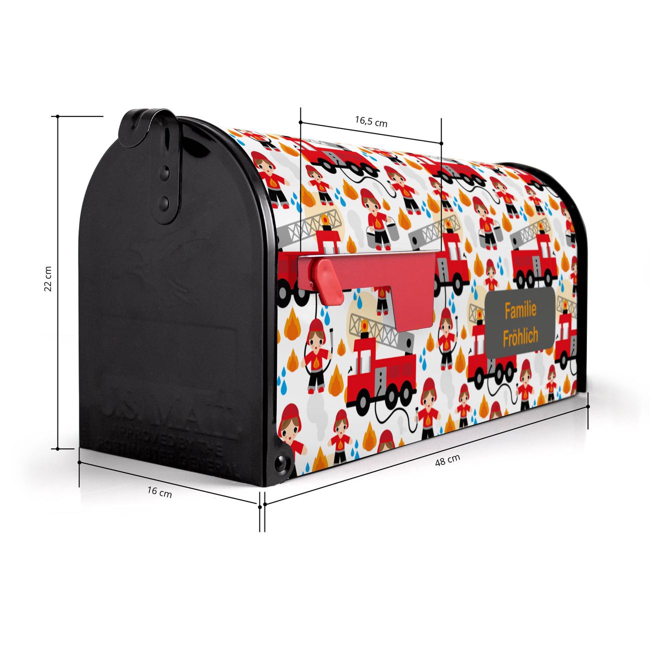 Der amerikanische Briefkasten von banjado mit Feuerwehr Motiv bietet Ihnen ausreichend Fassungsvermögen, um große A4 Sendungen und Zeitschriften zu empfangen. Die typisch amerikanische rote Fahne zeigt Ihnen an, wenn Sie Post erhalten haben. Die US-Mailbox besteht aus verzinktem Stahlblech welches lackiert wurde und ist 48 x 22 x 16 CM (BxHxT) groß. Die Folie mit Motiv Feuerwehr besteht aus einer wetter- und UV-resistenten Folie, die mit einem Schutzlaminat überzogen ist, sodass die US Mailbox zusätzlich vor Kratzern geschützt ist. An der Unterkante sind 4 Löcher je Seite um die Mailbox, typisch amerikanisch, an einem Holzpfahl oder einem Zaun zu befestigen. Auf Wunsch können Sie bei uns den passenden Standfuß oder die passende Wandhalterung kaufen um die US-Mailbox sicher zu befestigen. Wir bieten Ihnen ebenfalls Namensschilder, bereits beschriftet oder frei zu beschriften, und verschiedene selbst gestaltete Bitte-Keine-Werbung-Aufkleber.