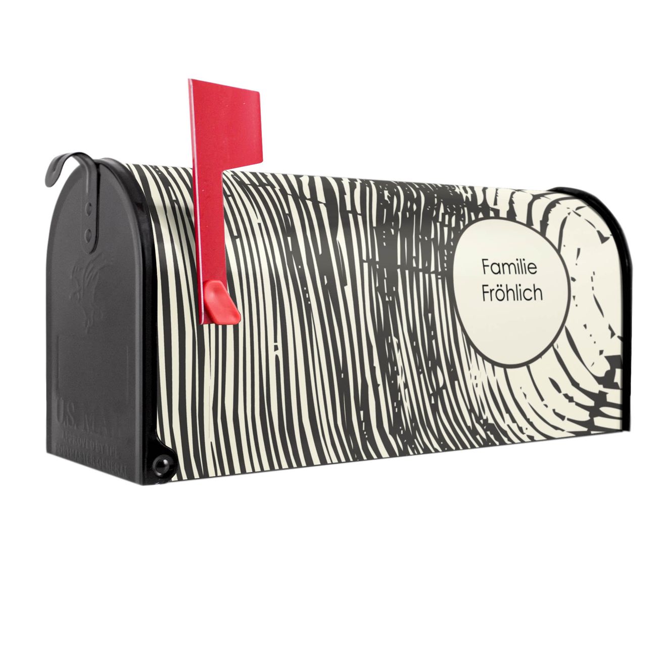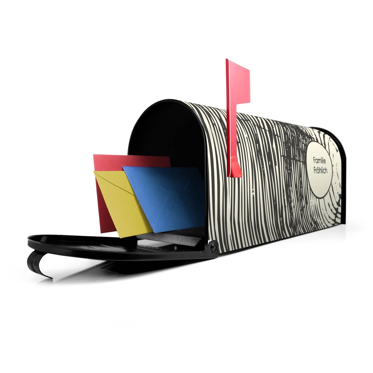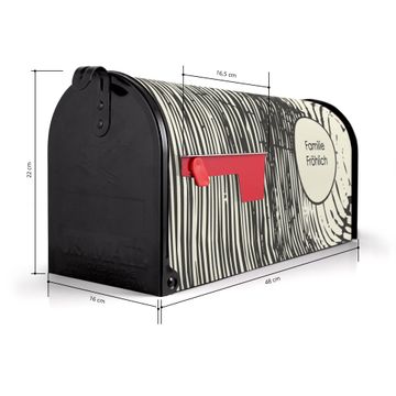 Der amerikanische Briefkasten von banjado mit Fingerabdruck Motiv bietet Ihnen ausreichend Fassungsvermögen, um große A4 Sendungen und Zeitschriften zu empfangen. Die typisch amerikanische rote Fahne zeigt Ihnen an, wenn Sie Post erhalten haben. Die US-Mailbox besteht aus verzinktem Stahlblech welches lackiert wurde und ist 48 x 22 x 16 CM (BxHxT) groß. Die Folie mit Motiv Fingerabdruck besteht aus einer wetter- und UV-resistenten Folie, die mit einem Schutzlaminat überzogen ist, sodass die US Mailbox zusätzlich vor Kratzern geschützt ist. An der Unterkante sind 4 Löcher je Seite um die Mailbox, typisch amerikanisch, an einem Holzpfahl oder einem Zaun zu befestigen. Auf Wunsch können Sie bei uns den passenden Standfuß oder die passende Wandhalterung kaufen um die US-Mailbox sicher zu befestigen. Wir bieten Ihnen ebenfalls Namensschilder, bereits beschriftet oder frei zu beschriften, und verschiedene selbst gestaltete Bitte-Keine-Werbung-Aufkleber.