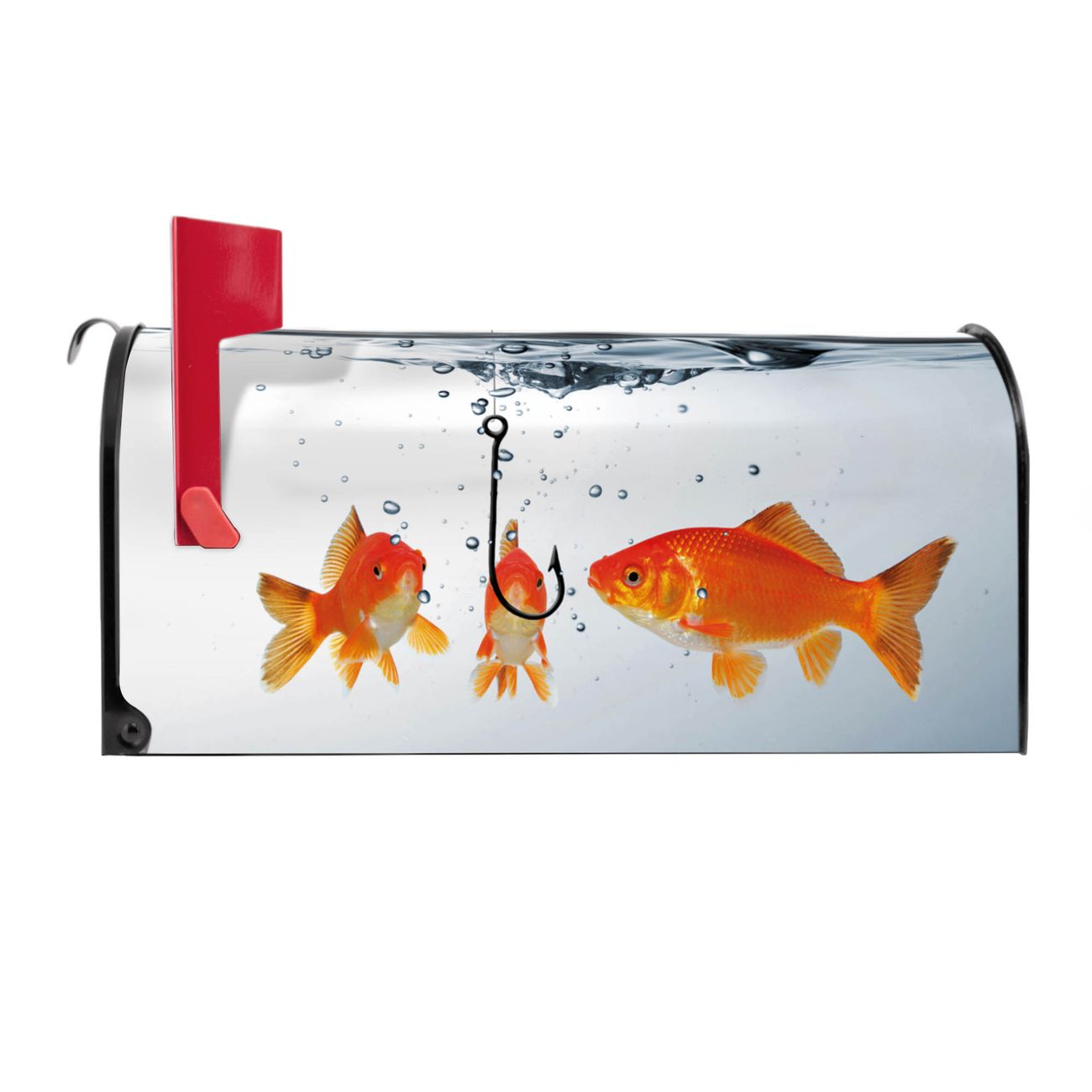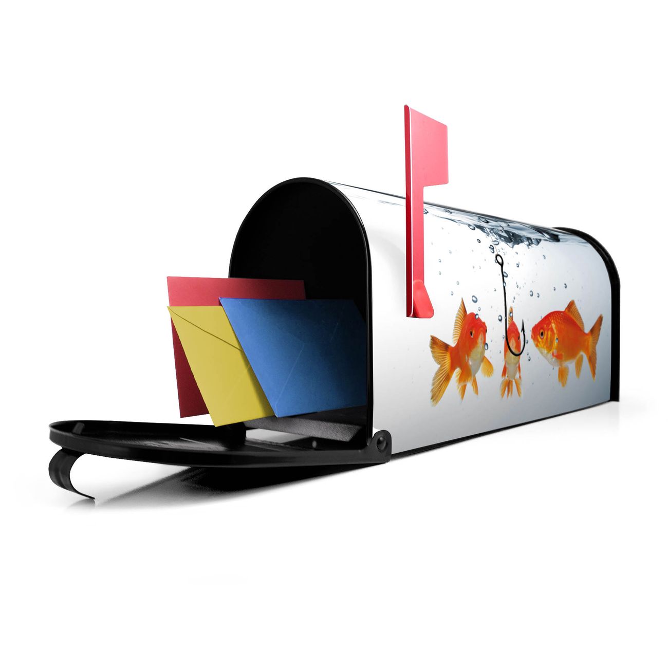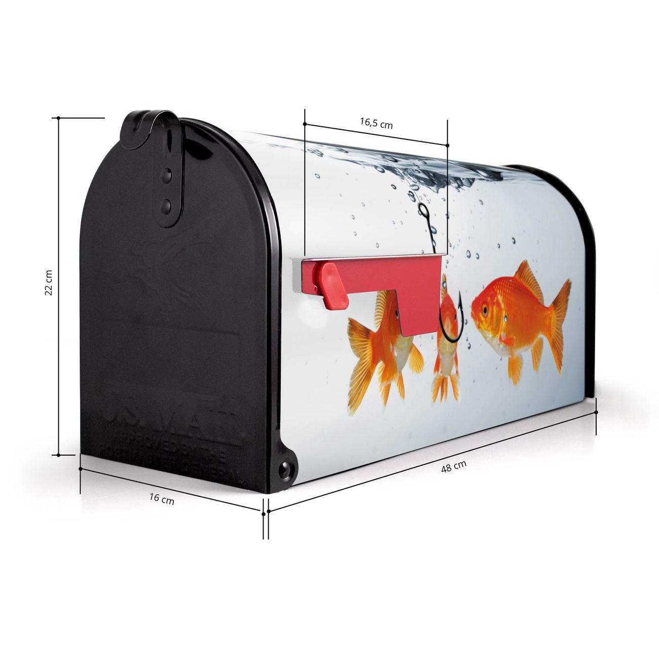 Der amerikanische Briefkasten von banjado mit Fische Motiv bietet Ihnen ausreichend Fassungsvermögen, um große A4 Sendungen und Zeitschriften zu empfangen. Die typisch amerikanische rote Fahne zeigt Ihnen an, wenn Sie Post erhalten haben. Die US-Mailbox besteht aus verzinktem Stahlblech welches lackiert wurde und ist 48 x 22 x 16 CM (BxHxT) groß. Die Folie mit Motiv Fische besteht aus einer wetter- und UV-resistenten Folie, die mit einem Schutzlaminat überzogen ist, sodass die US Mailbox zusätzlich vor Kratzern geschützt ist. An der Unterkante sind 4 Löcher je Seite um die Mailbox, typisch amerikanisch, an einem Holzpfahl oder einem Zaun zu befestigen. Auf Wunsch können Sie bei uns den passenden Standfuß oder die passende Wandhalterung kaufen um die US-Mailbox sicher zu befestigen. Wir bieten Ihnen ebenfalls Namensschilder, bereits beschriftet oder frei zu beschriften, und verschiedene selbst gestaltete Bitte-Keine-Werbung-Aufkleber.