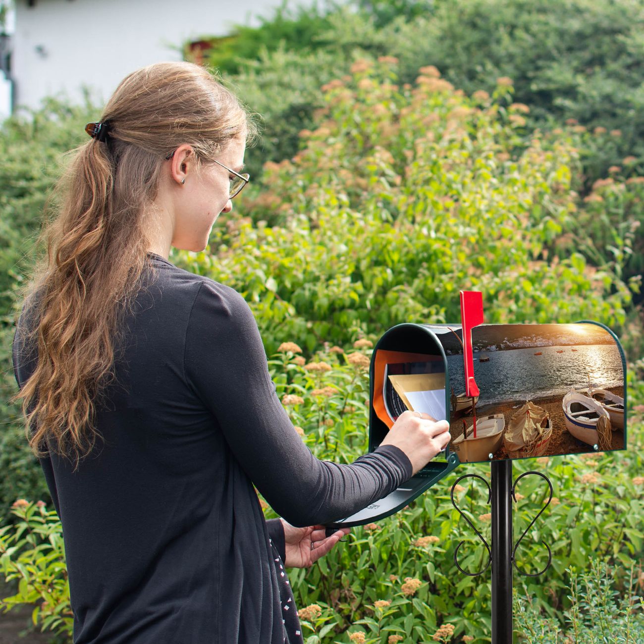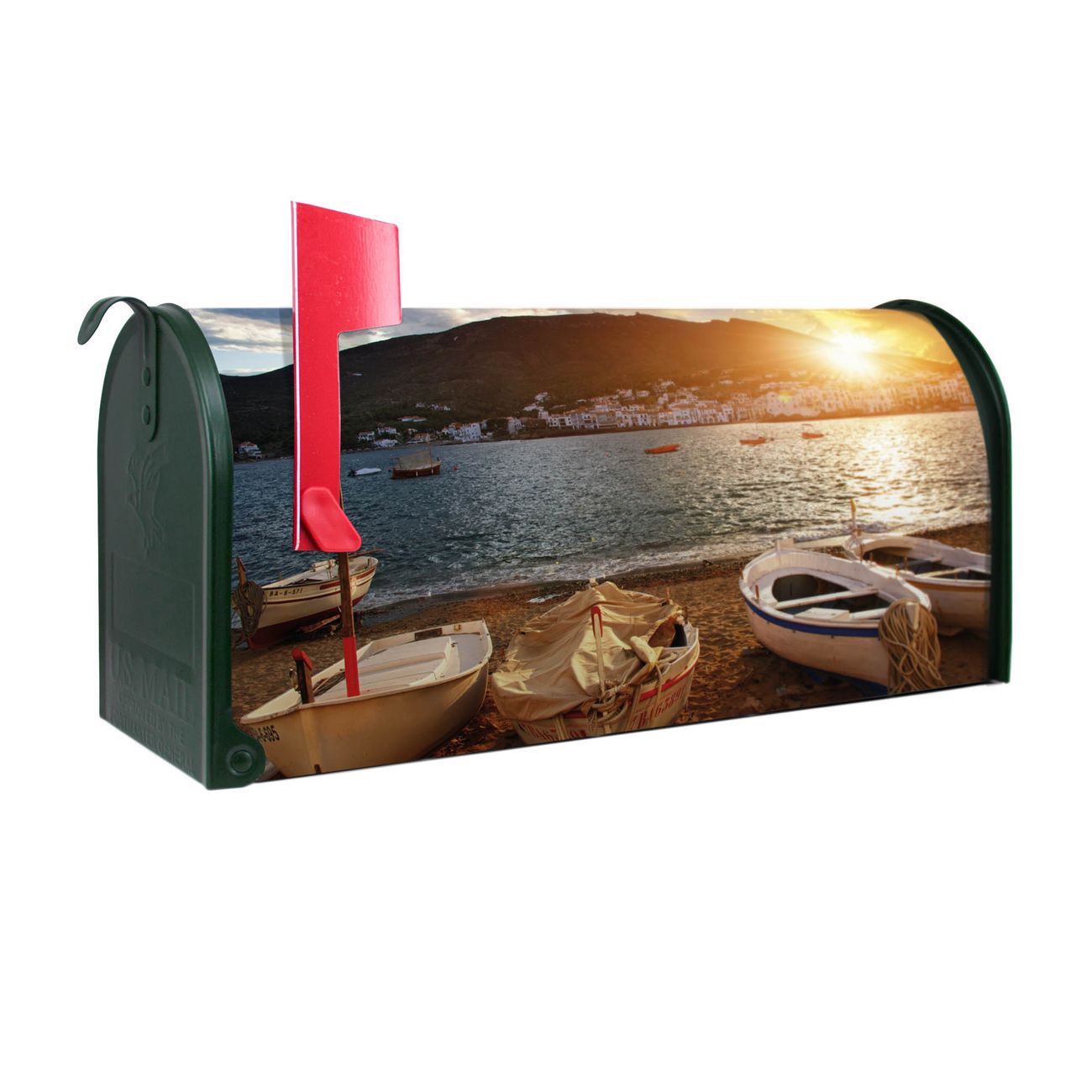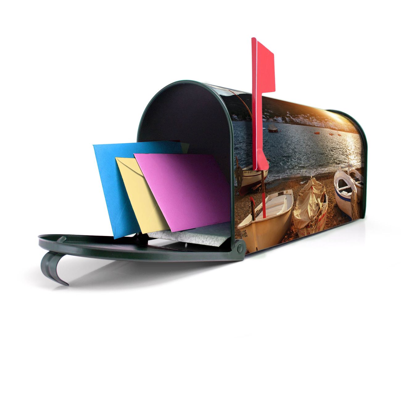 Unser amerikanischer Briefkasten mit dem Motiv Fischerboote hat ein sehr ansprechendes und ausgefallenes Design, ist in der Grundfarbe weiß, grün oder schwarz erhältlich. Damit entlocken Sie Ihren Nachbarn und dem Postboten immer wieder ein Lächeln. Die Mailbox ist ein Original Import aus Mississippi USA und wird von unserer kleinen Manufaktur in Sachsen von Hand veredelt. Die US-Mailbox bietet ausreichend Platz auch für große Sendungen, eine Fahne die Ihnen Post anzeigt, wetterfestes und äußerst stabiles Material - so macht Post empfangen Freude.