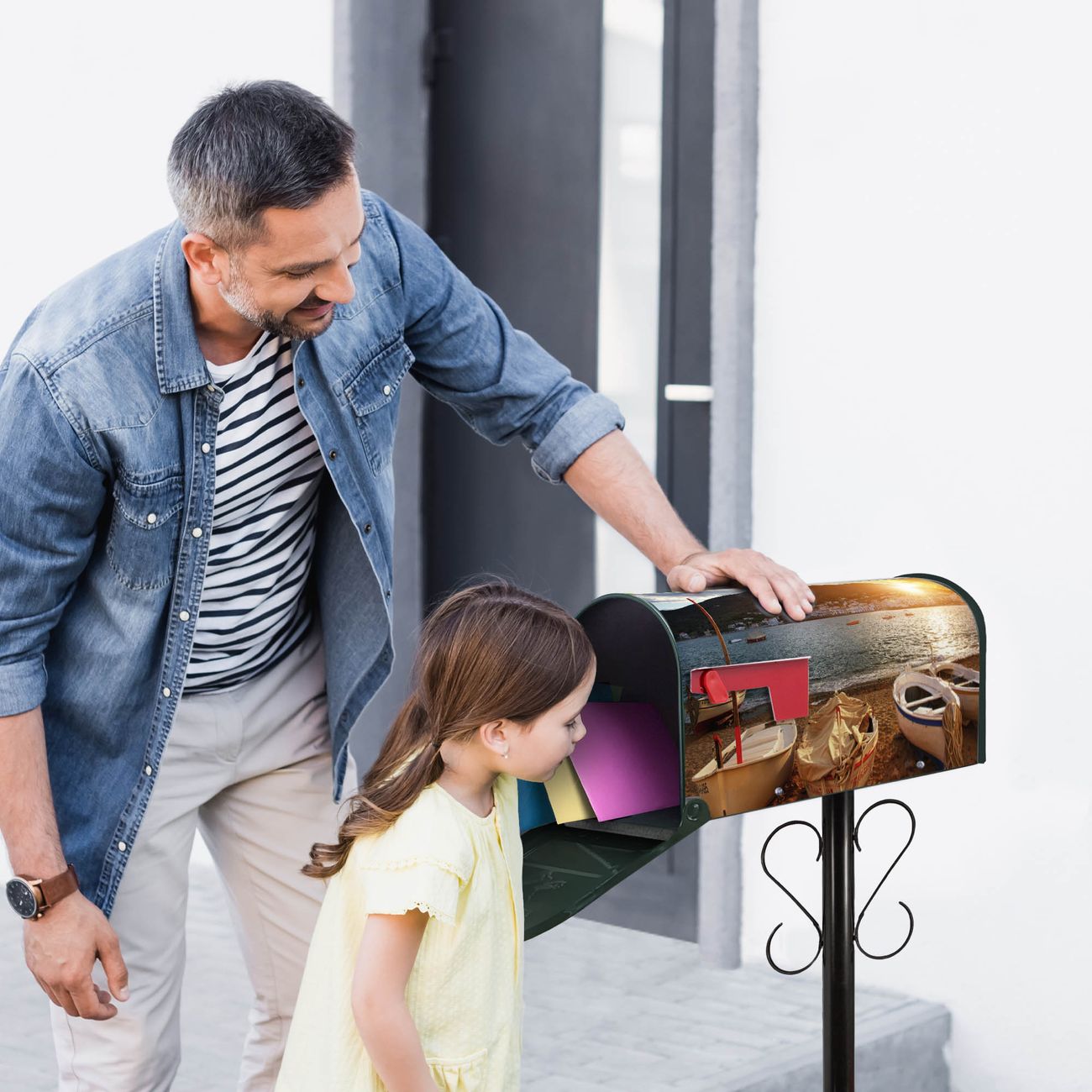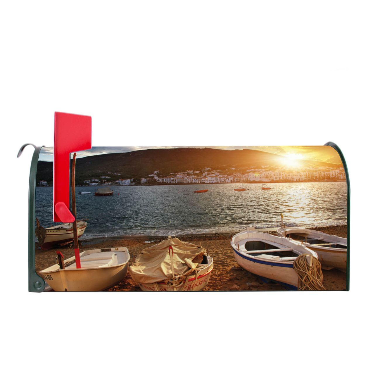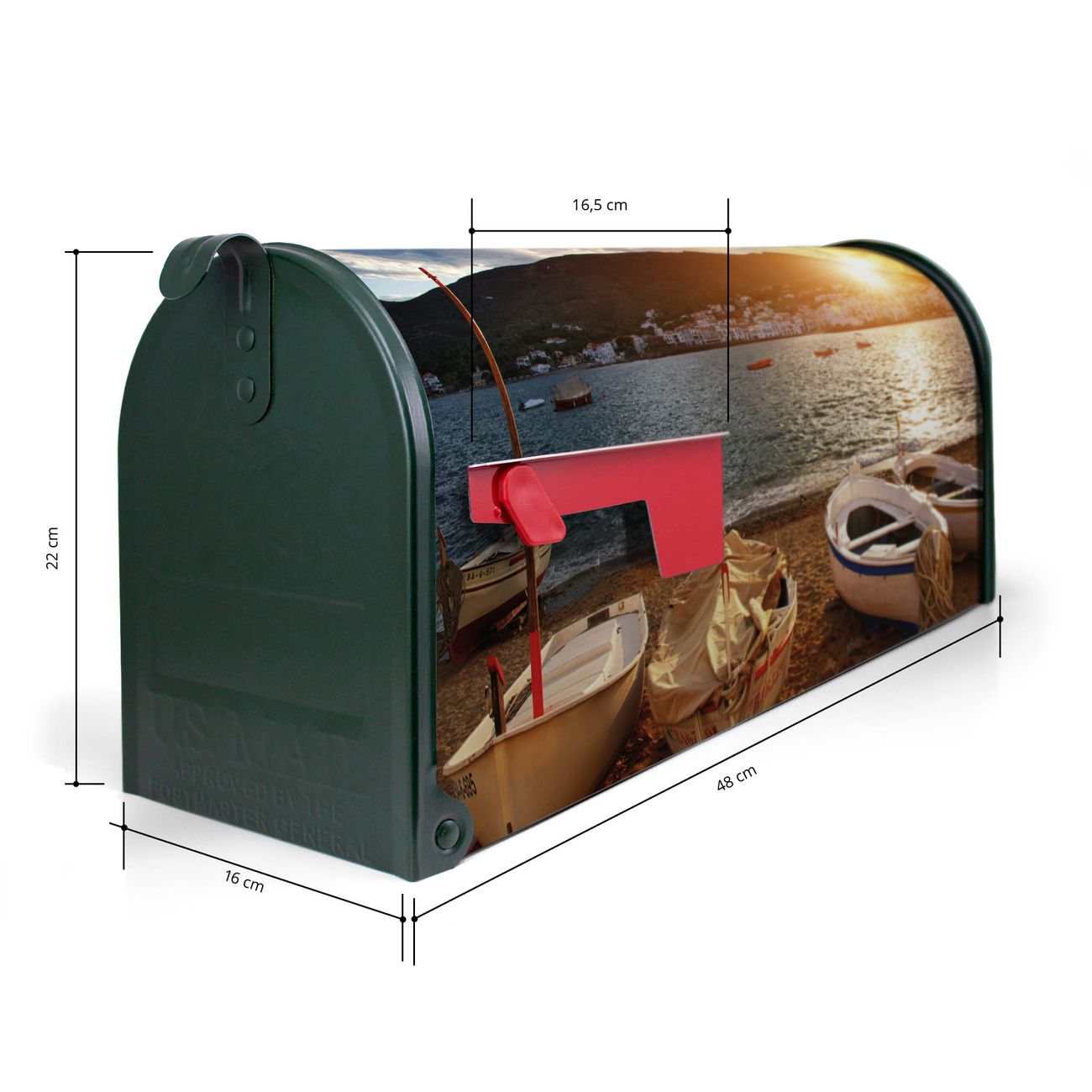 Der amerikanische Briefkasten von banjado mit Fischerboote Motiv bietet Ihnen ausreichend Fassungsvermögen, um große A4 Sendungen und Zeitschriften zu empfangen. Die typisch amerikanische rote Fahne zeigt Ihnen an, wenn Sie Post erhalten haben. Die US-Mailbox besteht aus verzinktem Stahlblech welches lackiert wurde und ist 48 x 22 x 16 CM (BxHxT) groß. Die Folie mit Motiv Fischerboote besteht aus einer wetter- und UV-resistenten Folie, die mit einem Schutzlaminat überzogen ist, sodass die US Mailbox zusätzlich vor Kratzern geschützt ist. An der Unterkante sind 4 Löcher je Seite um die Mailbox, typisch amerikanisch, an einem Holzpfahl oder einem Zaun zu befestigen. Auf Wunsch können Sie bei uns den passenden Standfuß oder die passende Wandhalterung kaufen um die US-Mailbox sicher zu befestigen. Wir bieten Ihnen ebenfalls Namensschilder, bereits beschriftet oder frei zu beschriften, und verschiedene selbst gestaltete Bitte-Keine-Werbung-Aufkleber.