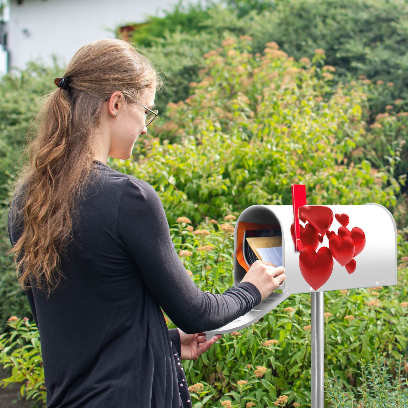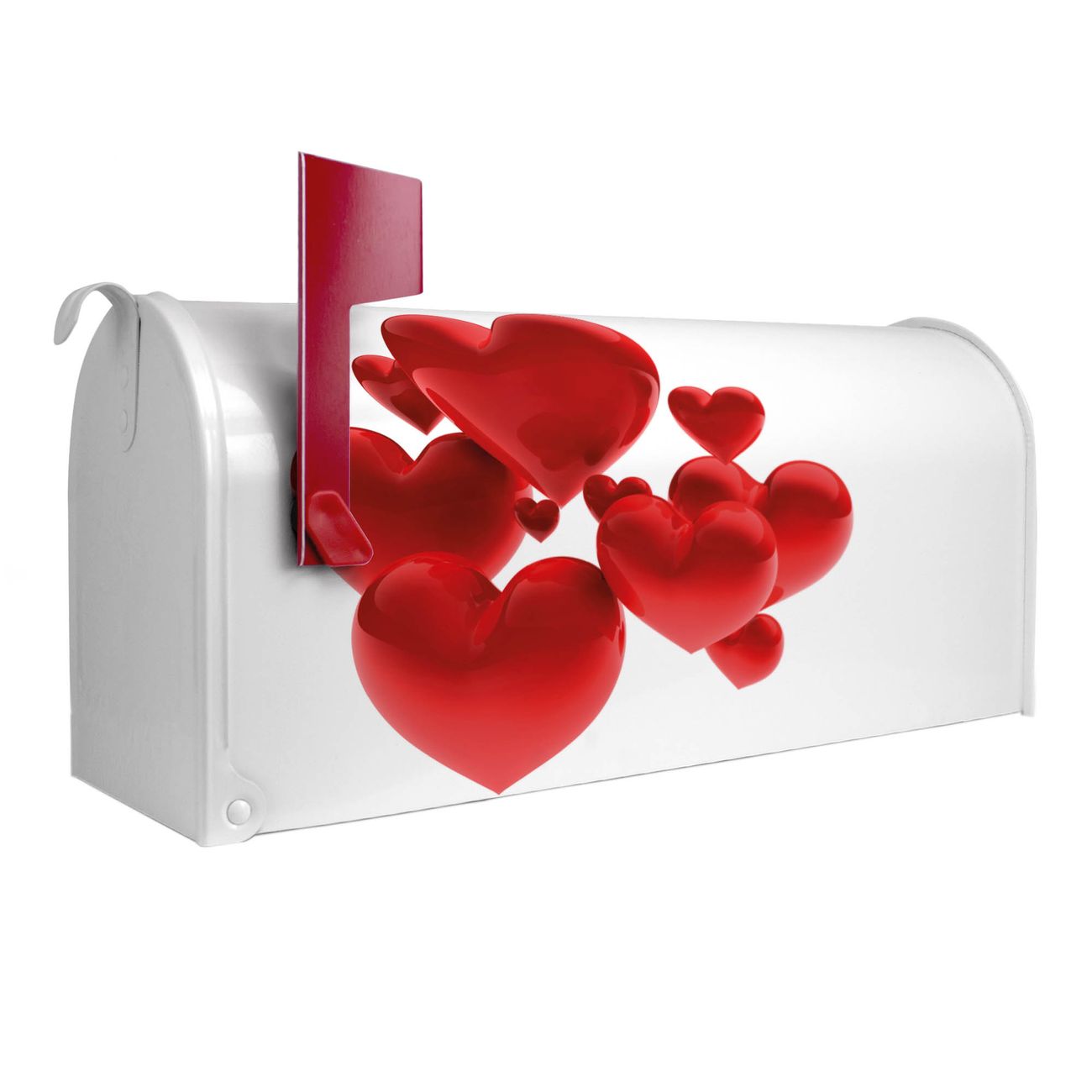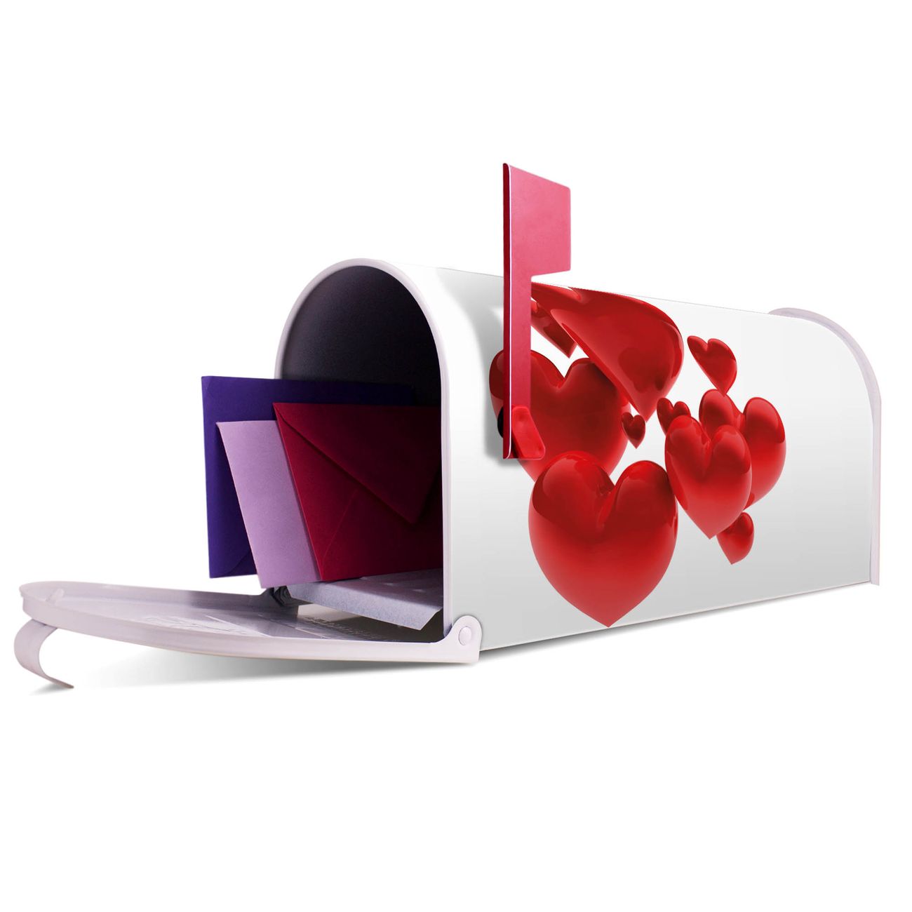 Unser amerikanischer Briefkasten mit dem Motiv Fliegende Herzen hat ein sehr ansprechendes und ausgefallenes Design, ist in der Grundfarbe weiß, grün oder schwarz erhältlich. Damit entlocken Sie Ihren Nachbarn und dem Postboten immer wieder ein Lächeln. Die Mailbox ist ein Original Import aus Mississippi USA und wird von unserer kleinen Manufaktur in Sachsen von Hand veredelt. Die US-Mailbox bietet ausreichend Platz auch für große Sendungen, eine Fahne die Ihnen Post anzeigt, wetterfestes und äußerst stabiles Material - so macht Post empfangen Freude.