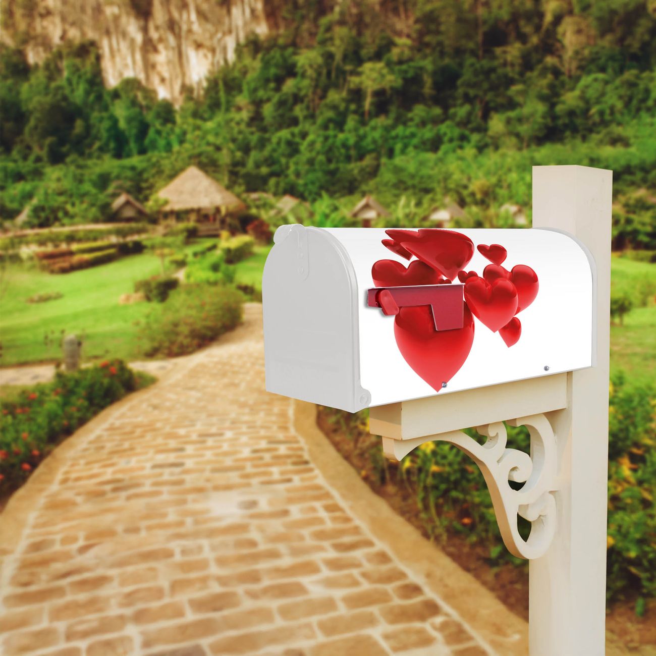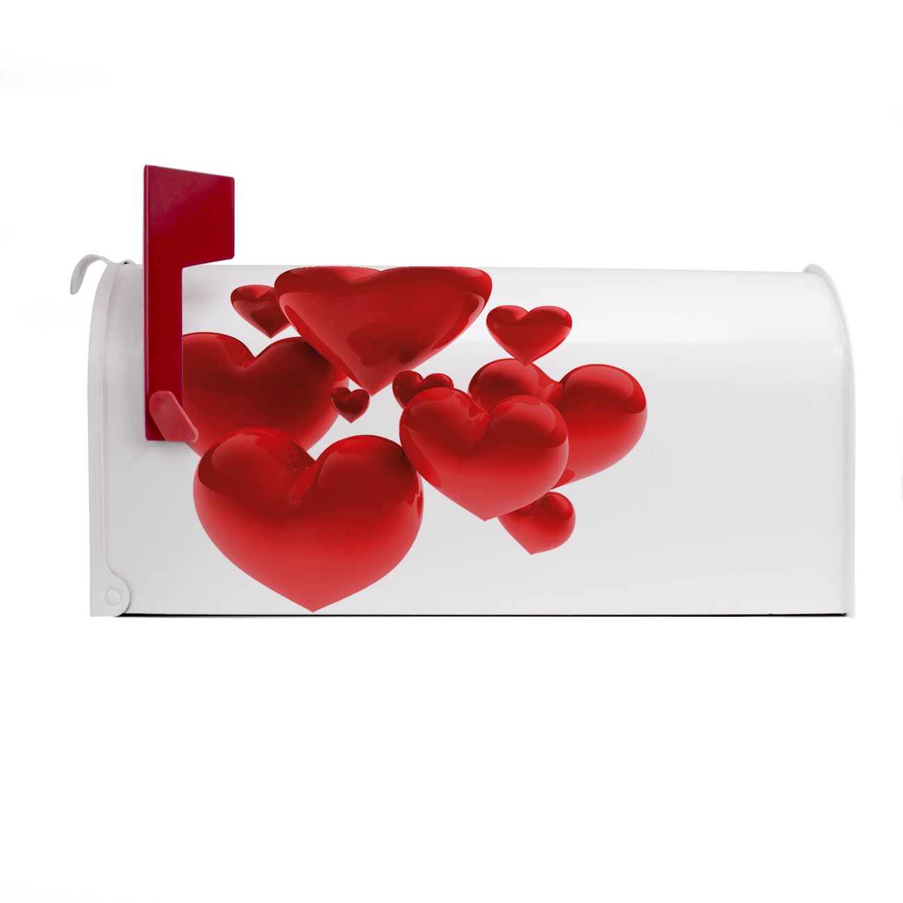 Der amerikanische Briefkasten von banjado mit Fliegende Herzen Motiv bietet Ihnen ausreichend Fassungsvermögen, um große A4 Sendungen und Zeitschriften zu empfangen. Die typisch amerikanische rote Fahne zeigt Ihnen an, wenn Sie Post erhalten haben. Die US-Mailbox besteht aus verzinktem Stahlblech welches lackiert wurde und ist 48 x 22 x 16 CM (BxHxT) groß. Die Folie mit Motiv Fliegende Herzen besteht aus einer wetter- und UV-resistenten Folie, die mit einem Schutzlaminat überzogen ist, sodass die US Mailbox zusätzlich vor Kratzern geschützt ist. An der Unterkante sind 4 Löcher je Seite um die Mailbox, typisch amerikanisch, an einem Holzpfahl oder einem Zaun zu befestigen. Auf Wunsch können Sie bei uns den passenden Standfuß oder die passende Wandhalterung kaufen um die US-Mailbox sicher zu befestigen. Wir bieten Ihnen ebenfalls Namensschilder, bereits beschriftet oder frei zu beschriften, und verschiedene selbst gestaltete Bitte-Keine-Werbung-Aufkleber.