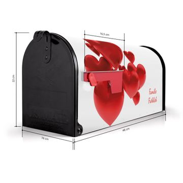 Der amerikanische Briefkasten von banjado mit Fliegende Herzen Motiv bietet Ihnen ausreichend Fassungsvermögen, um große A4 Sendungen und Zeitschriften zu empfangen. Die typisch amerikanische rote Fahne zeigt Ihnen an, wenn Sie Post erhalten haben. Die US-Mailbox besteht aus verzinktem Stahlblech welches lackiert wurde und ist 48 x 22 x 16 CM (BxHxT) groß. Die Folie mit Motiv Fliegende Herzen besteht aus einer wetter- und UV-resistenten Folie, die mit einem Schutzlaminat überzogen ist, sodass die US Mailbox zusätzlich vor Kratzern geschützt ist. An der Unterkante sind 4 Löcher je Seite um die Mailbox, typisch amerikanisch, an einem Holzpfahl oder einem Zaun zu befestigen. Auf Wunsch können Sie bei uns den passenden Standfuß oder die passende Wandhalterung kaufen um die US-Mailbox sicher zu befestigen. Wir bieten Ihnen ebenfalls Namensschilder, bereits beschriftet oder frei zu beschriften, und verschiedene selbst gestaltete Bitte-Keine-Werbung-Aufkleber.