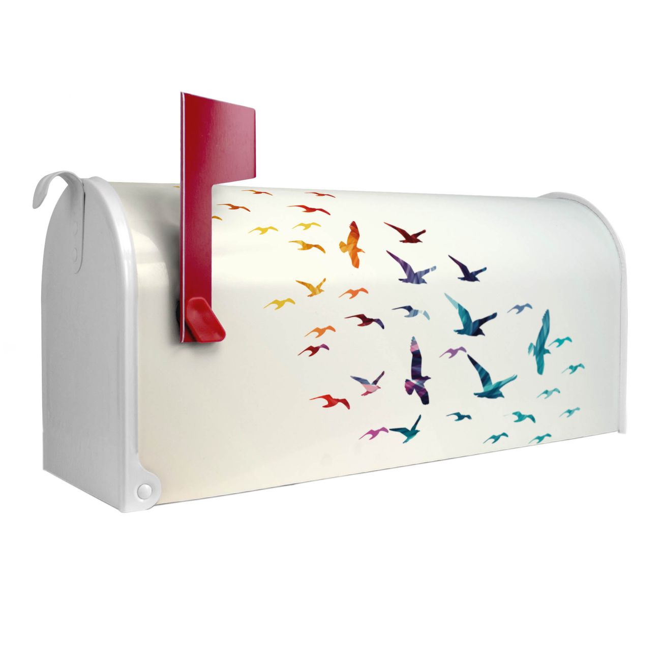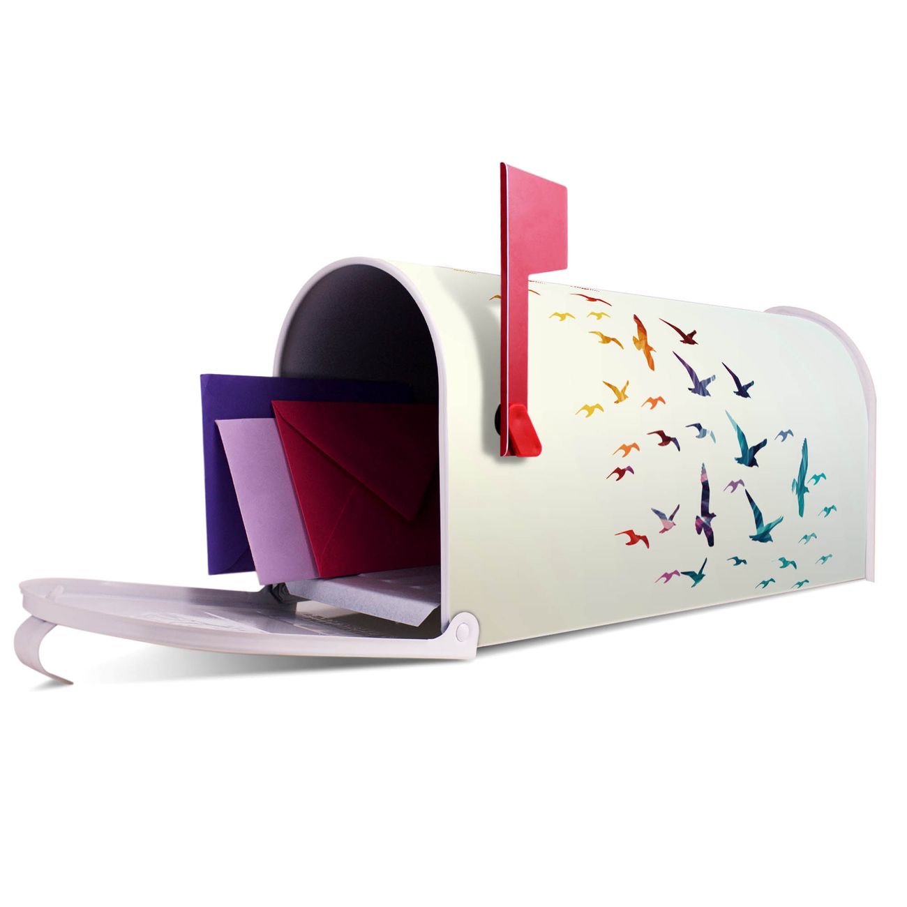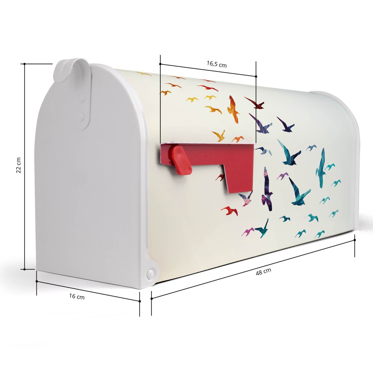 Der amerikanische Briefkasten von banjado mit Fliegende Vögel Motiv bietet Ihnen ausreichend Fassungsvermögen, um große A4 Sendungen und Zeitschriften zu empfangen. Die typisch amerikanische rote Fahne zeigt Ihnen an, wenn Sie Post erhalten haben. Die US-Mailbox besteht aus verzinktem Stahlblech welches lackiert wurde und ist 48 x 22 x 16 CM (BxHxT) groß. Die Folie mit Motiv Fliegende Vögel besteht aus einer wetter- und UV-resistenten Folie, die mit einem Schutzlaminat überzogen ist, sodass die US Mailbox zusätzlich vor Kratzern geschützt ist. An der Unterkante sind 4 Löcher je Seite um die Mailbox, typisch amerikanisch, an einem Holzpfahl oder einem Zaun zu befestigen. Auf Wunsch können Sie bei uns den passenden Standfuß oder die passende Wandhalterung kaufen um die US-Mailbox sicher zu befestigen. Wir bieten Ihnen ebenfalls Namensschilder, bereits beschriftet oder frei zu beschriften, und verschiedene selbst gestaltete Bitte-Keine-Werbung-Aufkleber.