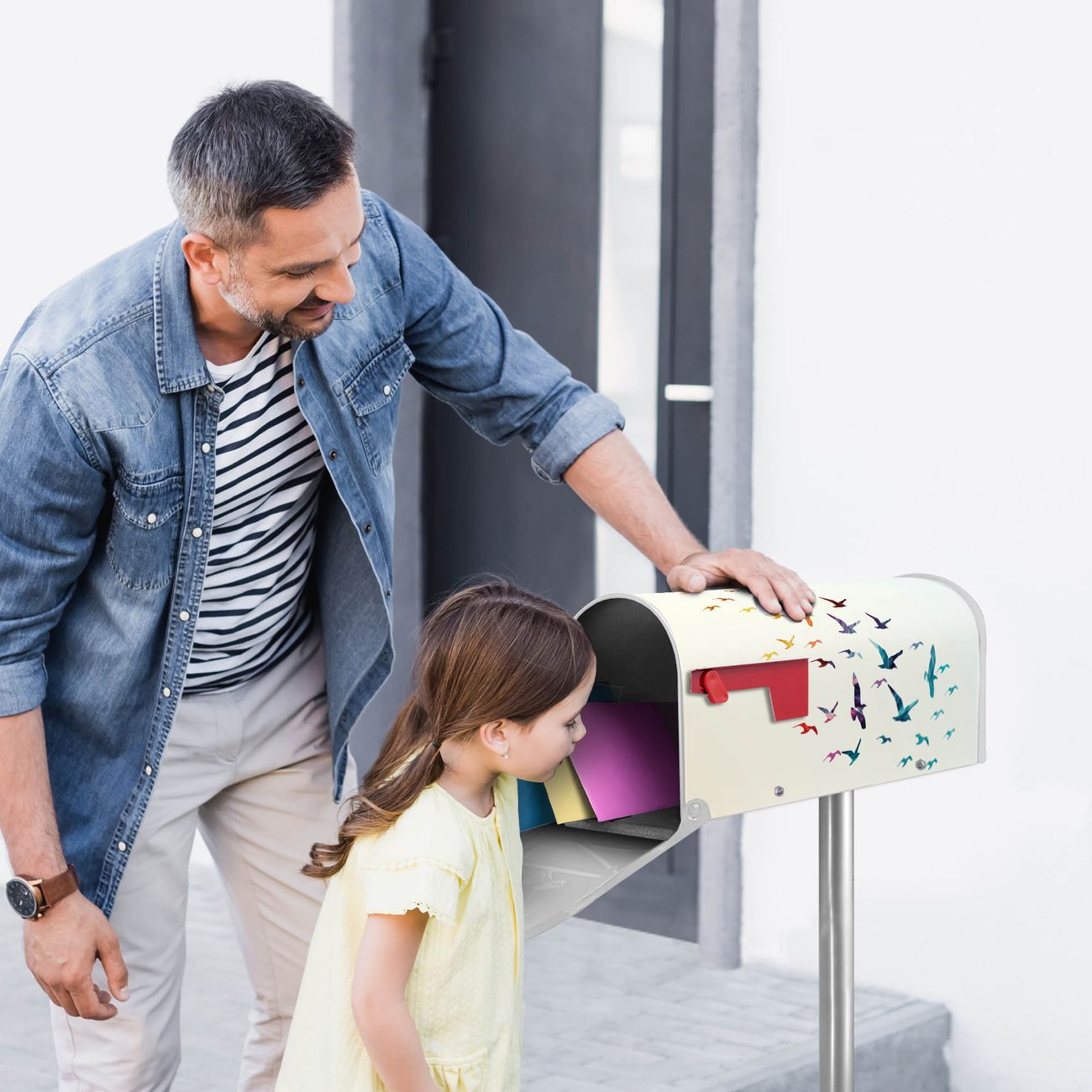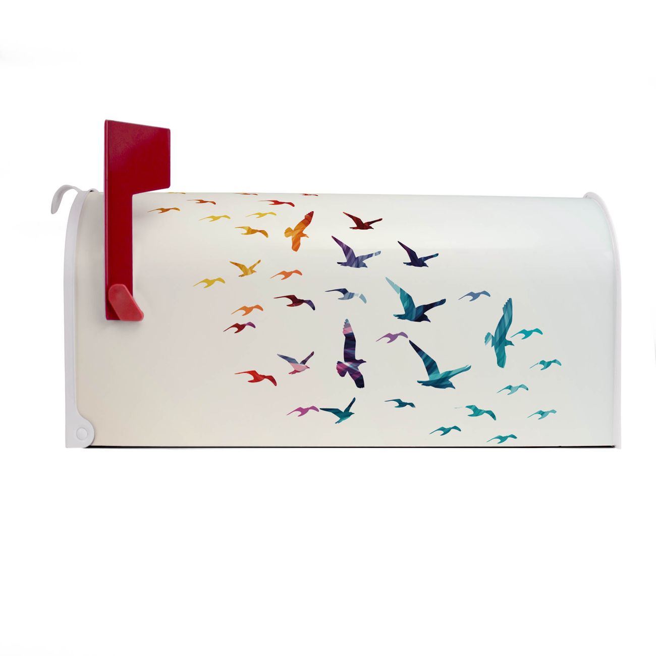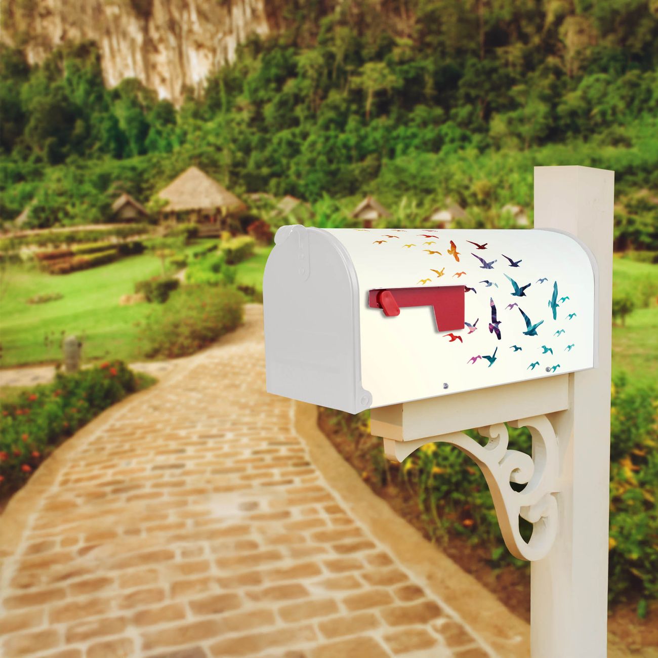 Der amerikanische Briefkasten von banjado mit Fliegende Vögel Motiv bietet Ihnen ausreichend Fassungsvermögen, um große A4 Sendungen und Zeitschriften zu empfangen. Die typisch amerikanische rote Fahne zeigt Ihnen an, wenn Sie Post erhalten haben. Die US-Mailbox besteht aus verzinktem Stahlblech welches lackiert wurde und ist 48 x 22 x 16 CM (BxHxT) groß. Die Folie mit Motiv Fliegende Vögel besteht aus einer wetter- und UV-resistenten Folie, die mit einem Schutzlaminat überzogen ist, sodass die US Mailbox zusätzlich vor Kratzern geschützt ist. An der Unterkante sind 4 Löcher je Seite um die Mailbox, typisch amerikanisch, an einem Holzpfahl oder einem Zaun zu befestigen. Auf Wunsch können Sie bei uns den passenden Standfuß oder die passende Wandhalterung kaufen um die US-Mailbox sicher zu befestigen. Wir bieten Ihnen ebenfalls Namensschilder, bereits beschriftet oder frei zu beschriften, und verschiedene selbst gestaltete Bitte-Keine-Werbung-Aufkleber.