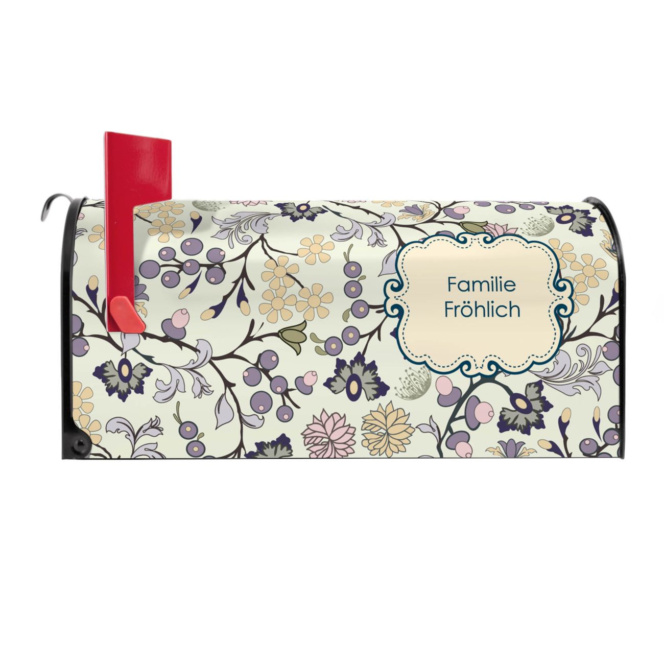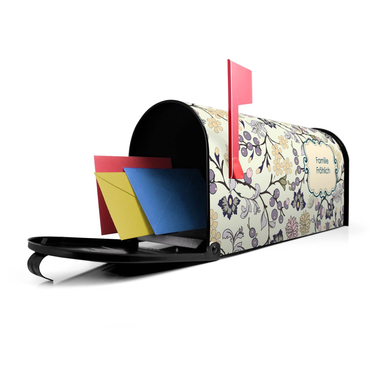Der amerikanische Briefkasten von banjado mit Florale Tapete Motiv bietet Ihnen ausreichend Fassungsvermögen, um große A4 Sendungen und Zeitschriften zu empfangen. Die typisch amerikanische rote Fahne zeigt Ihnen an, wenn Sie Post erhalten haben. Die US-Mailbox besteht aus verzinktem Stahlblech welches lackiert wurde und ist 48 x 22 x 16 CM (BxHxT) groß. Die Folie mit Motiv Florale Tapete besteht aus einer wetter- und UV-resistenten Folie, die mit einem Schutzlaminat überzogen ist, sodass die US Mailbox zusätzlich vor Kratzern geschützt ist. An der Unterkante sind 4 Löcher je Seite um die Mailbox, typisch amerikanisch, an einem Holzpfahl oder einem Zaun zu befestigen. Auf Wunsch können Sie bei uns den passenden Standfuß oder die passende Wandhalterung kaufen um die US-Mailbox sicher zu befestigen. Wir bieten Ihnen ebenfalls Namensschilder, bereits beschriftet oder frei zu beschriften, und verschiedene selbst gestaltete Bitte-Keine-Werbung-Aufkleber.