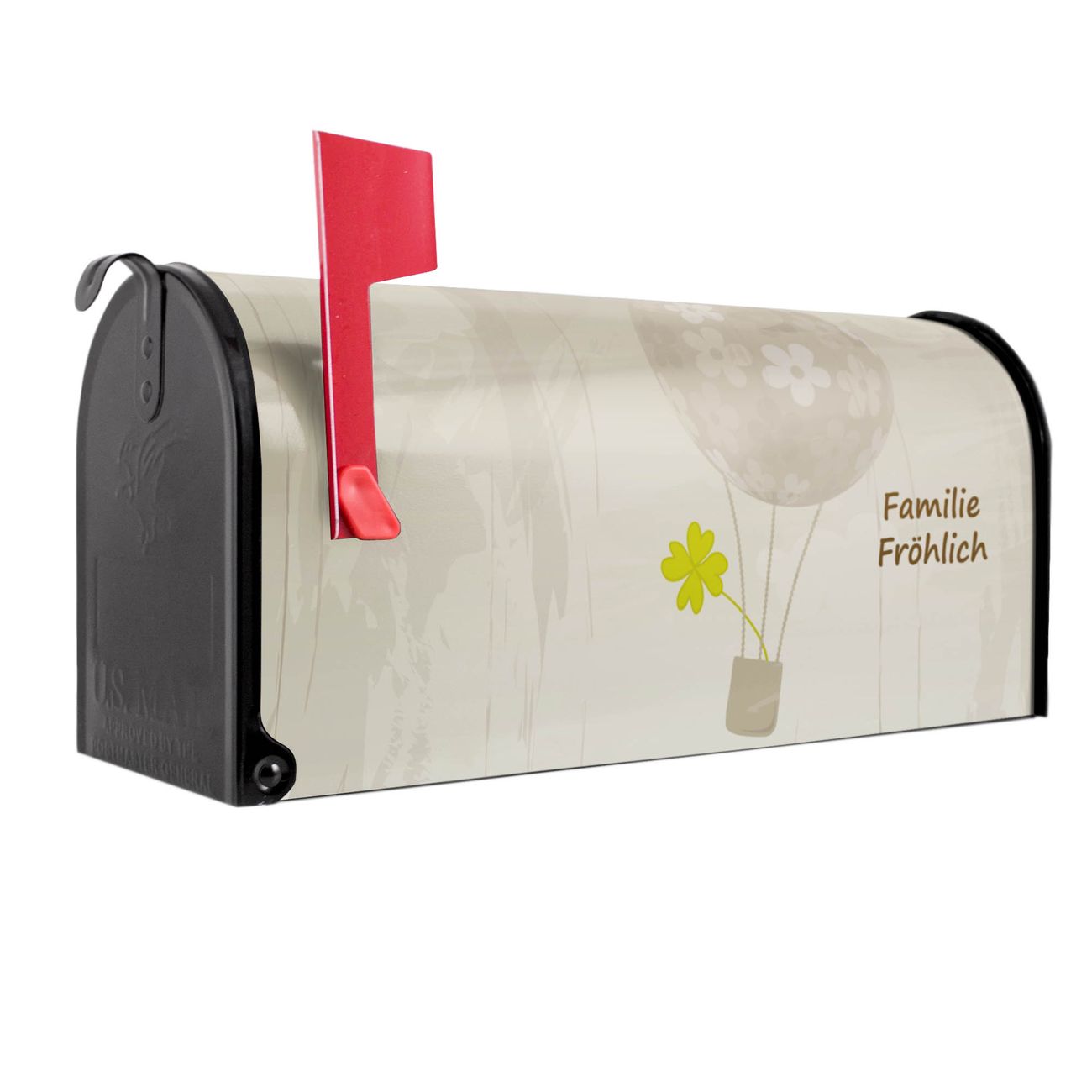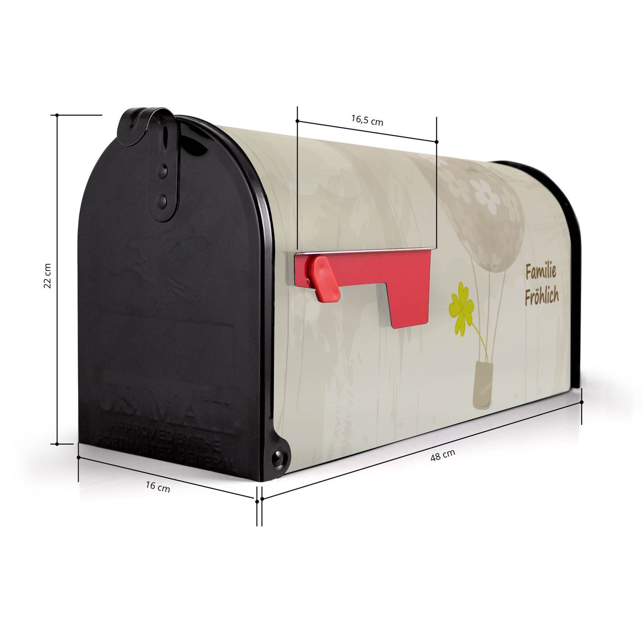 Der amerikanische Briefkasten von banjado mit Flüchtiges Glück Motiv bietet Ihnen ausreichend Fassungsvermögen, um große A4 Sendungen und Zeitschriften zu empfangen. Die typisch amerikanische rote Fahne zeigt Ihnen an, wenn Sie Post erhalten haben. Die US-Mailbox besteht aus verzinktem Stahlblech welches lackiert wurde und ist 48 x 22 x 16 CM (BxHxT) groß. Die Folie mit Motiv Flüchtiges Glück besteht aus einer wetter- und UV-resistenten Folie, die mit einem Schutzlaminat überzogen ist, sodass die US Mailbox zusätzlich vor Kratzern geschützt ist. An der Unterkante sind 4 Löcher je Seite um die Mailbox, typisch amerikanisch, an einem Holzpfahl oder einem Zaun zu befestigen. Auf Wunsch können Sie bei uns den passenden Standfuß oder die passende Wandhalterung kaufen um die US-Mailbox sicher zu befestigen. Wir bieten Ihnen ebenfalls Namensschilder, bereits beschriftet oder frei zu beschriften, und verschiedene selbst gestaltete Bitte-Keine-Werbung-Aufkleber.