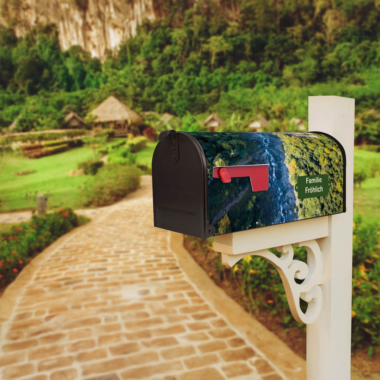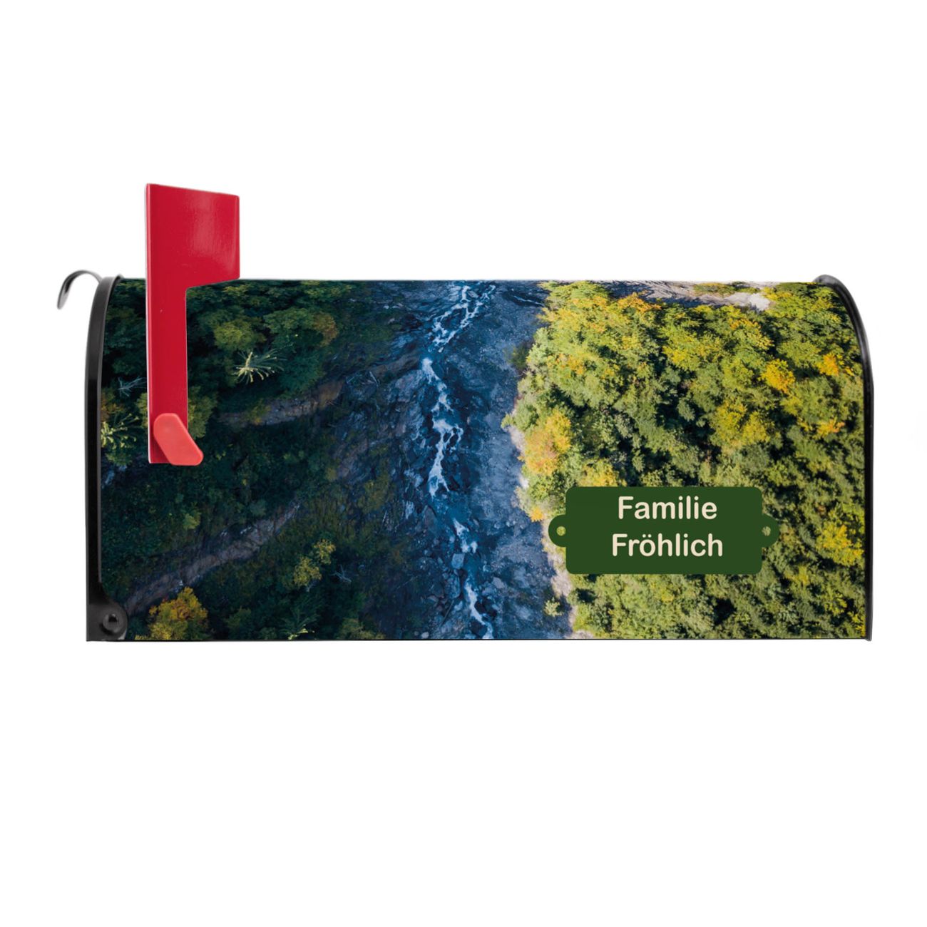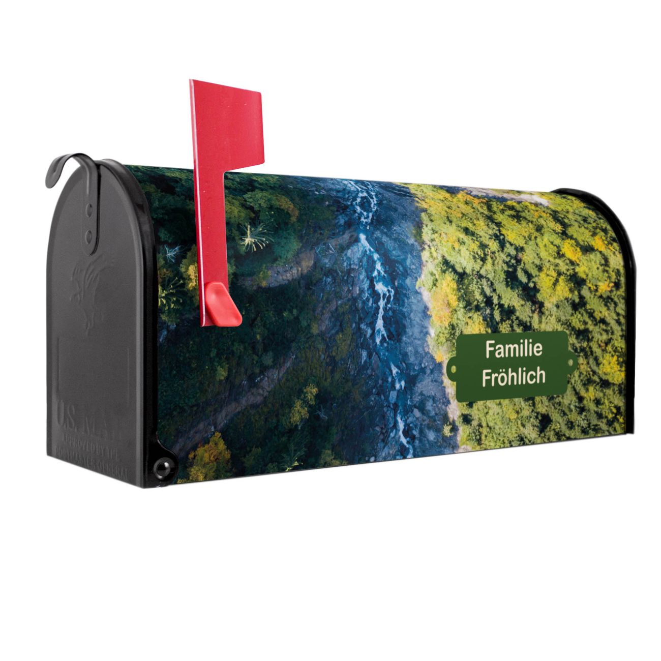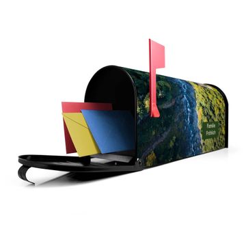 Der amerikanische Briefkasten von banjado mit Fluss im Tal Motiv bietet Ihnen ausreichend Fassungsvermögen, um große A4 Sendungen und Zeitschriften zu empfangen. Die typisch amerikanische rote Fahne zeigt Ihnen an, wenn Sie Post erhalten haben. Die US-Mailbox besteht aus verzinktem Stahlblech welches lackiert wurde und ist 48 x 22 x 16 CM (BxHxT) groß. Die Folie mit Motiv Fluss im Tal besteht aus einer wetter- und UV-resistenten Folie, die mit einem Schutzlaminat überzogen ist, sodass die US Mailbox zusätzlich vor Kratzern geschützt ist. An der Unterkante sind 4 Löcher je Seite um die Mailbox, typisch amerikanisch, an einem Holzpfahl oder einem Zaun zu befestigen. Auf Wunsch können Sie bei uns den passenden Standfuß oder die passende Wandhalterung kaufen um die US-Mailbox sicher zu befestigen. Wir bieten Ihnen ebenfalls Namensschilder, bereits beschriftet oder frei zu beschriften, und verschiedene selbst gestaltete Bitte-Keine-Werbung-Aufkleber.