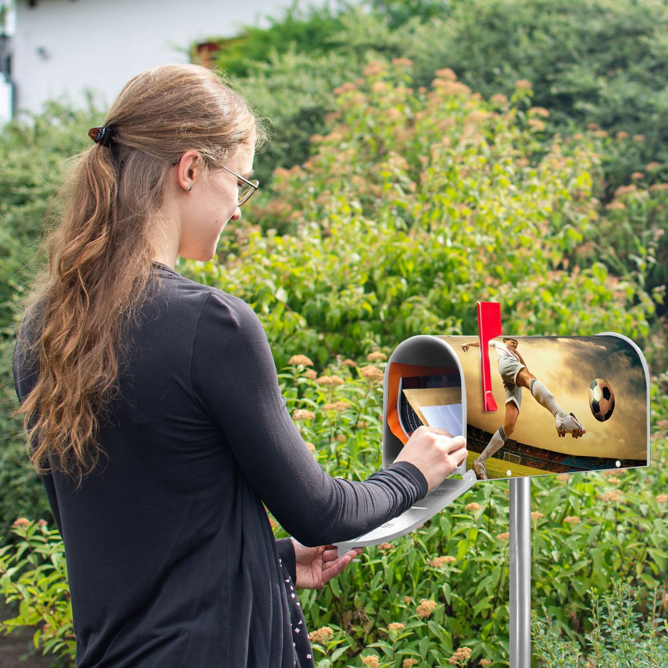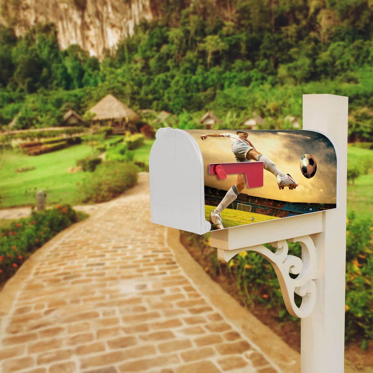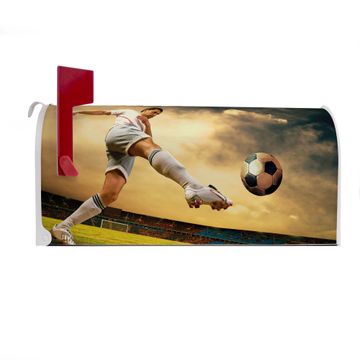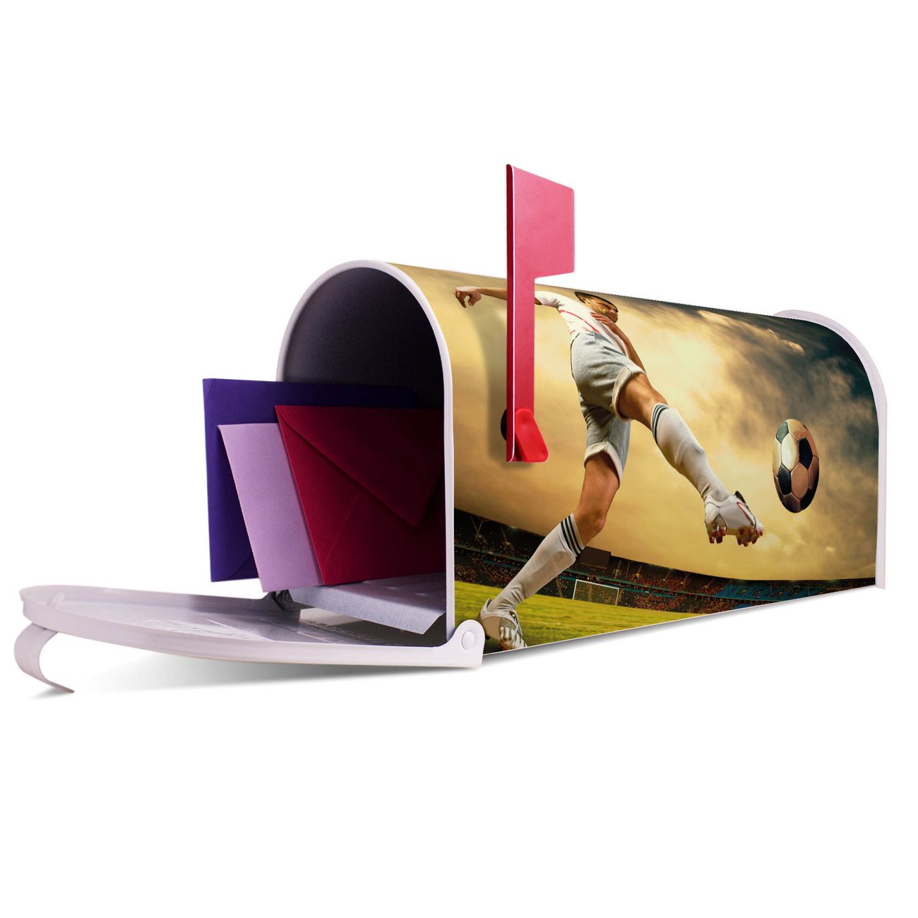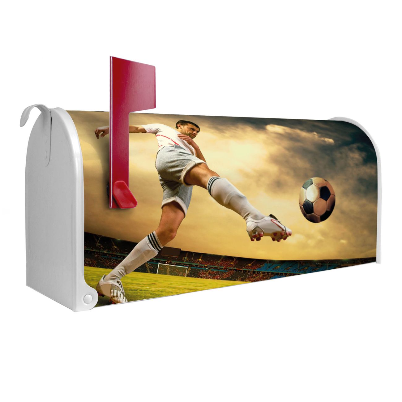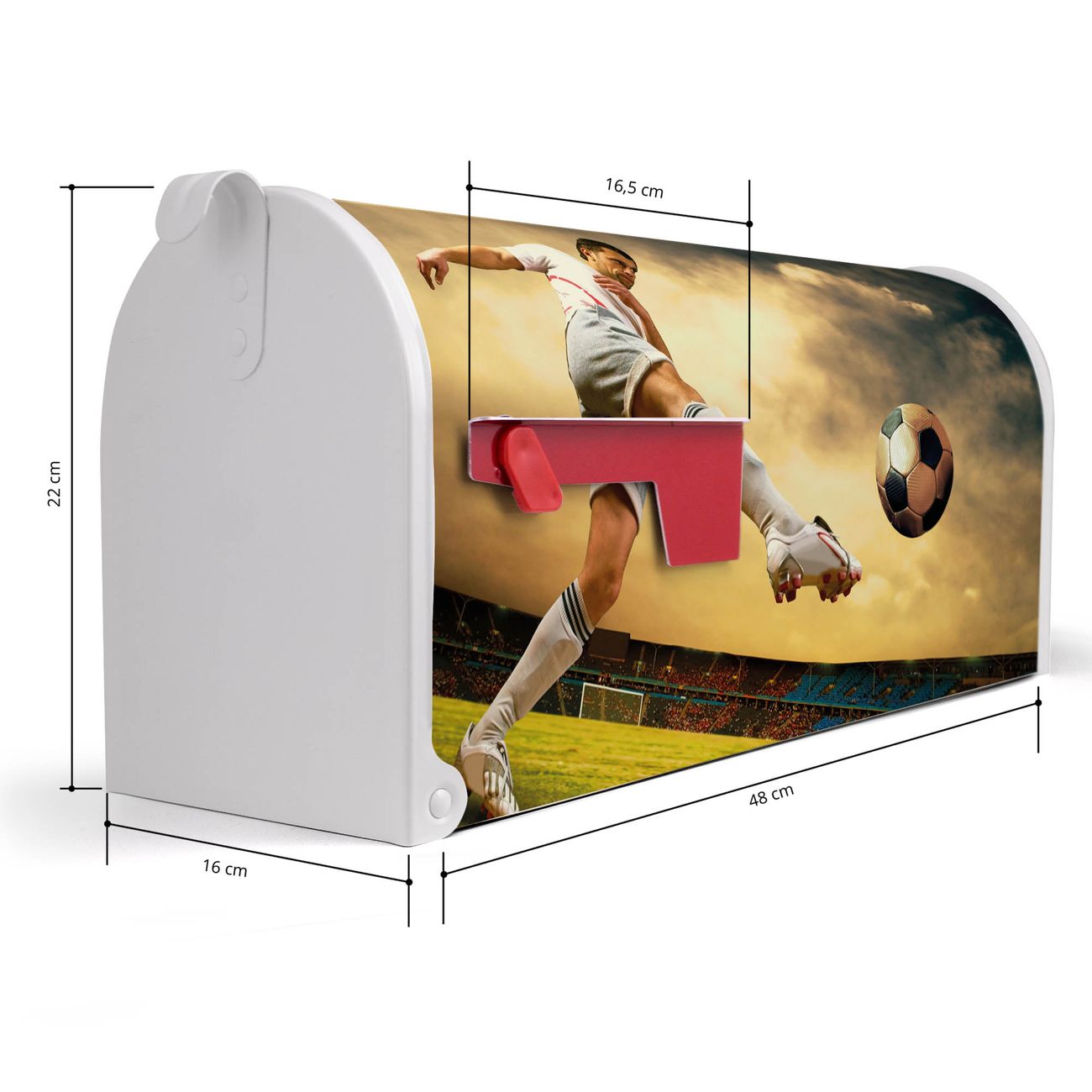 Der amerikanische Briefkasten von banjado mit Football Motiv bietet Ihnen ausreichend Fassungsvermögen, um große A4 Sendungen und Zeitschriften zu empfangen. Die typisch amerikanische rote Fahne zeigt Ihnen an, wenn Sie Post erhalten haben. Die US-Mailbox besteht aus verzinktem Stahlblech welches lackiert wurde und ist 48 x 22 x 16 CM (BxHxT) groß. Die Folie mit Motiv Football besteht aus einer wetter- und UV-resistenten Folie, die mit einem Schutzlaminat überzogen ist, sodass die US Mailbox zusätzlich vor Kratzern geschützt ist. An der Unterkante sind 4 Löcher je Seite um die Mailbox, typisch amerikanisch, an einem Holzpfahl oder einem Zaun zu befestigen. Auf Wunsch können Sie bei uns den passenden Standfuß oder die passende Wandhalterung kaufen um die US-Mailbox sicher zu befestigen. Wir bieten Ihnen ebenfalls Namensschilder, bereits beschriftet oder frei zu beschriften, und verschiedene selbst gestaltete Bitte-Keine-Werbung-Aufkleber.