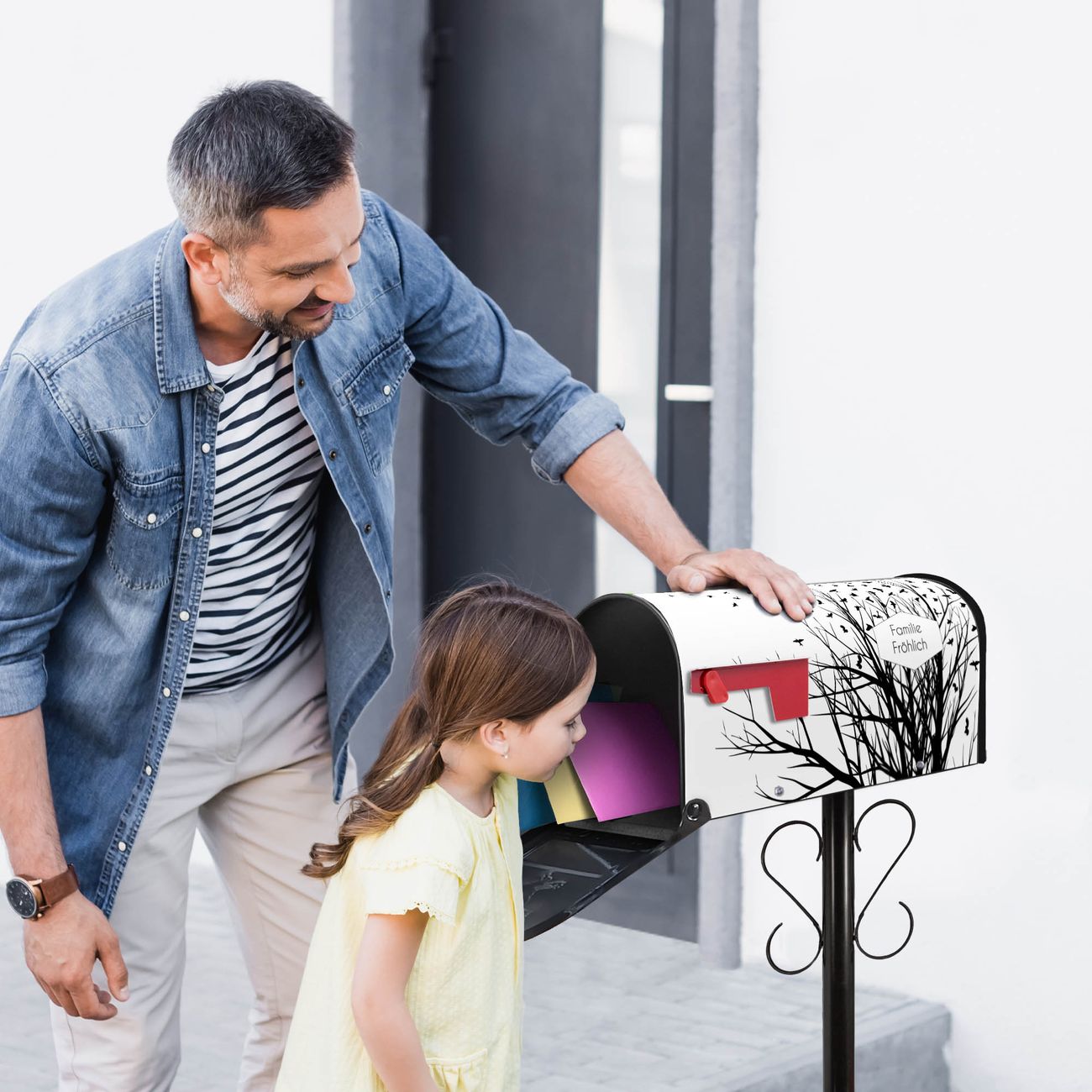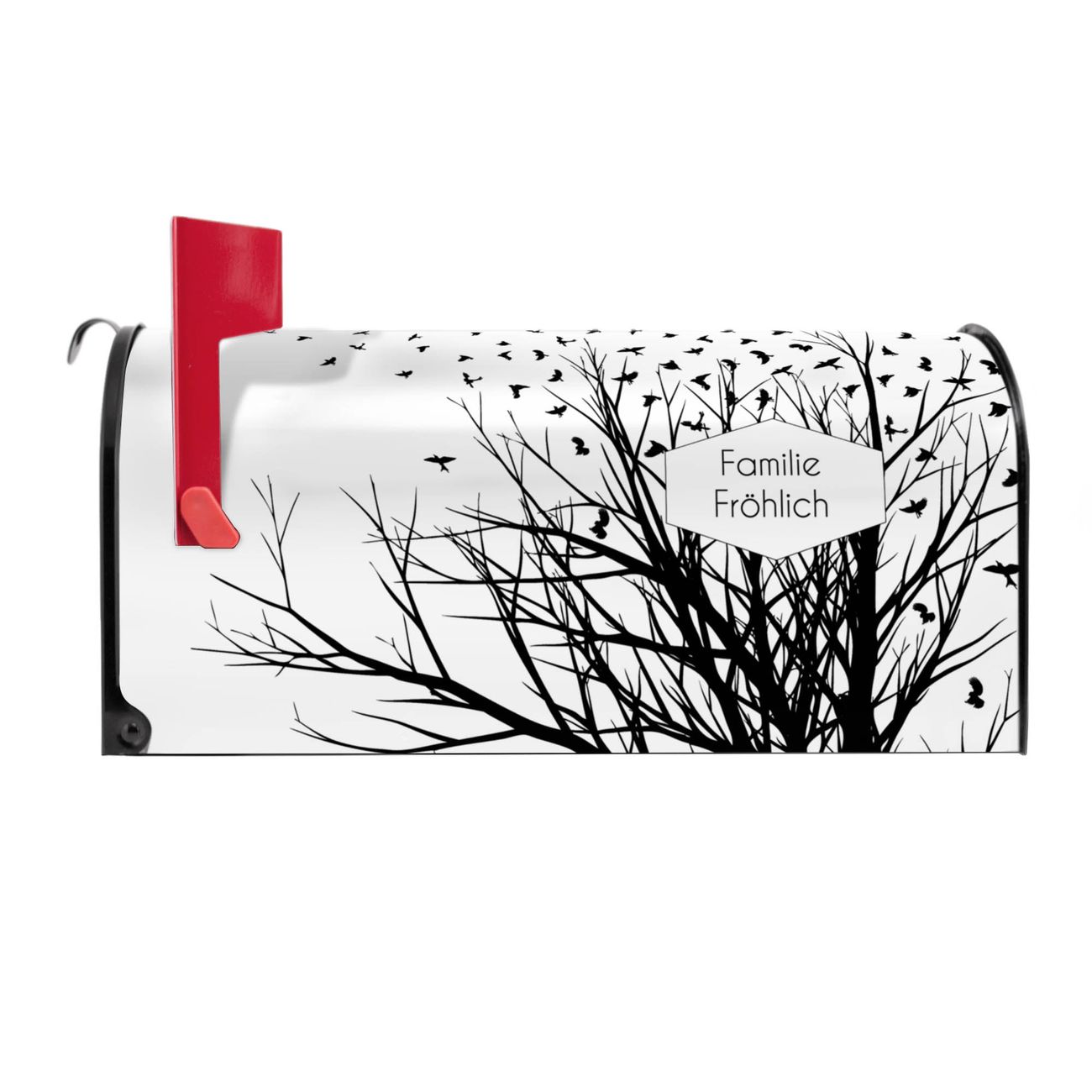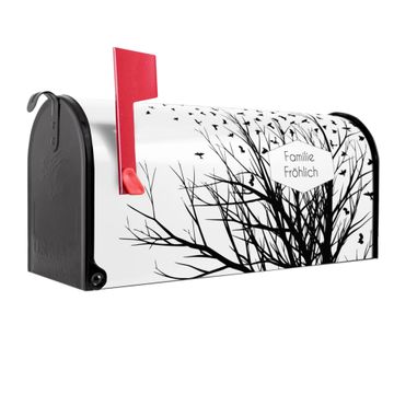 Der amerikanische Briefkasten von banjado mit Fortfliegen Motiv bietet Ihnen ausreichend Fassungsvermögen, um große A4 Sendungen und Zeitschriften zu empfangen. Die typisch amerikanische rote Fahne zeigt Ihnen an, wenn Sie Post erhalten haben. Die US-Mailbox besteht aus verzinktem Stahlblech welches lackiert wurde und ist 48 x 22 x 16 CM (BxHxT) groß. Die Folie mit Motiv Fortfliegen besteht aus einer wetter- und UV-resistenten Folie, die mit einem Schutzlaminat überzogen ist, sodass die US Mailbox zusätzlich vor Kratzern geschützt ist. An der Unterkante sind 4 Löcher je Seite um die Mailbox, typisch amerikanisch, an einem Holzpfahl oder einem Zaun zu befestigen. Auf Wunsch können Sie bei uns den passenden Standfuß oder die passende Wandhalterung kaufen um die US-Mailbox sicher zu befestigen. Wir bieten Ihnen ebenfalls Namensschilder, bereits beschriftet oder frei zu beschriften, und verschiedene selbst gestaltete Bitte-Keine-Werbung-Aufkleber.