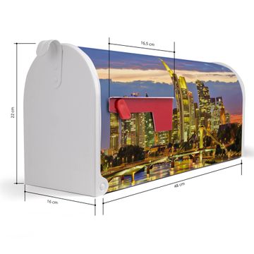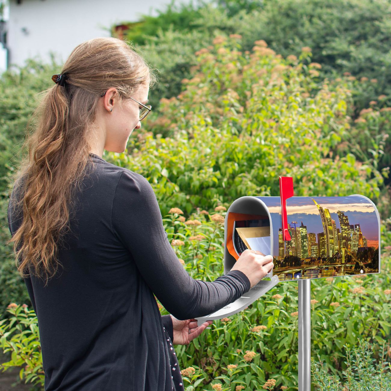Der amerikanische Briefkasten von banjado mit Frankfurt Main Motiv bietet Ihnen ausreichend Fassungsvermögen, um große A4 Sendungen und Zeitschriften zu empfangen. Die typisch amerikanische rote Fahne zeigt Ihnen an, wenn Sie Post erhalten haben. Die US-Mailbox besteht aus verzinktem Stahlblech welches lackiert wurde und ist 48 x 22 x 16 CM (BxHxT) groß. Die Folie mit Motiv Frankfurt Main besteht aus einer wetter- und UV-resistenten Folie, die mit einem Schutzlaminat überzogen ist, sodass die US Mailbox zusätzlich vor Kratzern geschützt ist. An der Unterkante sind 4 Löcher je Seite um die Mailbox, typisch amerikanisch, an einem Holzpfahl oder einem Zaun zu befestigen. Auf Wunsch können Sie bei uns den passenden Standfuß oder die passende Wandhalterung kaufen um die US-Mailbox sicher zu befestigen. Wir bieten Ihnen ebenfalls Namensschilder, bereits beschriftet oder frei zu beschriften, und verschiedene selbst gestaltete Bitte-Keine-Werbung-Aufkleber.