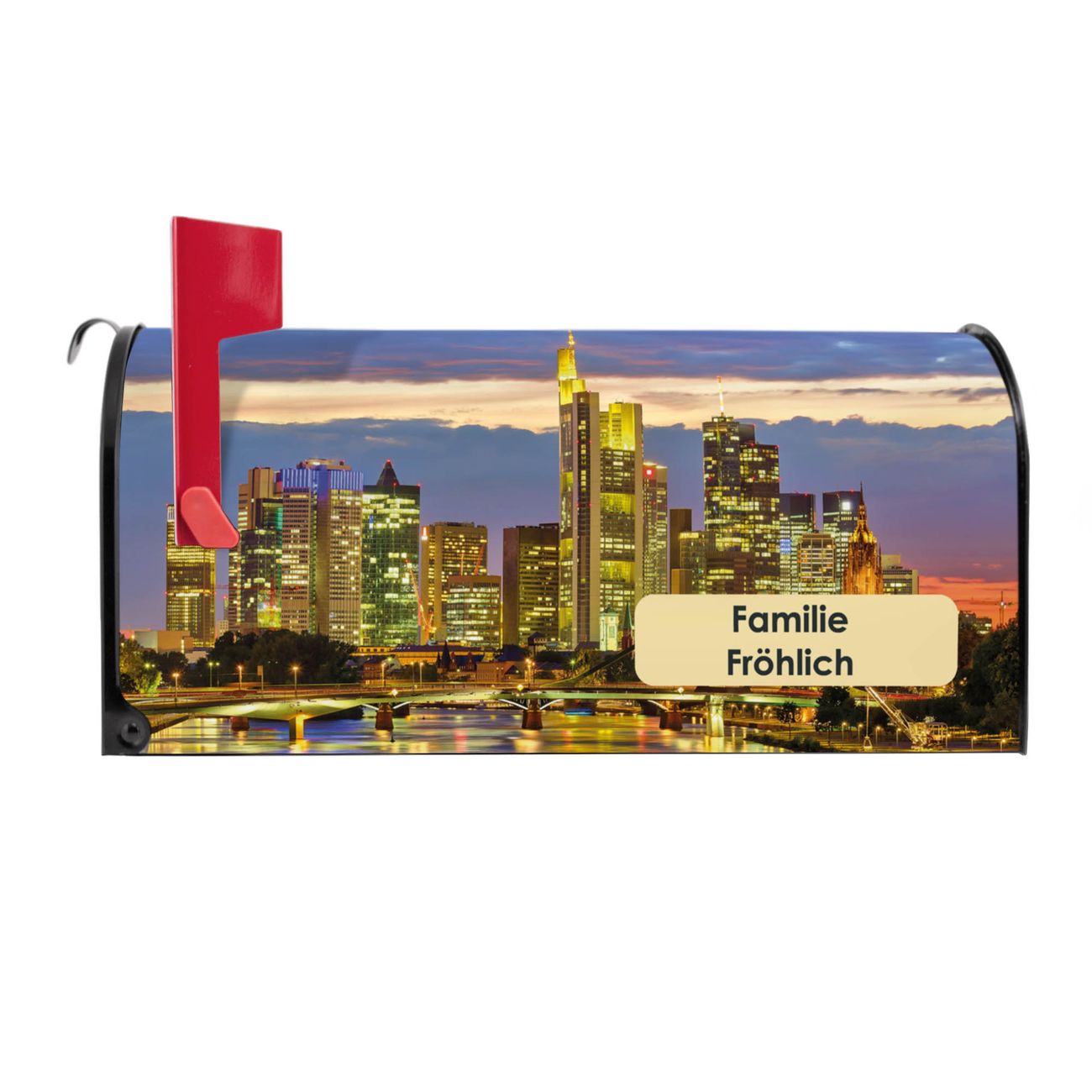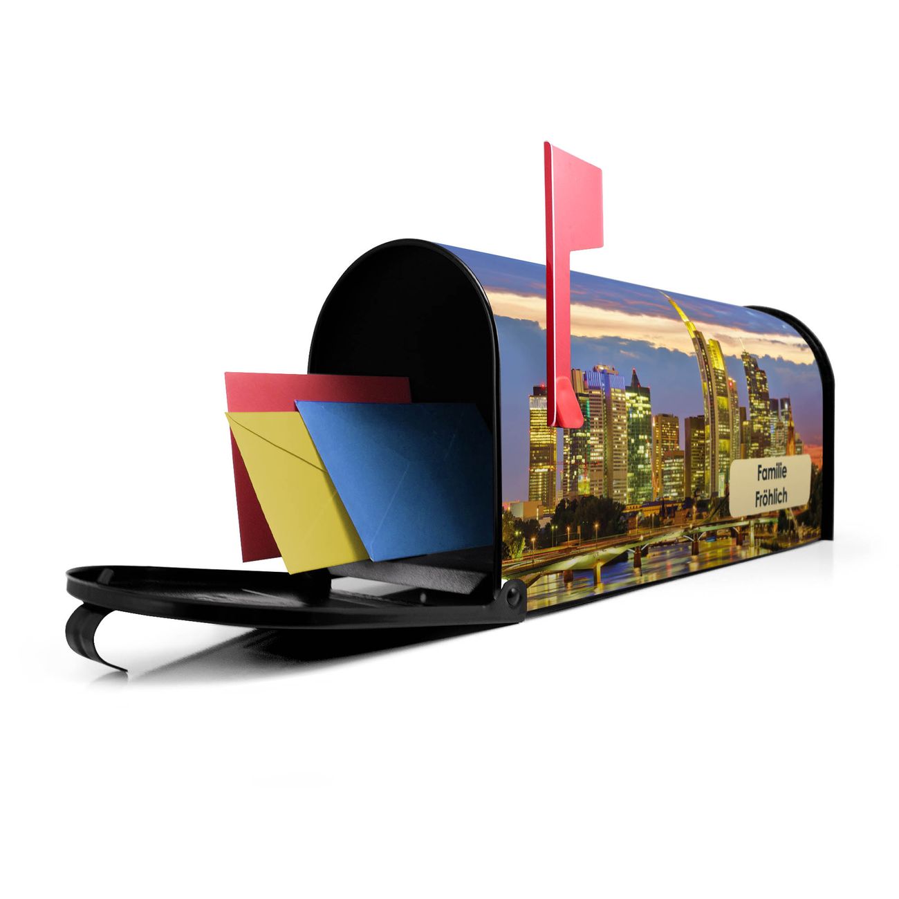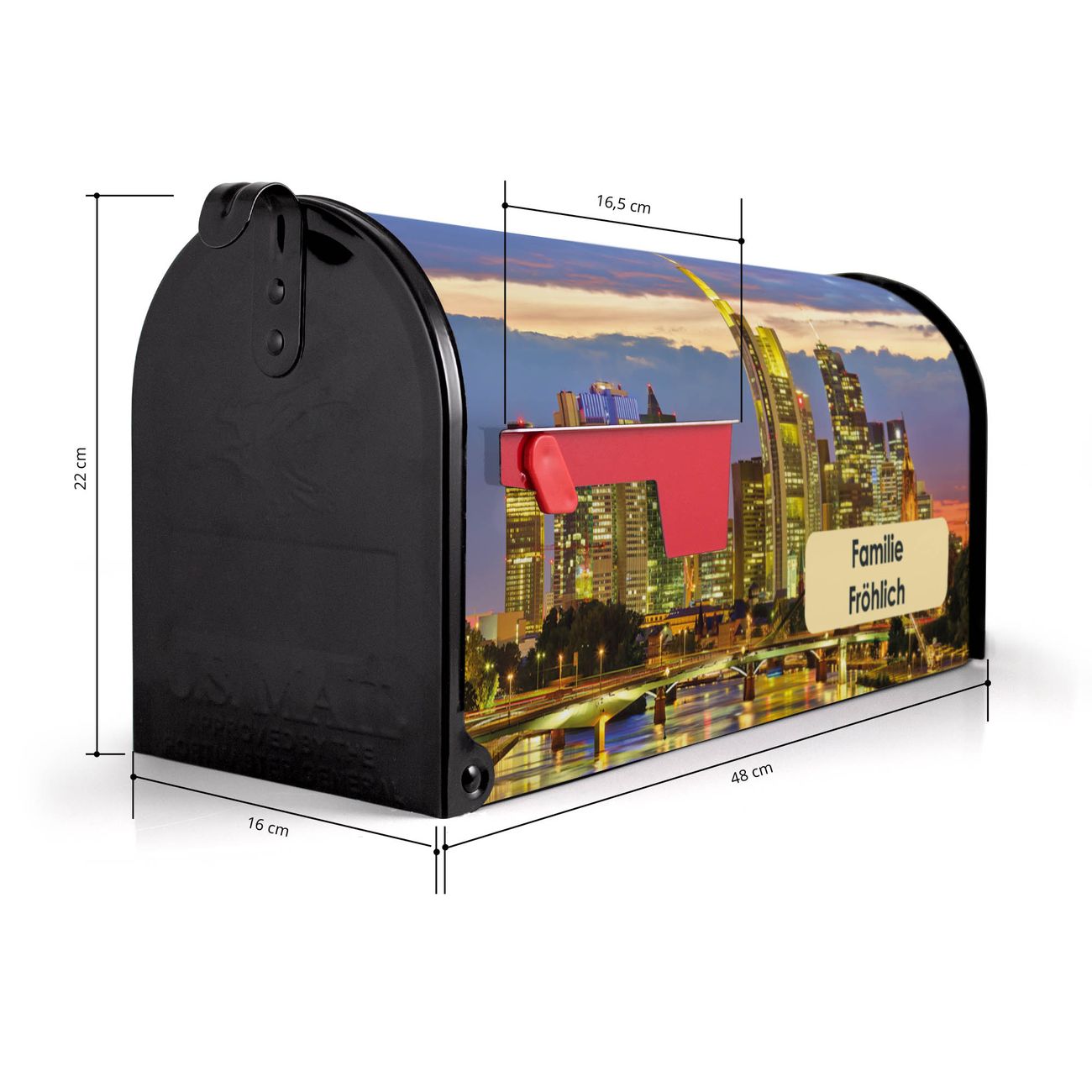 Der amerikanische Briefkasten von banjado mit Frankfurt Main Motiv bietet Ihnen ausreichend Fassungsvermögen, um große A4 Sendungen und Zeitschriften zu empfangen. Die typisch amerikanische rote Fahne zeigt Ihnen an, wenn Sie Post erhalten haben. Die US-Mailbox besteht aus verzinktem Stahlblech welches lackiert wurde und ist 48 x 22 x 16 CM (BxHxT) groß. Die Folie mit Motiv Frankfurt Main besteht aus einer wetter- und UV-resistenten Folie, die mit einem Schutzlaminat überzogen ist, sodass die US Mailbox zusätzlich vor Kratzern geschützt ist. An der Unterkante sind 4 Löcher je Seite um die Mailbox, typisch amerikanisch, an einem Holzpfahl oder einem Zaun zu befestigen. Auf Wunsch können Sie bei uns den passenden Standfuß oder die passende Wandhalterung kaufen um die US-Mailbox sicher zu befestigen. Wir bieten Ihnen ebenfalls Namensschilder, bereits beschriftet oder frei zu beschriften, und verschiedene selbst gestaltete Bitte-Keine-Werbung-Aufkleber.