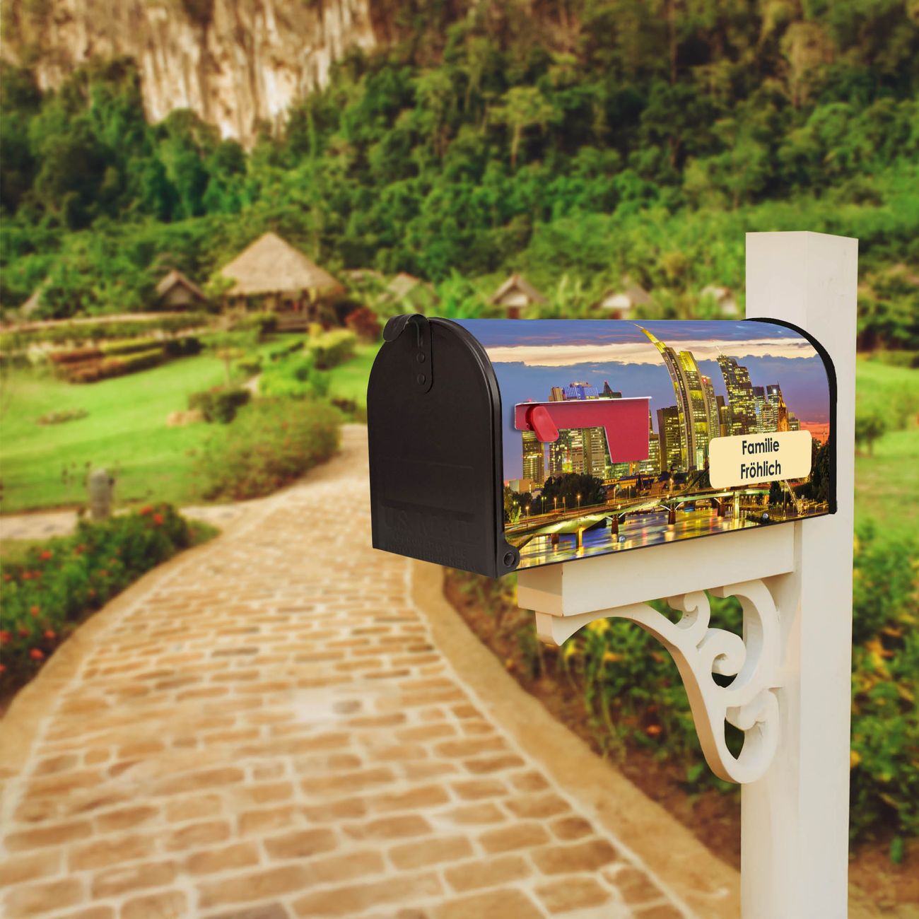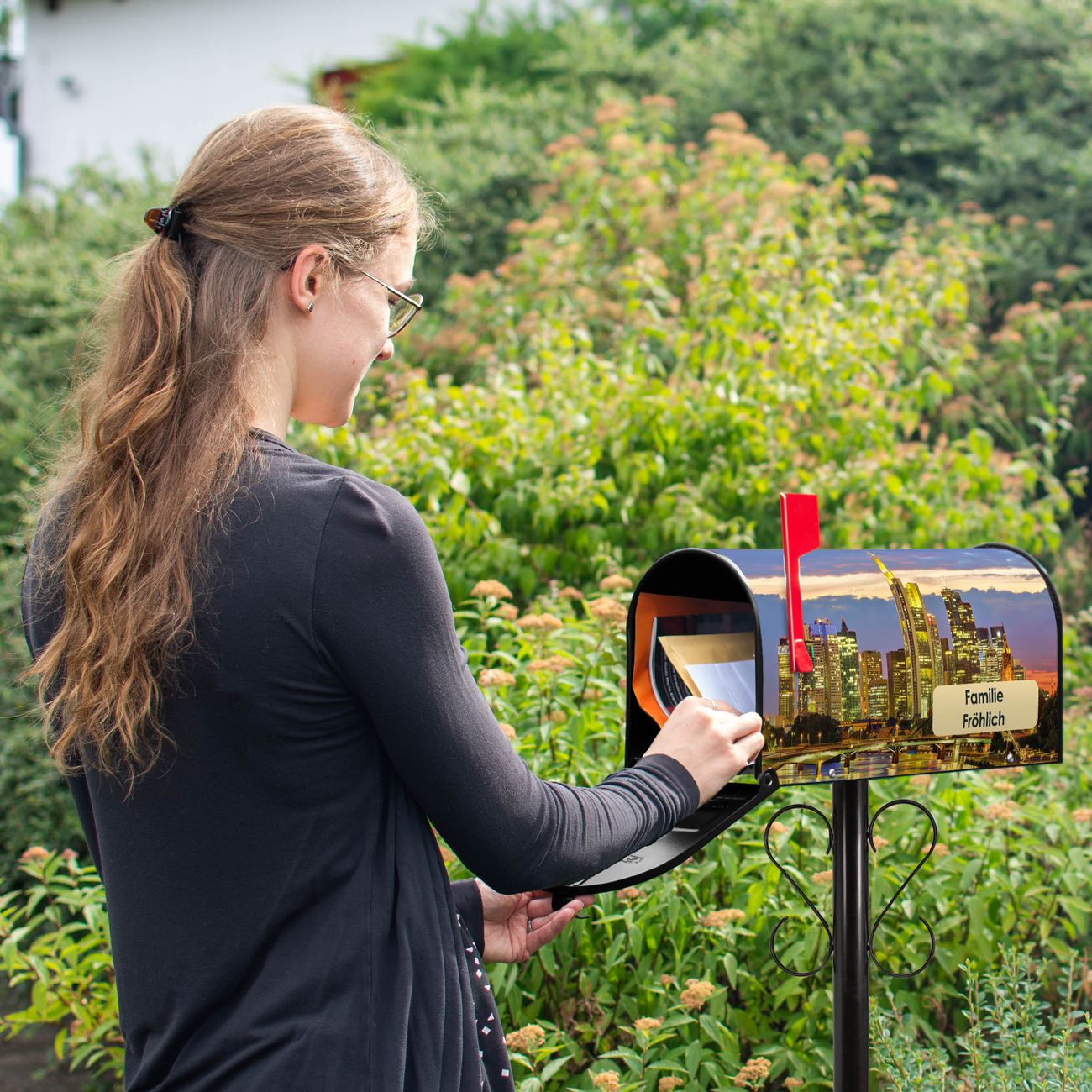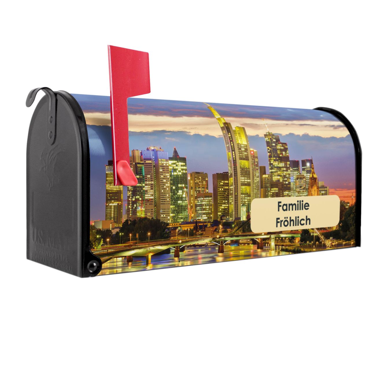 Der amerikanische Briefkasten von banjado mit Frankfurt Main Motiv bietet Ihnen ausreichend Fassungsvermögen, um große A4 Sendungen und Zeitschriften zu empfangen. Die typisch amerikanische rote Fahne zeigt Ihnen an, wenn Sie Post erhalten haben. Die US-Mailbox besteht aus verzinktem Stahlblech welches lackiert wurde und ist 48 x 22 x 16 CM (BxHxT) groß. Die Folie mit Motiv Frankfurt Main besteht aus einer wetter- und UV-resistenten Folie, die mit einem Schutzlaminat überzogen ist, sodass die US Mailbox zusätzlich vor Kratzern geschützt ist. An der Unterkante sind 4 Löcher je Seite um die Mailbox, typisch amerikanisch, an einem Holzpfahl oder einem Zaun zu befestigen. Auf Wunsch können Sie bei uns den passenden Standfuß oder die passende Wandhalterung kaufen um die US-Mailbox sicher zu befestigen. Wir bieten Ihnen ebenfalls Namensschilder, bereits beschriftet oder frei zu beschriften, und verschiedene selbst gestaltete Bitte-Keine-Werbung-Aufkleber.