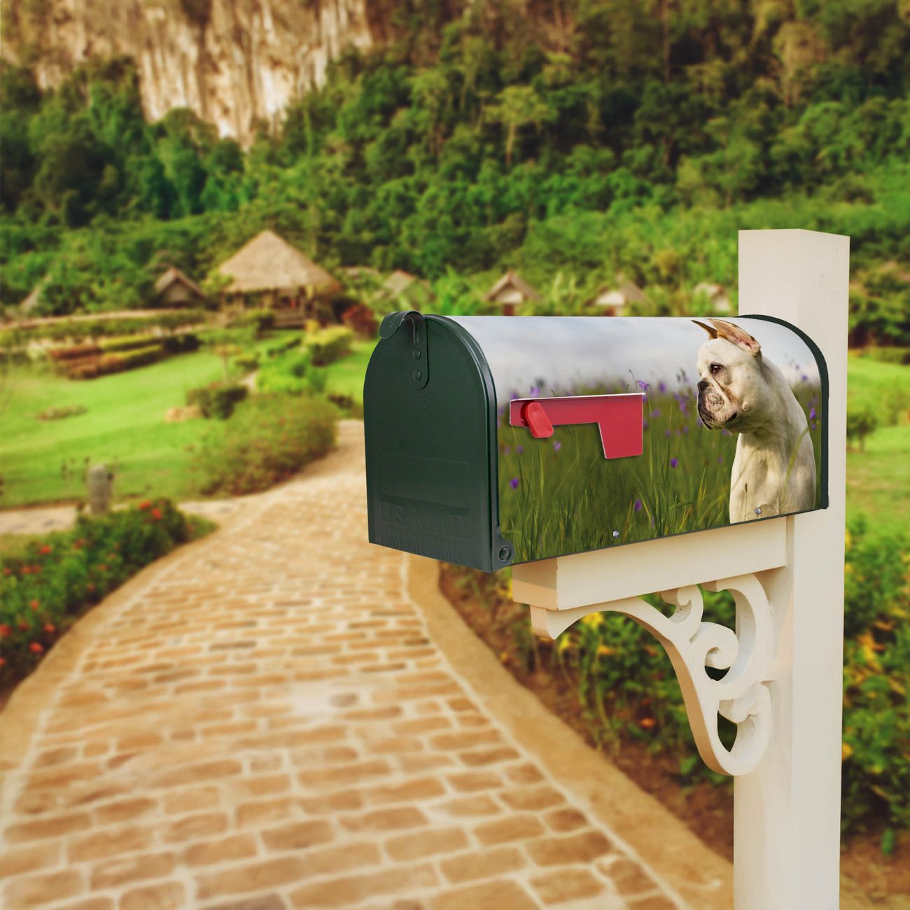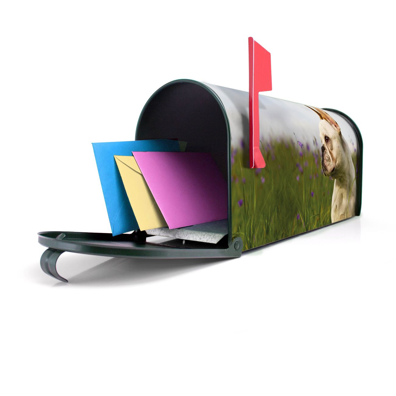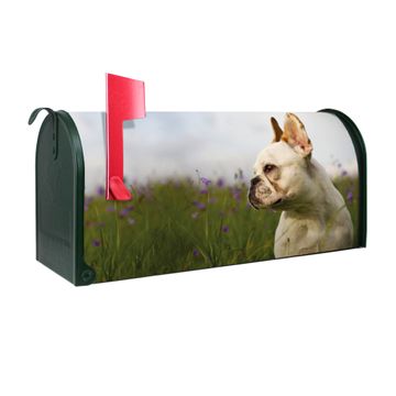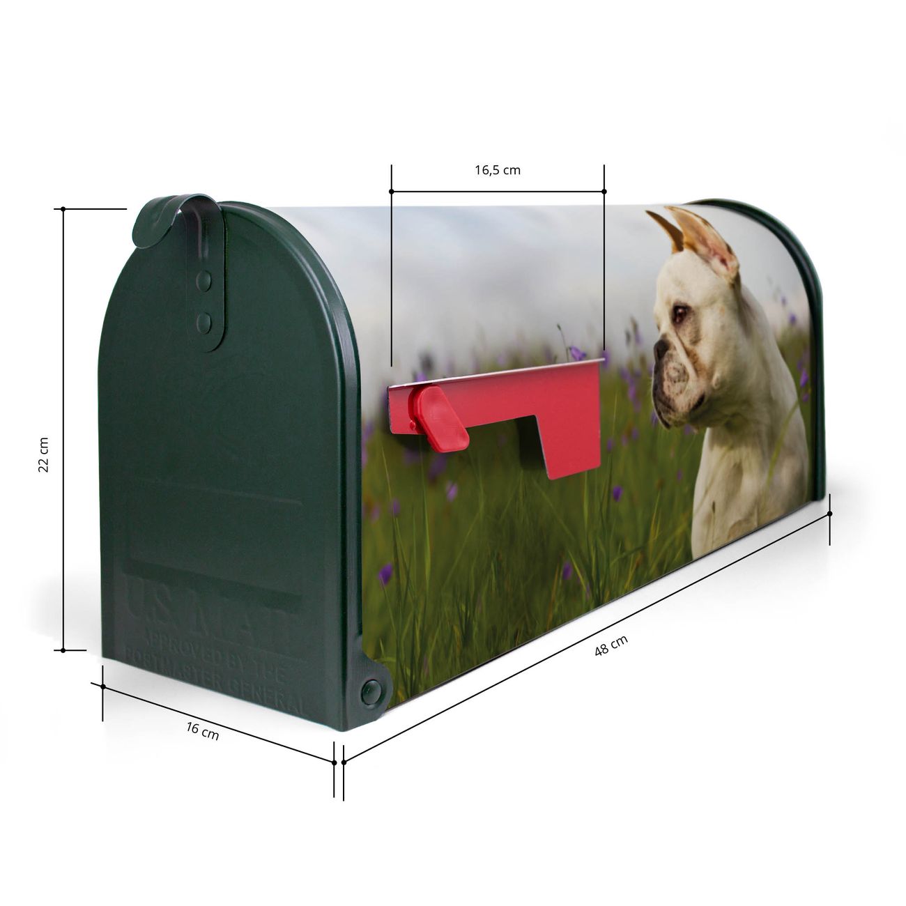 Der amerikanische Briefkasten von banjado mit Französische Bulldogge Motiv bietet Ihnen ausreichend Fassungsvermögen, um große A4 Sendungen und Zeitschriften zu empfangen. Die typisch amerikanische rote Fahne zeigt Ihnen an, wenn Sie Post erhalten haben. Die US-Mailbox besteht aus verzinktem Stahlblech welches lackiert wurde und ist 48 x 22 x 16 CM (BxHxT) groß. Die Folie mit Motiv Französische Bulldogge besteht aus einer wetter- und UV-resistenten Folie, die mit einem Schutzlaminat überzogen ist, sodass die US Mailbox zusätzlich vor Kratzern geschützt ist. An der Unterkante sind 4 Löcher je Seite um die Mailbox, typisch amerikanisch, an einem Holzpfahl oder einem Zaun zu befestigen. Auf Wunsch können Sie bei uns den passenden Standfuß oder die passende Wandhalterung kaufen um die US-Mailbox sicher zu befestigen. Wir bieten Ihnen ebenfalls Namensschilder, bereits beschriftet oder frei zu beschriften, und verschiedene selbst gestaltete Bitte-Keine-Werbung-Aufkleber.