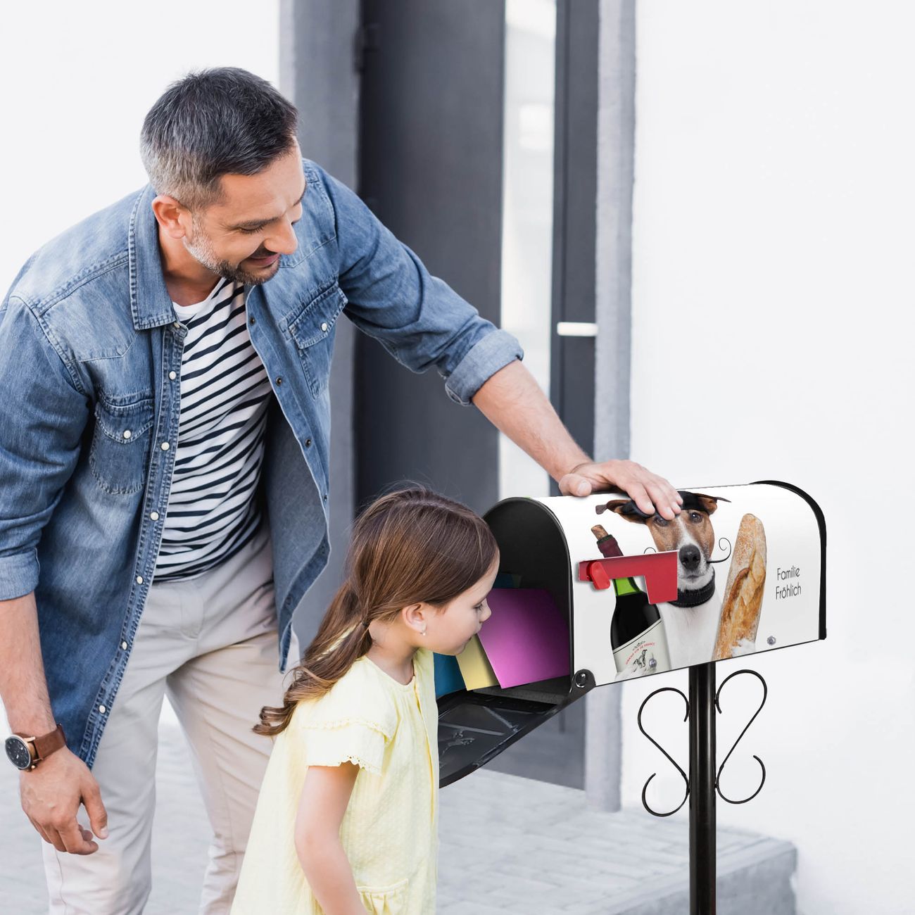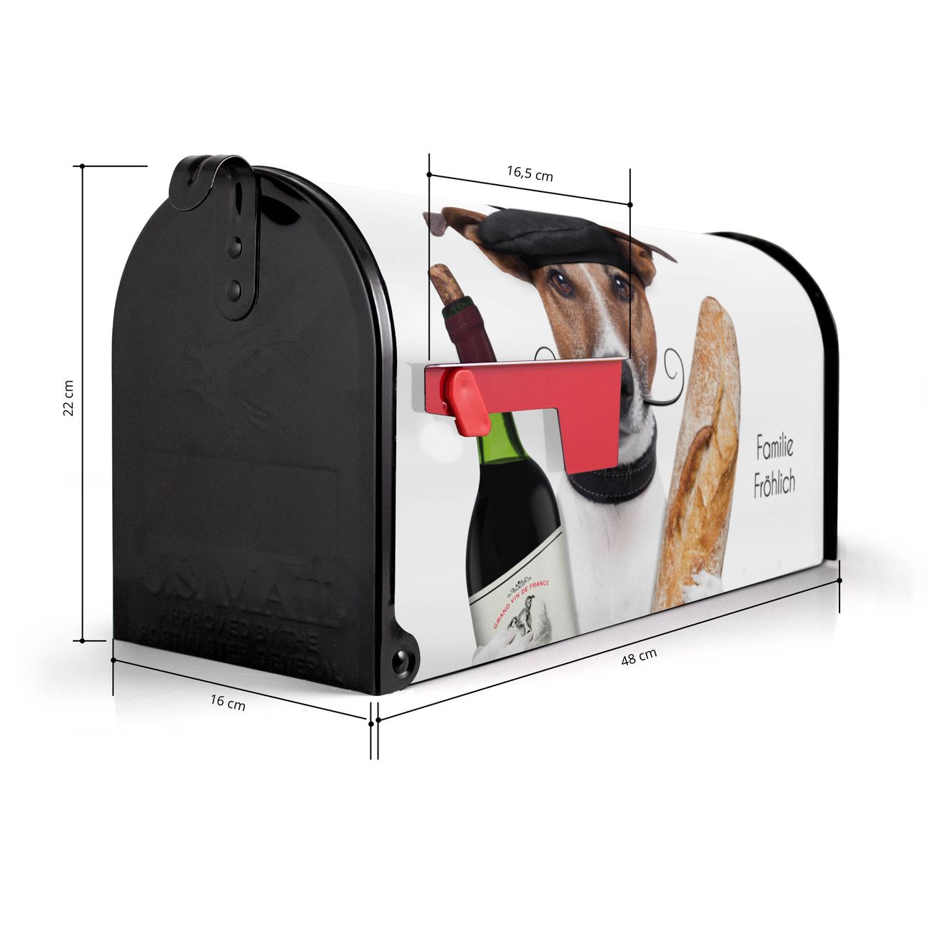 Unser amerikanischer Briefkasten mit dem Motiv Franzose Jack Russel hat ein sehr ansprechendes und ausgefallenes Design, ist in der Grundfarbe weiß, grün oder schwarz erhältlich. Damit entlocken Sie Ihren Nachbarn und dem Postboten immer wieder ein Lächeln. Die Mailbox ist ein Original Import aus Mississippi USA und wird von unserer kleinen Manufaktur in Sachsen von Hand veredelt. Die US-Mailbox bietet ausreichend Platz auch für große Sendungen, eine Fahne die Ihnen Post anzeigt, wetterfestes und äußerst stabiles Material - so macht Post empfangen Freude.