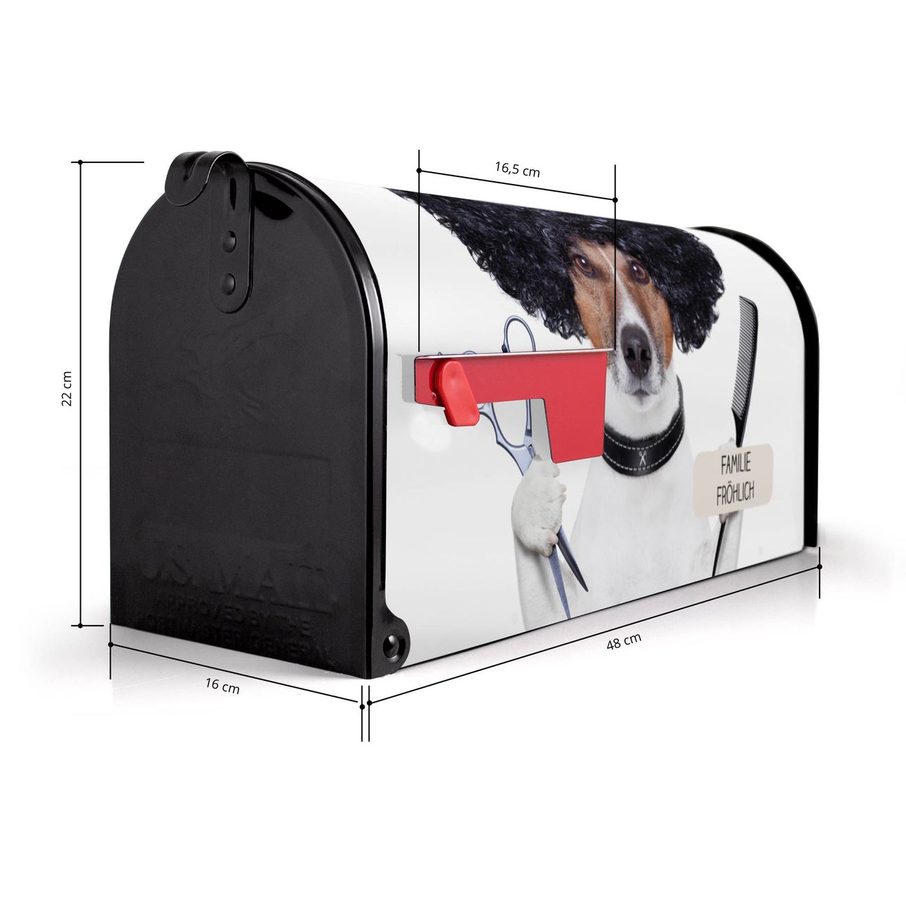 Der amerikanische Briefkasten von banjado mit Friseur Jack Russel Motiv bietet Ihnen ausreichend Fassungsvermögen, um große A4 Sendungen und Zeitschriften zu empfangen. Die typisch amerikanische rote Fahne zeigt Ihnen an, wenn Sie Post erhalten haben. Die US-Mailbox besteht aus verzinktem Stahlblech welches lackiert wurde und ist 48 x 22 x 16 CM (BxHxT) groß. Die Folie mit Motiv Friseur Jack Russel besteht aus einer wetter- und UV-resistenten Folie, die mit einem Schutzlaminat überzogen ist, sodass die US Mailbox zusätzlich vor Kratzern geschützt ist. An der Unterkante sind 4 Löcher je Seite um die Mailbox, typisch amerikanisch, an einem Holzpfahl oder einem Zaun zu befestigen. Auf Wunsch können Sie bei uns den passenden Standfuß oder die passende Wandhalterung kaufen um die US-Mailbox sicher zu befestigen. Wir bieten Ihnen ebenfalls Namensschilder, bereits beschriftet oder frei zu beschriften, und verschiedene selbst gestaltete Bitte-Keine-Werbung-Aufkleber.