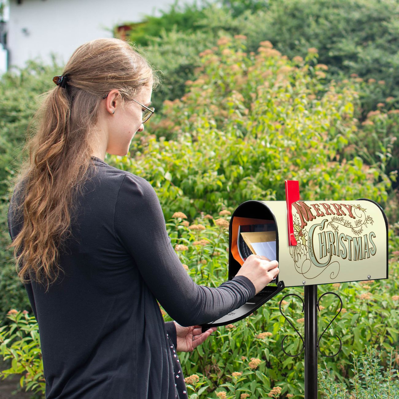 Unser amerikanischer Briefkasten mit dem Motiv Frohes Fest hat ein sehr ansprechendes und ausgefallenes Design, ist in der Grundfarbe weiß, grün oder schwarz erhältlich. Damit entlocken Sie Ihren Nachbarn und dem Postboten immer wieder ein Lächeln. Die Mailbox ist ein Original Import aus Mississippi USA und wird von unserer kleinen Manufaktur in Sachsen von Hand veredelt. Die US-Mailbox bietet ausreichend Platz auch für große Sendungen, eine Fahne die Ihnen Post anzeigt, wetterfestes und äußerst stabiles Material - so macht Post empfangen Freude.