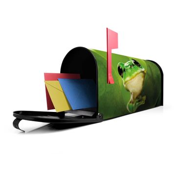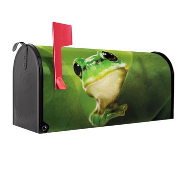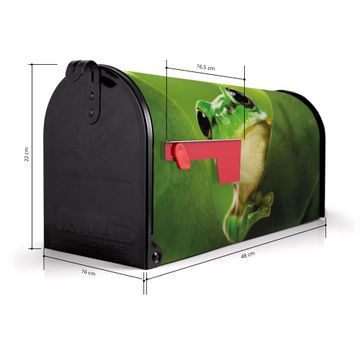 Der amerikanische Briefkasten von banjado mit Frosch Motiv bietet Ihnen ausreichend Fassungsvermögen, um große A4 Sendungen und Zeitschriften zu empfangen. Die typisch amerikanische rote Fahne zeigt Ihnen an, wenn Sie Post erhalten haben. Die US-Mailbox besteht aus verzinktem Stahlblech welches lackiert wurde und ist 48 x 22 x 16 CM (BxHxT) groß. Die Folie mit Motiv Frosch besteht aus einer wetter- und UV-resistenten Folie, die mit einem Schutzlaminat überzogen ist, sodass die US Mailbox zusätzlich vor Kratzern geschützt ist. An der Unterkante sind 4 Löcher je Seite um die Mailbox, typisch amerikanisch, an einem Holzpfahl oder einem Zaun zu befestigen. Auf Wunsch können Sie bei uns den passenden Standfuß oder die passende Wandhalterung kaufen um die US-Mailbox sicher zu befestigen. Wir bieten Ihnen ebenfalls Namensschilder, bereits beschriftet oder frei zu beschriften, und verschiedene selbst gestaltete Bitte-Keine-Werbung-Aufkleber.