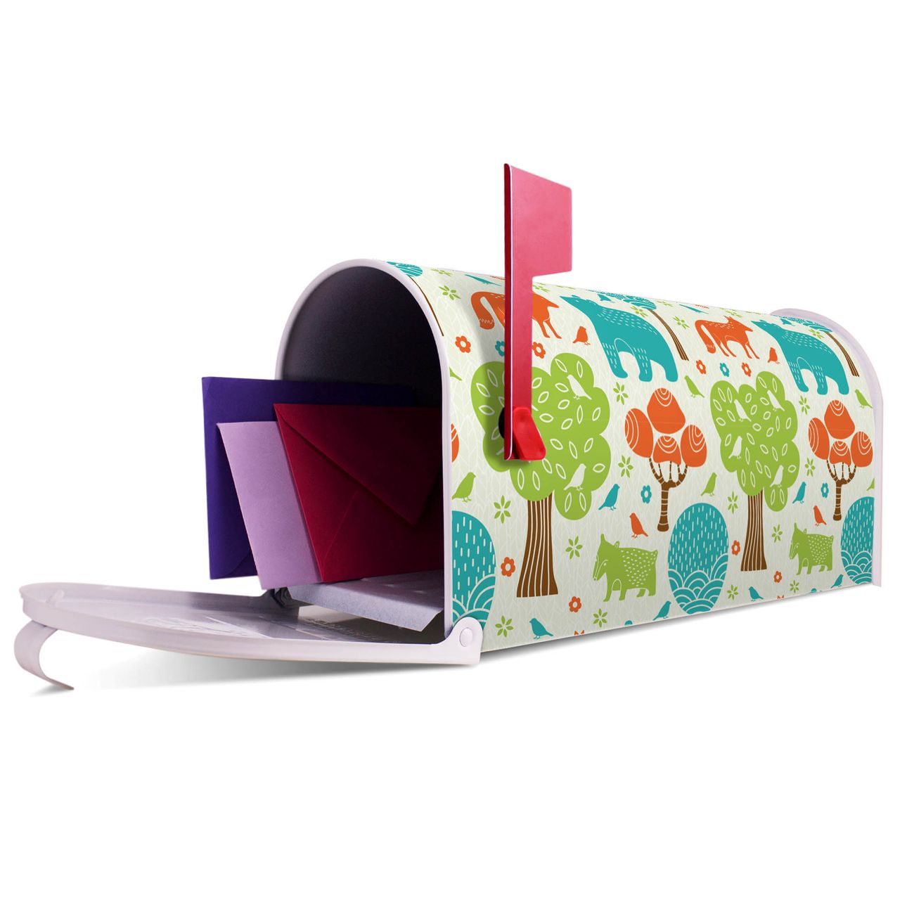 Unser amerikanischer Briefkasten mit dem Motiv Fuchs Bär Wald hat ein sehr ansprechendes und ausgefallenes Design, ist in der Grundfarbe weiß, grün oder schwarz erhältlich. Damit entlocken Sie Ihren Nachbarn und dem Postboten immer wieder ein Lächeln. Die Mailbox ist ein Original Import aus Mississippi USA und wird von unserer kleinen Manufaktur in Sachsen von Hand veredelt. Die US-Mailbox bietet ausreichend Platz auch für große Sendungen, eine Fahne die Ihnen Post anzeigt, wetterfestes und äußerst stabiles Material - so macht Post empfangen Freude.