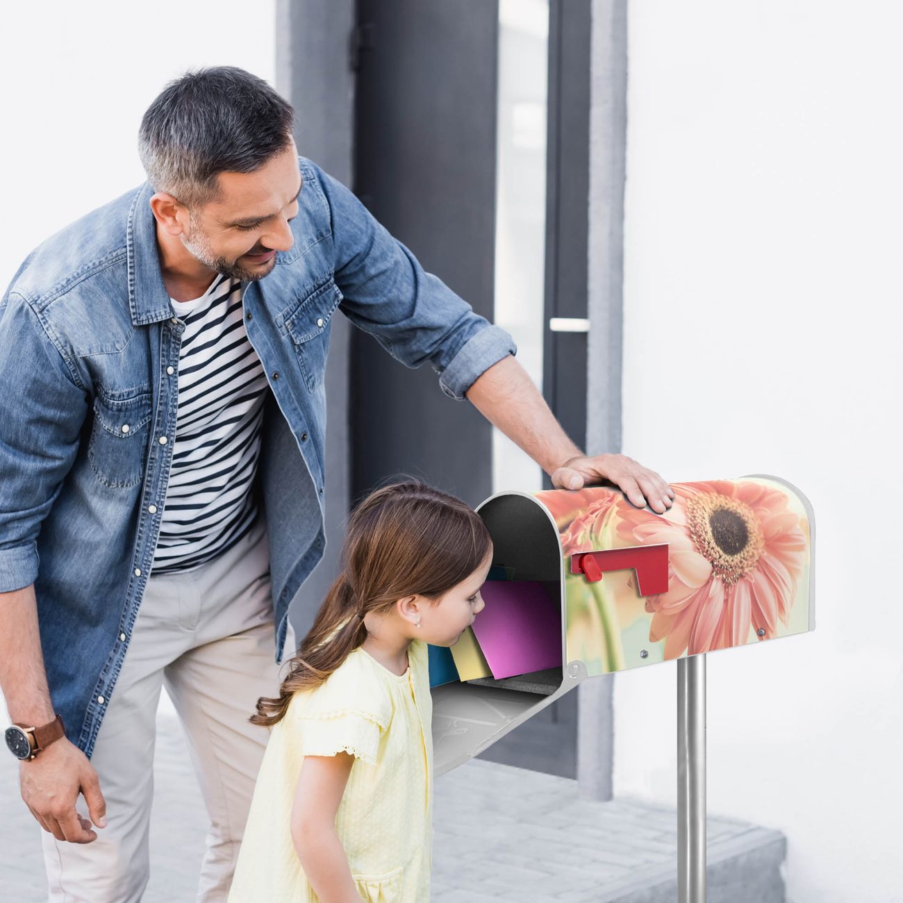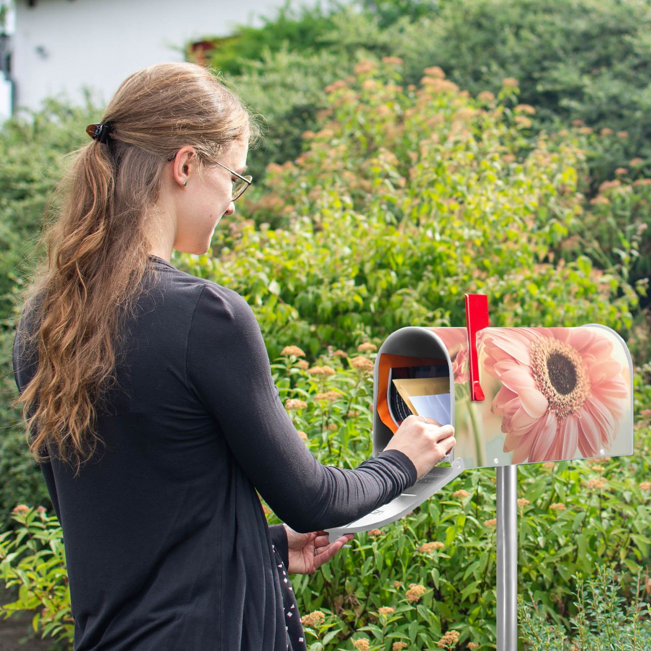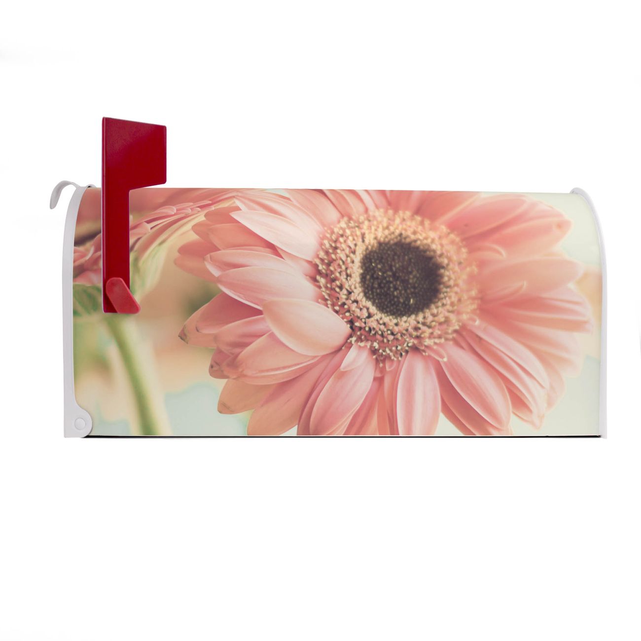 Unser amerikanischer Briefkasten mit dem Motiv Fünf Gerbera hat ein sehr ansprechendes und ausgefallenes Design, ist in der Grundfarbe weiß, grün oder schwarz erhältlich. Damit entlocken Sie Ihren Nachbarn und dem Postboten immer wieder ein Lächeln. Die Mailbox ist ein Original Import aus Mississippi USA und wird von unserer kleinen Manufaktur in Sachsen von Hand veredelt. Die US-Mailbox bietet ausreichend Platz auch für große Sendungen, eine Fahne die Ihnen Post anzeigt, wetterfestes und äußerst stabiles Material - so macht Post empfangen Freude.