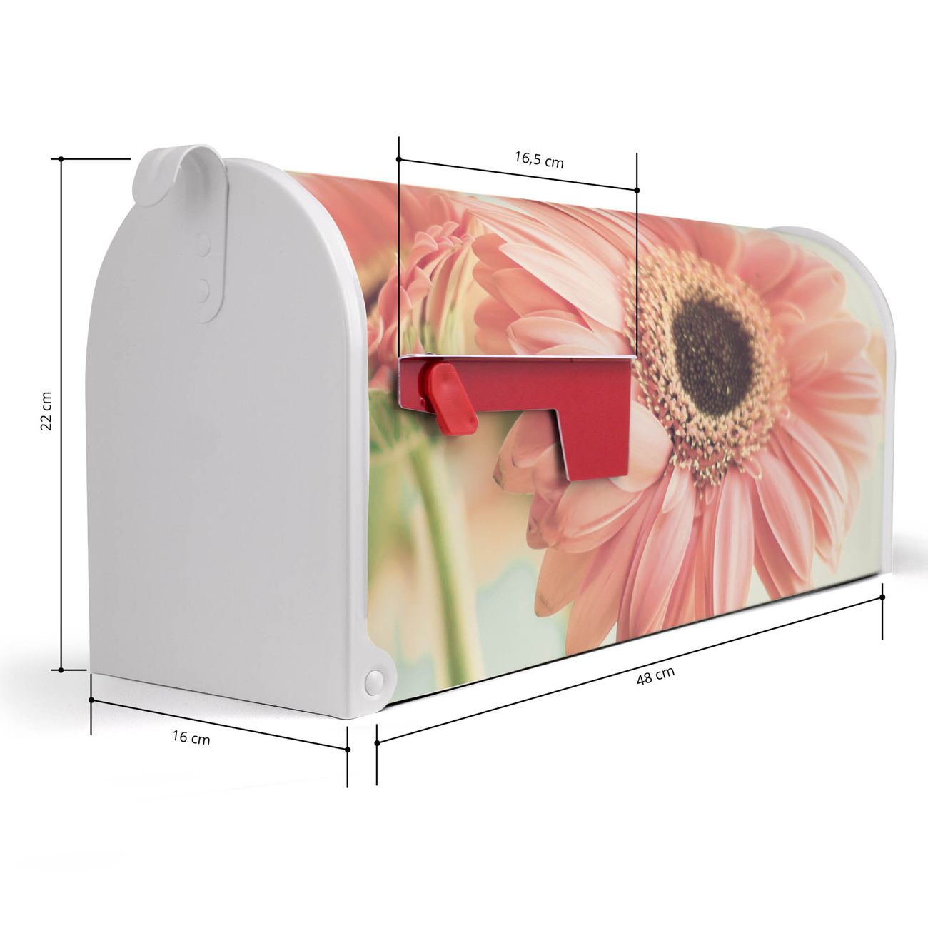 Der amerikanische Briefkasten von banjado mit Fünf Gerbera Motiv bietet Ihnen ausreichend Fassungsvermögen, um große A4 Sendungen und Zeitschriften zu empfangen. Die typisch amerikanische rote Fahne zeigt Ihnen an, wenn Sie Post erhalten haben. Die US-Mailbox besteht aus verzinktem Stahlblech welches lackiert wurde und ist 48 x 22 x 16 CM (BxHxT) groß. Die Folie mit Motiv Fünf Gerbera besteht aus einer wetter- und UV-resistenten Folie, die mit einem Schutzlaminat überzogen ist, sodass die US Mailbox zusätzlich vor Kratzern geschützt ist. An der Unterkante sind 4 Löcher je Seite um die Mailbox, typisch amerikanisch, an einem Holzpfahl oder einem Zaun zu befestigen. Auf Wunsch können Sie bei uns den passenden Standfuß oder die passende Wandhalterung kaufen um die US-Mailbox sicher zu befestigen. Wir bieten Ihnen ebenfalls Namensschilder, bereits beschriftet oder frei zu beschriften, und verschiedene selbst gestaltete Bitte-Keine-Werbung-Aufkleber.