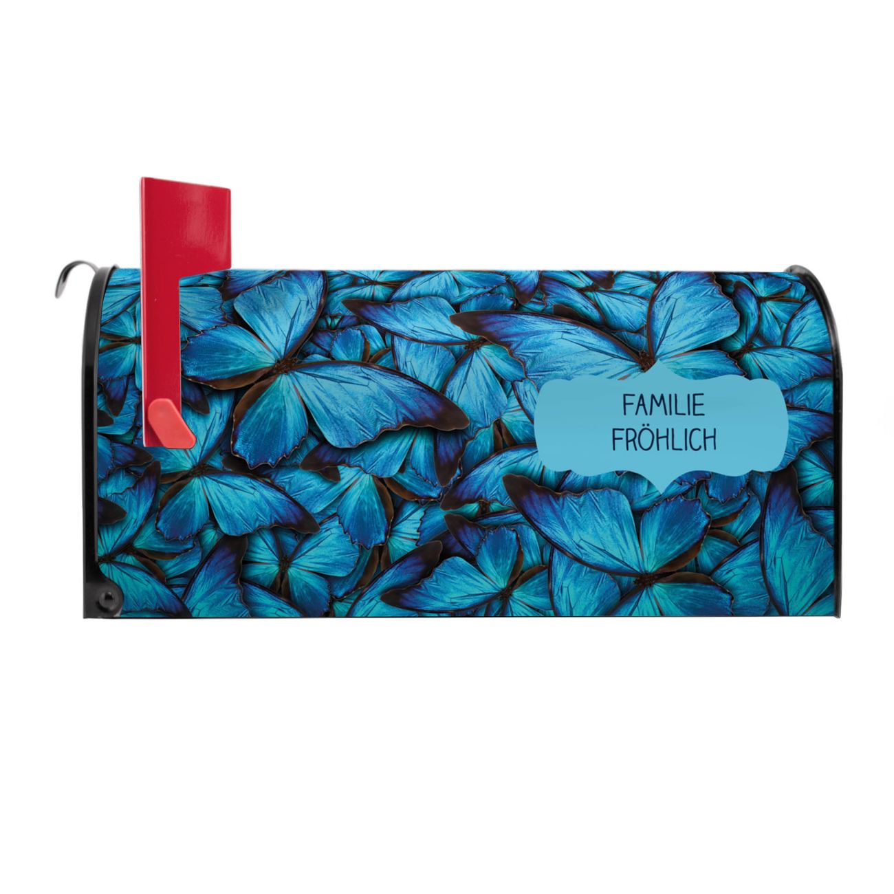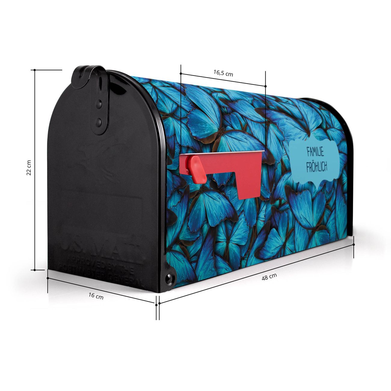 Der amerikanische Briefkasten von banjado mit Fürstliche Falter Motiv bietet Ihnen ausreichend Fassungsvermögen, um große A4 Sendungen und Zeitschriften zu empfangen. Die typisch amerikanische rote Fahne zeigt Ihnen an, wenn Sie Post erhalten haben. Die US-Mailbox besteht aus verzinktem Stahlblech welches lackiert wurde und ist 48 x 22 x 16 CM (BxHxT) groß. Die Folie mit Motiv Fürstliche Falter besteht aus einer wetter- und UV-resistenten Folie, die mit einem Schutzlaminat überzogen ist, sodass die US Mailbox zusätzlich vor Kratzern geschützt ist. An der Unterkante sind 4 Löcher je Seite um die Mailbox, typisch amerikanisch, an einem Holzpfahl oder einem Zaun zu befestigen. Auf Wunsch können Sie bei uns den passenden Standfuß oder die passende Wandhalterung kaufen um die US-Mailbox sicher zu befestigen. Wir bieten Ihnen ebenfalls Namensschilder, bereits beschriftet oder frei zu beschriften, und verschiedene selbst gestaltete Bitte-Keine-Werbung-Aufkleber.